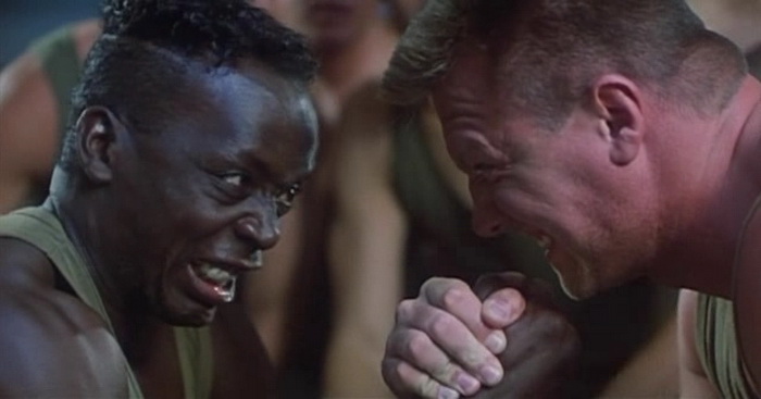 L’action est mal repartie, essentiellement présente lors de l’introduction et sur la dernière demi-heure. Une grosse partie du film est dédiée à l’entrainement de la Légion Étrangère. On les voit s’entrainer, passer diverses épreuves, faire des petits séjours en prison, se divertir, … Mais lorsque l’action se lance, on est dans quelque chose qui fait clairement sortir Invincible de la masse de séries B burnées mais interchangeables qui ont vu le jour dans les années 85/95 à Hong Kong. Cette action est intense, explosive, avec entre autres une scène de guerre pure et dure où ça mitraille dans tous les sens et où ça balance beaucoup de grenades. Blacky Ko aime les effets pyrotechniques et ça se sent jusque dans le long et réellement excellent gunfight final, qui vaut à lui seul le visionnage du film, comme on en faisait beaucoup dans les actionneurs HK de l’époque, à deux contre 50, où le maitre mot est « bourrinage intensif ». Il y a pas mal de cascades comme on aurait pu s‘en douter avec Blacky Ko, des cascades qui font parfois bien mal avec du mobilier et surtout bon nombre de vitres qui sont explosées, et des cascadeurs, mais aussi parfois même les acteurs eux-mêmes, qui semblent se faire bien mal. On se demande même parfois si les vitres contre lesquelles ils sont balancés ne sont pas en vrai verre tant le résultat à l’écran semble réel. Il suffit de voir la scène où la tête de Blacky Ko est projetée contre une fenêtre pour réellement se poser la question. Niveau casting, on est sur une belle brochette de têtes connues du cinéma de Hong Kong, certains dans des petits rôles, avec pour une fois un Danny Lee qui n’interprète pas un policier. Mais ce qui ressort, c’est qu’une majorité des acteurs est en surjeu total, en particulier les nombreux gweilos présents au casting. Il suffit de regarder la moindre scène dans laquelle apparaissent Billy Blanks ou Stefanos Miltsakakis (Le Grand Tournoi, Best of the Best 2) pour comprendre qu’on leur a juste demandé de bander les muscles, d’avoir l’air crispé et de gueuler fort. Ça accentue encore plus le côté bourrin assumé d’Invincible.