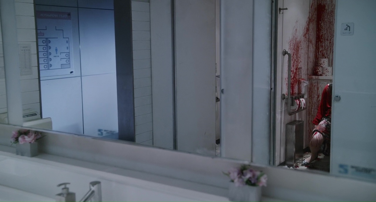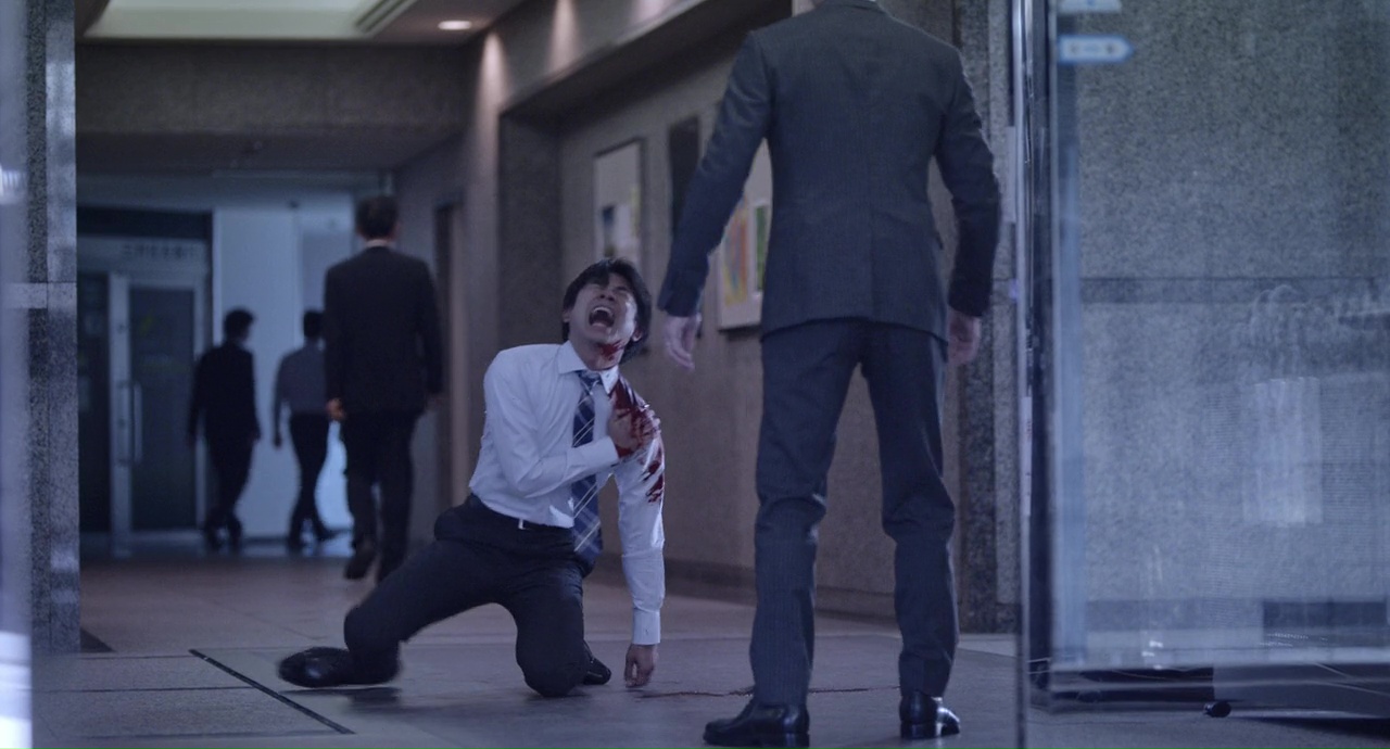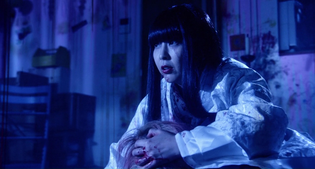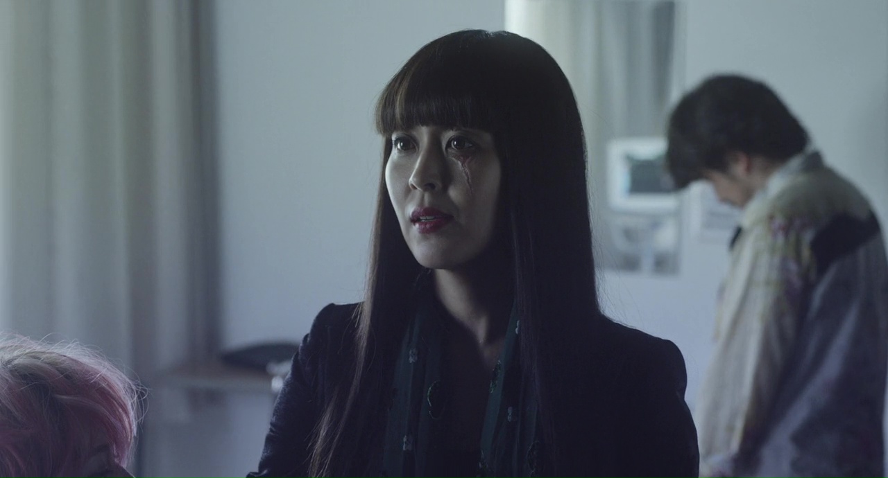 C’est bien beau tout ça, mais c’est longuet. Même si accessoirement, cela donne un côté surprenant quand quelque chose d’étrange se produit, lors d’une banale journée au bureau, où l’on averti Hideko que quelqu’un le demande à l’accueil, pour parler de… Chisa. Sa fille pas encore née. Un levé de sourcil plus tard de ma part, et là, surprise, Kuru n’est pas un film qui recule devant ce qu’il veut nous raconter, devant ce qu’il veut nous montrer, même si pour ça, il aura fallut endurer 20 minutes peu palpitantes. Du coup quand le rouge apparaît à l’écran, et par rouge, je veux parler de sang, de manière abondante hein, pas la petite coupure lorsque l’on se coupe avec une feuille de papier, ça surprend. Ça réveille même. Et à partir de là, Kuru m’a déjà beaucoup plus emballé. Sans être parfait bien entendu. Déjà car le mal était fait avec cette première partie longuette, et ensuite parce que le style de Nakashima, unique donc, nous donne par moment des images uniques, marquantes, il sait filmer c’est indéniable, mais que par moment, son style en fait également un peu trop… Jusqu’à saturation ? Peut-être. Donc, dans le fond, Kuru, c’est un film assez banal, avec un esprit un brin (beaucoup ?) méchant qui en a après une famille. Hideki, en bon père de famille (ce qu’il n’est pas, mais ça le film n’hésitera pas à nous le faire savoir), va tout de suite demander de l’aide. Et c’est là qu’une multitudes d’autres personnages entrent dans le récit. Nozaki (Okada Junichi), son amie Makoto (Komatsu Nana), puis par la suite, sa sœur Kotoko (Matsu Takako), puis tout un paquet d’exorcistes et chamans en tout genre. Vont-ils parvenir à se débarrasser de cet esprit qui n’en fait qu’à sa tête et n’hésite pas à mordre jusqu’au sang ses victimes ? Pour cela, il faudra tenir durant les 2h14 du métrage. Qui ma foi passent plutôt bien une fois la longue introduction passée. Nakashima, qui coécrit l’adaptation, se refuse même un vrai personnage principal la plupart du temps, donnant donc son quart d’heure ensanglanté… euh de gloire à chacun d’entre eux, et pouvant donner un minimum de substance à chacun d’entre eux.