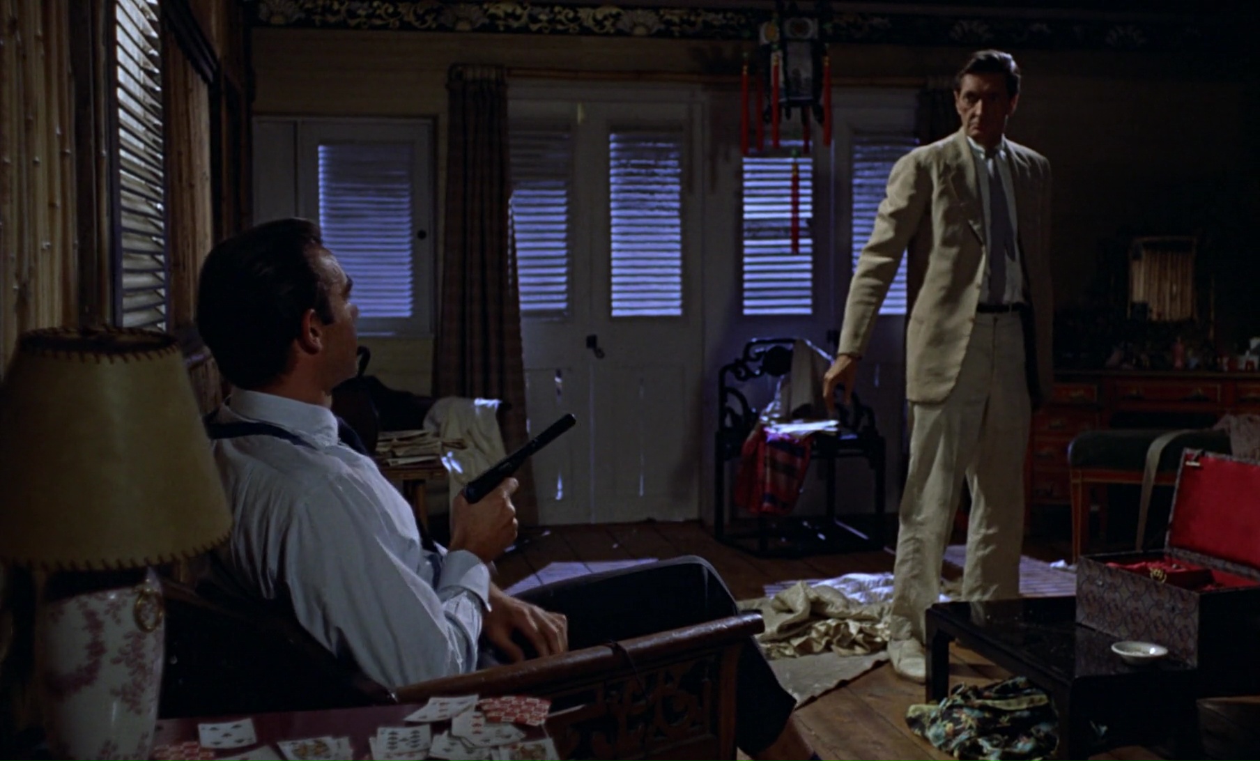 Je n’ai jamais été un fan de James Bond, n’ayant jamais lu un des romans de Ian Flemming par exemple. Mais je ne vais pas le nier, si je ne suis pas fan, j’apprécie certaines des aventures de James Bond, comme Goldeneye par exemple, ou encore Casino Royale, deux films d’ailleurs réalisés par Martin Campbell. Et en revoyant Goldeneye récemment, je me suis dis qu’en fait, la question d’être fan ou pas ne se posait pas, puisque sur les 24 opus existants (ou par là, avec les non officiels), je n’avais pas du en voir plus de 10. Ce que certains qualifieront comme une erreur dans ma cinéphilie. Du coup, c’est parti, sans plus attendre, j’ai décidé de me regarder absolument tous les opus de la saga, par ordre chronologique. Et le premier est donc ce Dr No (juste Dr No en VO), premier opus de l’agent Britannique datant de 1962, et donc avec Sean Connery, premier interprète de l’espion. Est-ce que le film allait me séduire malgré son âge (57 ans tout de même) ? C’était possible, certains de mes films favoris datent des années 60, ou même avant. Allais-je devenir fan de l’agent 007 ? Pas si sûr. Est-ce que la chose a bien vieillie ? Assurément pas. Dr No, s’il possède par certains aspects un charme, et s’il a assurément amené quelque chose de nouveau au cinéma, avait déjà des défauts à la base, mais l’âge n’a pas joué en sa faveur. D’ailleurs c’est simple, je ne sais pas forcément par où commencer avec ce Dr No. Du coup, commençons par ce qui fonctionne. Car avant que l’on ne vienne me dire « non mais tu ne peux pas le critiquer, c’est normal que des choses sont datées c’est un vieux film », ou encore « non mais il a inventé les clichés, mais ça ne l’était pas à l’époque », je dois dire que j’ai trouvé la mise en scène plutôt correcte, cherchant toujours le meilleur moyen de livrer un produit généreux, et ce dés le début.