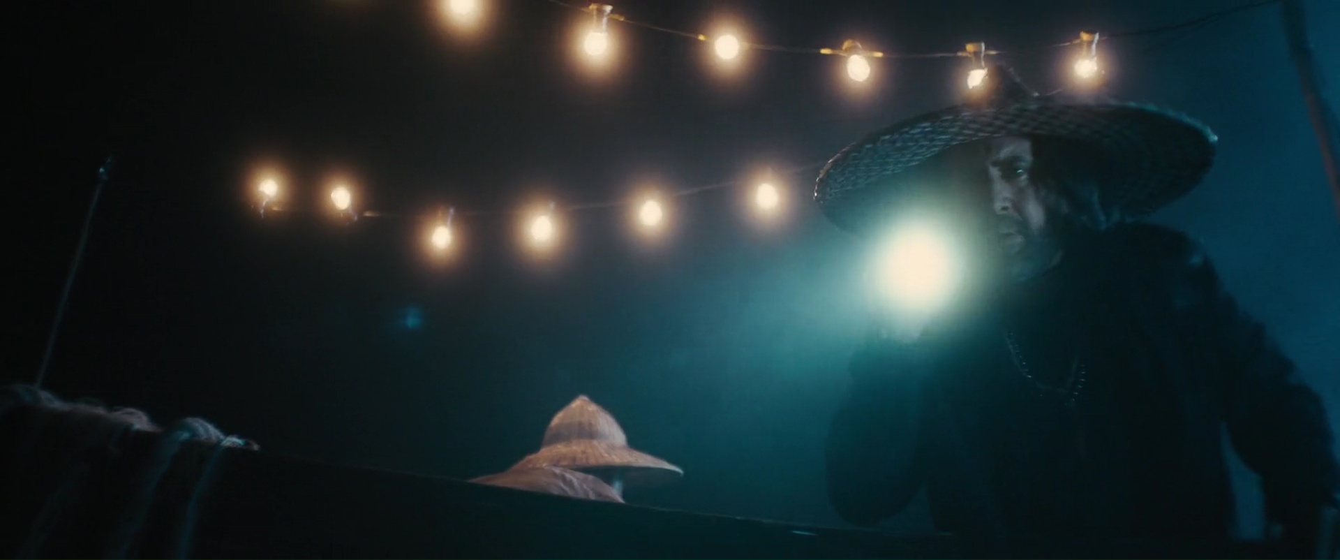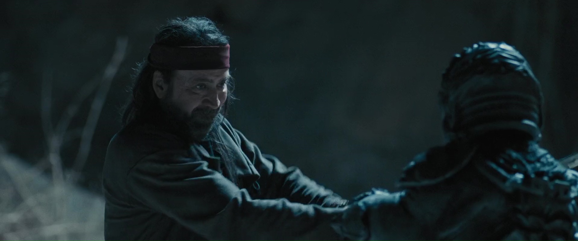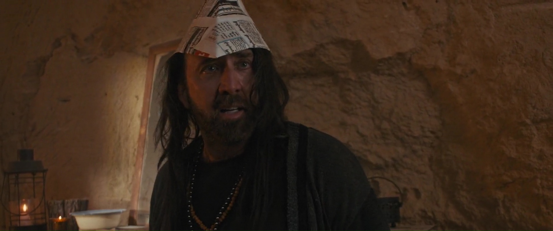 Le héros pour contrer les méchants aliens ? Alain Moussi, au départ cascadeur dans un nombre considérable de films, mais également acteurs dans des séries B d’action, en espérant sans doute percer un peu plus. Bon pas de bol pour lui, niveau jeu d’acteur et expressions, ce n’est pas encore ça, il est inexpressif tout le long du film, même lorsqu’il apprend que son père vient de mourir devant ses yeux. Mais c’est ça la voie du guerrier il parait, rester impassible quoi qu’il arrive (comment ça je lui cherche des excuses). On lui met pas mal d’acolytes dans les pattes, certains sachant clairement se battre, comme Tony Jaa qui va se faire un plaisir de nous ressortir ses fameux coups de genoux ou de coudes. Mais on aura aussi Frank Grillo, que j’aime beaucoup, mais qui décidemment ne perce pas vraiment. Et bien ce n’est pas avec Jiu Jitsu qu’il percera. Et dans un second rôle au temps à l’écran finalement limité, Nicolas Cage. Heureusement qu’il est là, avec son sabre, ses cheveux longs et surtout, oh oui surtout, son chapeau fait en pliant des journaux… Mais bref, Jiu Jitsu, ça se veut un film d’action, qui enchaîne les affrontements, et du coup forcément, les combattants qui finissent au tapis. À ce niveau là, on ne va pas mentir, le film est généreux, les affrontements sont nombreux, et souvent très longs. Trop même. Car comme je le disais en introduction, le film est généreux, même trop, et s’installe alors une lassitude dans le meilleur des cas (trop d’affrontements qui s’éternisent et se ressemblent tous), ou de longs soupirs dans le pire des cas. Niveau mise en scène et combats donc, c’est généreux. On a droit au combat en plan séquence, à une partie d’un combat en vue subjective, à des plans tournants, des coups bien trouvés, tout ça tout ça. Le souci, c’est que ça veut souvent en faire trop. Le plan séquence, qui met Tony Jaa en valeur, est plombé par des ralentis du plus mauvais effet, par exemple.