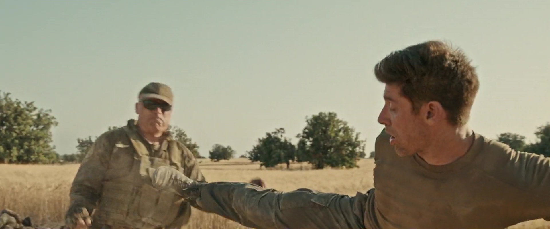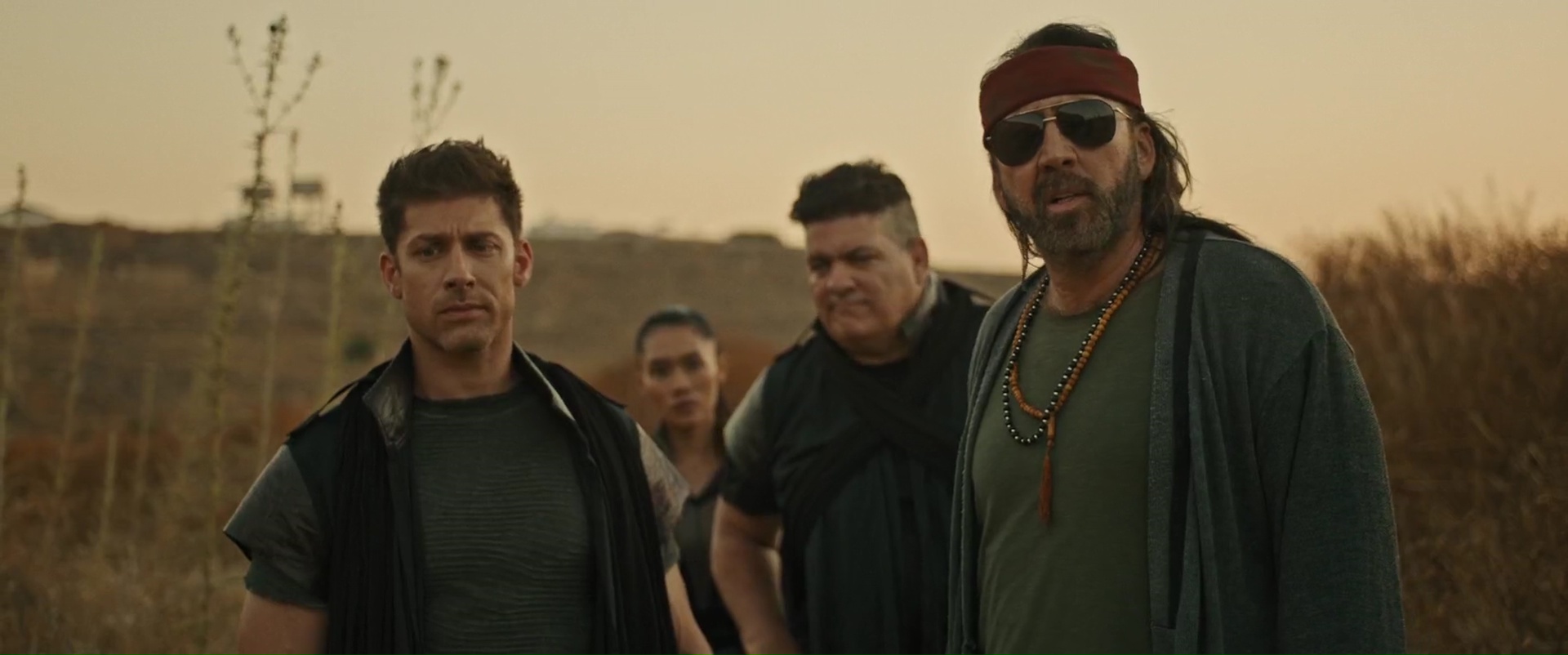 Et l’on arrive du coup forcément au gros défaut du film, qui le fait tour à tour sombrer dans le nanar puis dans le navet, à savoir sa générosité au niveau des effets spéciaux, et donc des CGI. C’est simple, ils son absolument partout, pour un oui ou pour un non. Un coup à rendre impressionnant ? De la poussière numérique au niveau de l’impact. Une lame à rendre dangereuse ? Des reflets numériques sur la lame. Ça parait tout con et discret dis comme ça, mais ce genre d’effets est présent un peu partout dans le métrage, constamment. Si bien qu’à force de vouloir en mettre partout, ça a du totalement bouffer le budget du film, et avec son budget hyper confortable, on a plutôt l’impression d’avoir devant les yeux un produit fauché et cheap. Le design raté et nanar de l’alien ne va pas aider certes, mais tout ce qu’il y a autour (ses armes, la puissance de ces coups, son invisibilité, sa capacité à bouger hyper rapidement) rend l’ensemble encore plus ridicule. Ça aurait pu en faire un excellent nanar, et d’ailleurs parfois on parvient à en rire. Mais parfois, les défauts, que ce soit en rythme, mise en scène ou CGI viennent trop plomber le métrage et le font chuter dans la grotte des navets. Du coup, assurément pas bon, parfois drôle, parfois embarrassant, mais surtout bancal. Un résultat qui ne satisfera pas les amateurs de nanars, ni de Nicolas Cage, même si finalement, son personnage s’avère bien drôle, et donc un des bons points du film.