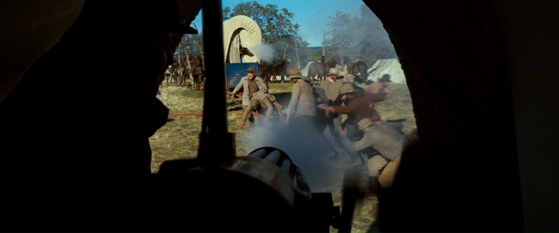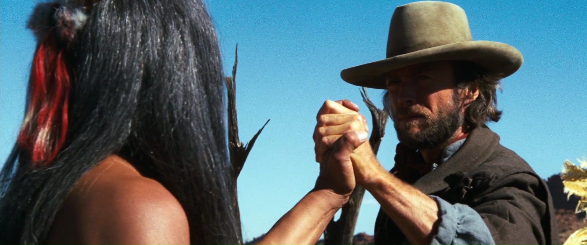 Une sorte de rédemption en quelque sorte. Le métrage se découpe donc clairement en deux parties. La première, faisant plus ouvertement parler la poudre et montrant un personnage violent qui n’hésite pas à tuer de sang froid et à cracher sur les cadavres de ces victimes. En toile de fond ? L’absurdité de la guerre, de la violence se laquelle le pays s’est bâtie, et les trahisons des hommages pour des raisons diverses, et très souvent financières, et ce dés le début lorsque Fletcher, chef de groupe que Josey Wales a rejoint par le passé, passe un pacte avec les Nordistes en leur livrant ses hommes, les sacrifiant ainsi pour sa survie et ses envies personnelles. La première partie, outre la vengeance de Wales, est surtout une fuite en avant, Wales étant traqué, et trainant avec lui un blessé. C’est finalement sa rencontre avec un chef indien par la suite, puis en sauvant un groupe attaqué par des bandits, en particulier la jeune Laura Lee (jouée par Sondra Locke) que Josey Wales va s’humaniser, se trouver de nouveaux buts, se reconstruire également en quelque sorte. Intéressant dans le fond, Josey Wales l’est, mais il l’est aussi dans la forme. Les images sont souvent magnifiques, la mise en scène comme toujours simple mais appliquée, et les acteurs excellents. Même au niveau du scénario, malgré un côté best of qui contient tout ce que le western a à proposer (à part l’attaque de diligence, absente du métrage), sait quand il doit surprendre le spectateur, via l’évolution de son personnage principal. Ainsi, lorsque Josey Wales partira négocier avec un autre groupe d’indien, il surprend, prouvant ainsi la subtilité d’écriture du personnage., son évolution, mais également le message du métrage. Un grand moment, qui parvient donc à surprendre le connaisseur du genre qui s’attend, aussi tardivement dans le métrage, à un nouveau déferlement de violence.