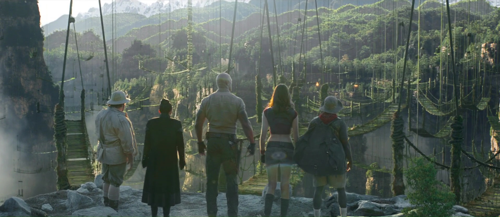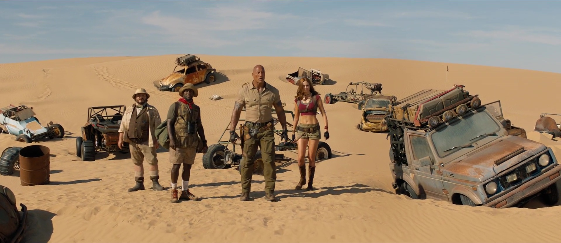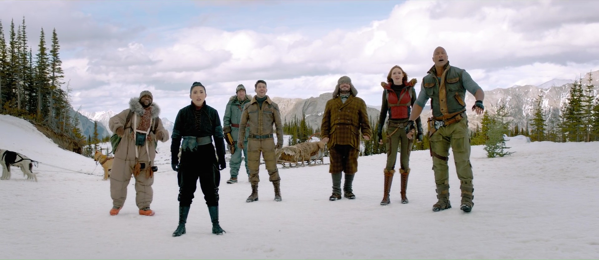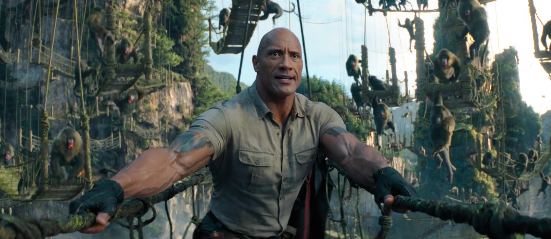 Quel plaisir par exemple de retrouver au départ dans le monde réel ces bons vieux Danny DeVito et Danny Glover, avant de les envoyer également dans le jeu. Ce qui permet moult gags, certes, mais également ce qui permet aux acteurs de se faire grandement plaisir. Si Jack Black jouait par exemple dans le premier film une jeune ado de 17 ans adepte des selfies, ici, Jack Black doit jouer Danny Glover. Quand à Dwayne Johnson, il va devoir jouer Danny DeVito, et on ressent dés les premiers instants que les acteurs se font tous plaisir, et ont pu expérimenter, se lâcher, et improviser, comme le prouve d’ailleurs la bande annonce finale du métrage, proposant un nombre assez grand de plans alternatifs qui ne sont pas dans le dit métrage finalisé. Et c’est ce casting, cette énergie qui va donner de la force à cette suite pourtant assez similaire au précédent. Oui, il y a encore une succession de niveaux, de plus en plus difficiles, où les compétences de tous les personnages vont devoir servir à un moment donné. Du coup, le film ajoute quelques nouveaux points forts et points faibles aux personnages pour ajouter de nouveaux gags, de nouveaux animaux dangereux (des singes), et remplace la jungle par le désert puis les montagnes enneigées. Parfois, il rebondit sur des gags déjà vu dans le précédent, pour les détourner. Ce qui pourrait paraître facile. Et parfois, ça l’est d’ailleurs. Mais pourtant, le plus souvent, ça m’aura fait rire. En fait, voilà, tout en respectant à la lettre le cahier de charge de la suite Hollywoodienne (plus d’action, plus de bruits, plus de fun), le film parvient à être généreux dans tout ce qu’il propose, à alterner anciens gags et nouveaux, et ça a fait mouche. Mieux, sans doute aidé par le budget un poil plus gros, mais les animaux en CGI semblent mieux incorporés aux images, et font un poil moins jeu vidéo. Oui, Jumanji est un jeu vidéo, mais cela n’empêche pas.
