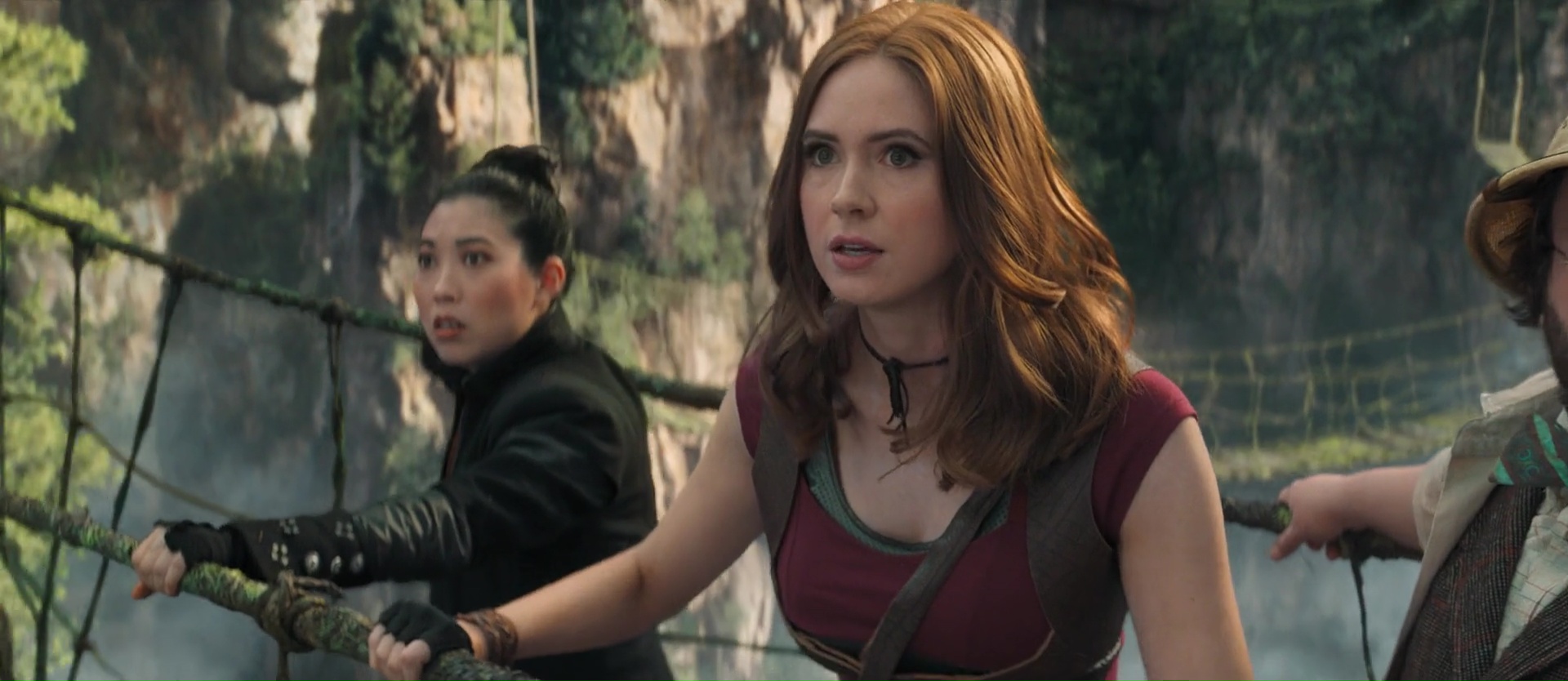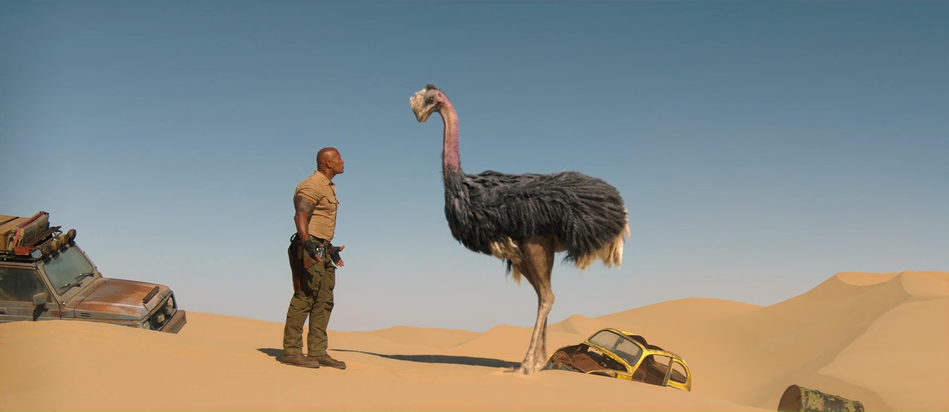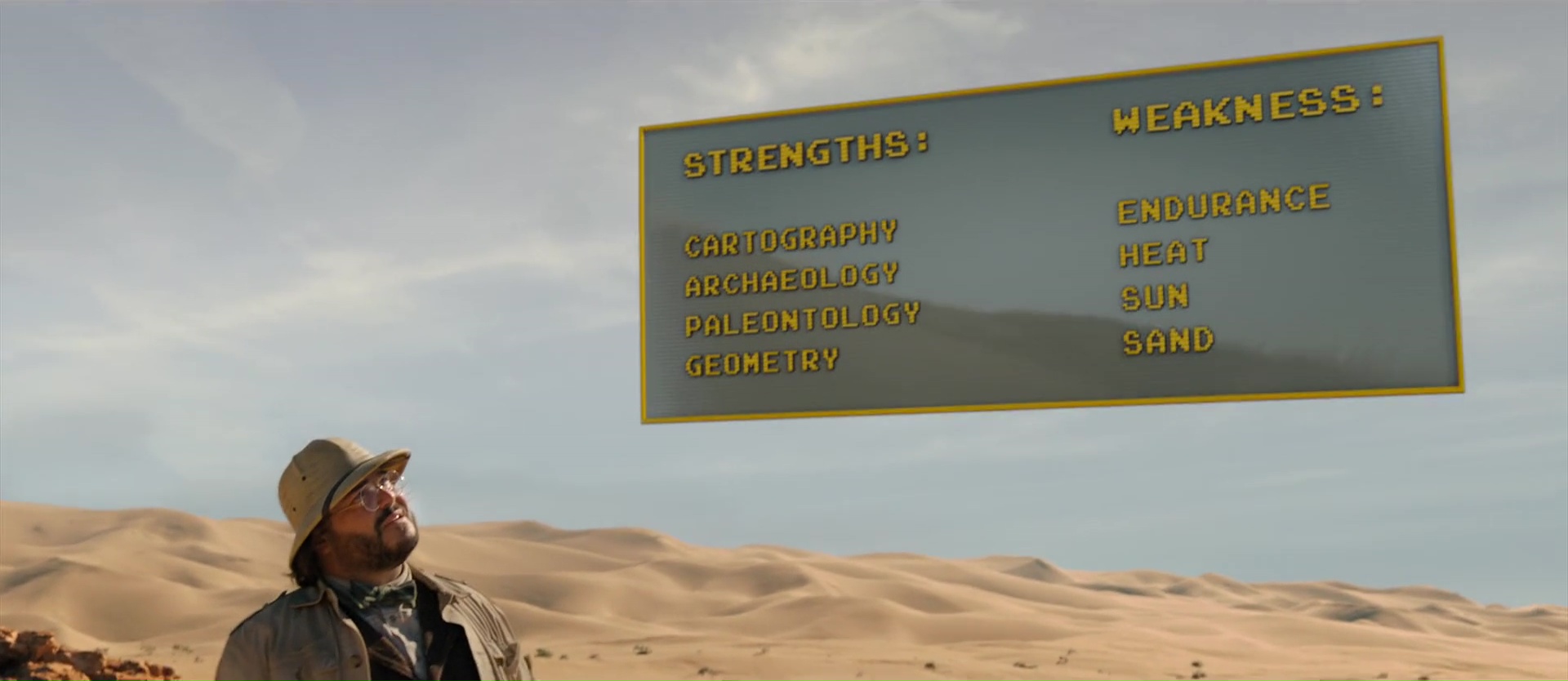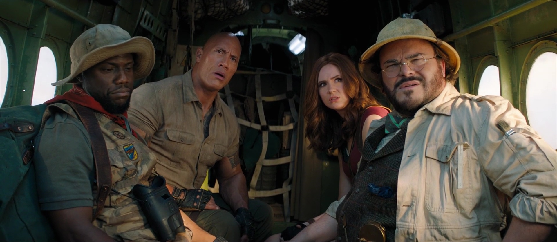 Quel plaisir par exemple de retrouver au départ dans le monde réel ces bons vieux Danny DeVito et Danny Glover, avant de les envoyer également dans le jeu. Ce qui permet moult gags, certes, mais également ce qui permet aux acteurs de se faire grandement plaisir. Si Jack Black jouait par exemple dans le premier film une jeune ado de 17 ans adepte des selfies, ici, Jack Black doit jouer Danny Glover. Quand à Dwayne Johnson, il va devoir jouer Danny DeVito, et on ressent dés les premiers instants que les acteurs se font tous plaisir, et ont pu expérimenter, se lâcher, et improviser, comme le prouve d’ailleurs la bande annonce finale du métrage, proposant un nombre assez grand de plans alternatifs qui ne sont pas dans le dit métrage finalisé. Et c’est ce casting, cette énergie qui va donner de la force à cette suite pourtant assez similaire au précédent. Oui, il y a encore une succession de niveaux, de plus en plus difficiles, où les compétences de tous les personnages vont devoir servir à un moment donné. Du coup, le film ajoute quelques nouveaux points forts et points faibles aux personnages pour ajouter de nouveaux gags, de nouveaux animaux dangereux (des singes), et remplace la jungle par le désert puis les montagnes enneigées. Parfois, il rebondit sur des gags déjà vu dans le précédent, pour les détourner. Ce qui pourrait paraître facile. Et parfois, ça l’est d’ailleurs. Mais pourtant, le plus souvent, ça m’aura fait rire. En fait, voilà, tout en respectant à la lettre le cahier de charge de la suite Hollywoodienne (plus d’action, plus de bruits, plus de fun), le film parvient à être généreux dans tout ce qu’il propose, à alterner anciens gags et nouveaux, et ça a fait mouche. Mieux, sans doute aidé par le budget un poil plus gros, mais les animaux en CGI semblent mieux incorporés aux images, et font un poil moins jeu vidéo. Oui, Jumanji est un jeu vidéo, mais cela n’empêche pas.