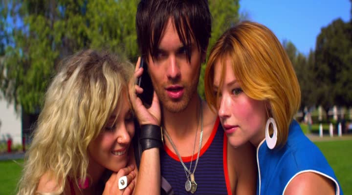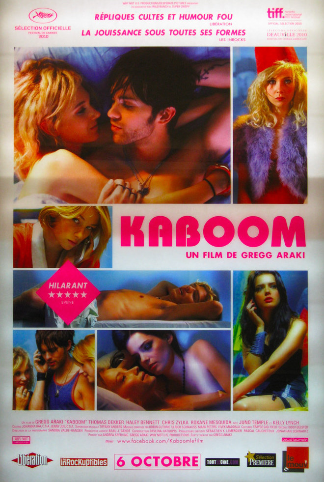 Présenté à Cannes en 2010, Kaboom m’intéressait pour son univers visuel qui semblait un peu barré. Et la majeure partie du temps, j’en ai eu pour mon argent, avec de beaux plans, un univers visuel travaillé et barré, des idées à la pelle, beaucoup d’humour (souvent sur le cul certes)… Le film commence d’ailleurs de manière bien space, avec Smith qui rêve qu’il avance à poil dans un couloir, croisant les personnes qui comptent pour lui, puis deux inconnues, avant de passer une porte mystérieuse où se trouve… une poubelle. Décallé et conservant ce ton tout le long ou presque, Kaboom interpelle par son inventivité, dynamitant ainsi le genre épuisé des comédies pour ado façon American Pie et compagnie. Car oui, ici, on suit Smith, jeune homme de 18 ans à l’université, qui s’interroge sur sa sexualité (il aime les hommes, mais couche aussi avec des femmes), craque pour son coloc hétéro con comme la lune (il est surfeur après tout, et s’appelle Thor…), à une meilleure amie lesbienne qui le traîne en soirée, va sur des plages nudistes et se fait vomir sur les chaussures en soirée. Oui, un jeune typique d’un film pour ado. Sauf que Kaboom décide d’aller plus loin et de contourner les codes du genre pour mieux s’en amuser.