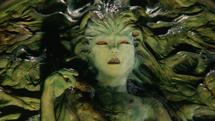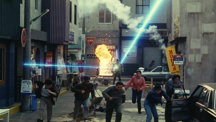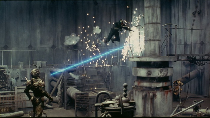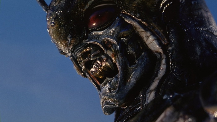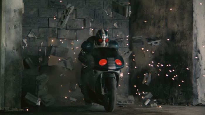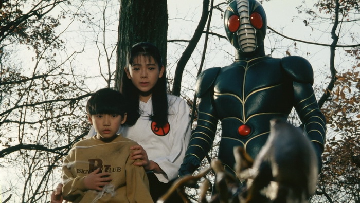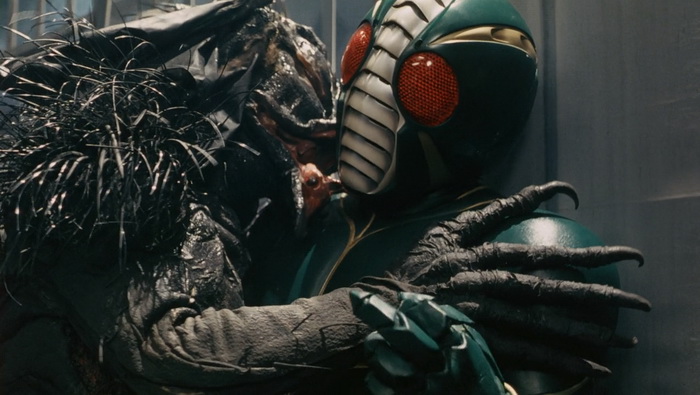 Shin Kamen Rider : Prologue est un gros succès commercial en vidéo et un nouveau film est immédiatement mis en chantier. La Toei s’associe à Bandai, espérant que le succès du film booste les ventes de jouets et inversement. Au départ prévu comme un film de 90min, il est décidé de produire quelque chose de bien plus court, d’environ 50 minutes, pour réduire les risques au box-office, qui sera projeté dans le cadre du Toei Super Hero Fair, un évènement cinématographique qui s’est déroulé de 1993 à 1995 durant lequel trois films Toei Tokusatsu, issus de différentes franchises, étaient présentés en triple programme chaque année. Parmi ceux-là, Kamen Rider ZO de Keita Amemiya qui avait jusque-là réalisé Mirai Ninja (1988), Zeiram (1991) ou encore des épisodes de Jetman (1991) et Kyōryū Sentai Zyuranger (1992), en plus de travailler sur le character design de plusieurs tokusatsu (Spielvan, Metalder, Winspector). Amemiya va clairement amener son style et toute sa folie visuelle se ressent ici, aussi bien dans les décors que dans les costumes, les effets spéciaux, le look global de la chose. Il teste ici tout ce qu’il est possible de tester en termes d’effets spéciaux : CGI, animatronics, marionnettes, latex, stop-motion, incrustations, superpositions d’images, morphing, matte painting, … Amemiya y trouve ici un énorme terrain de jeu et ce Kamen Rider ZO est un régal même pour les plus allergiques au genre, ici bien plus adulte que Bioman ou Power Rangers qui sont souvent la première approche du public à ce genre de divertissement.