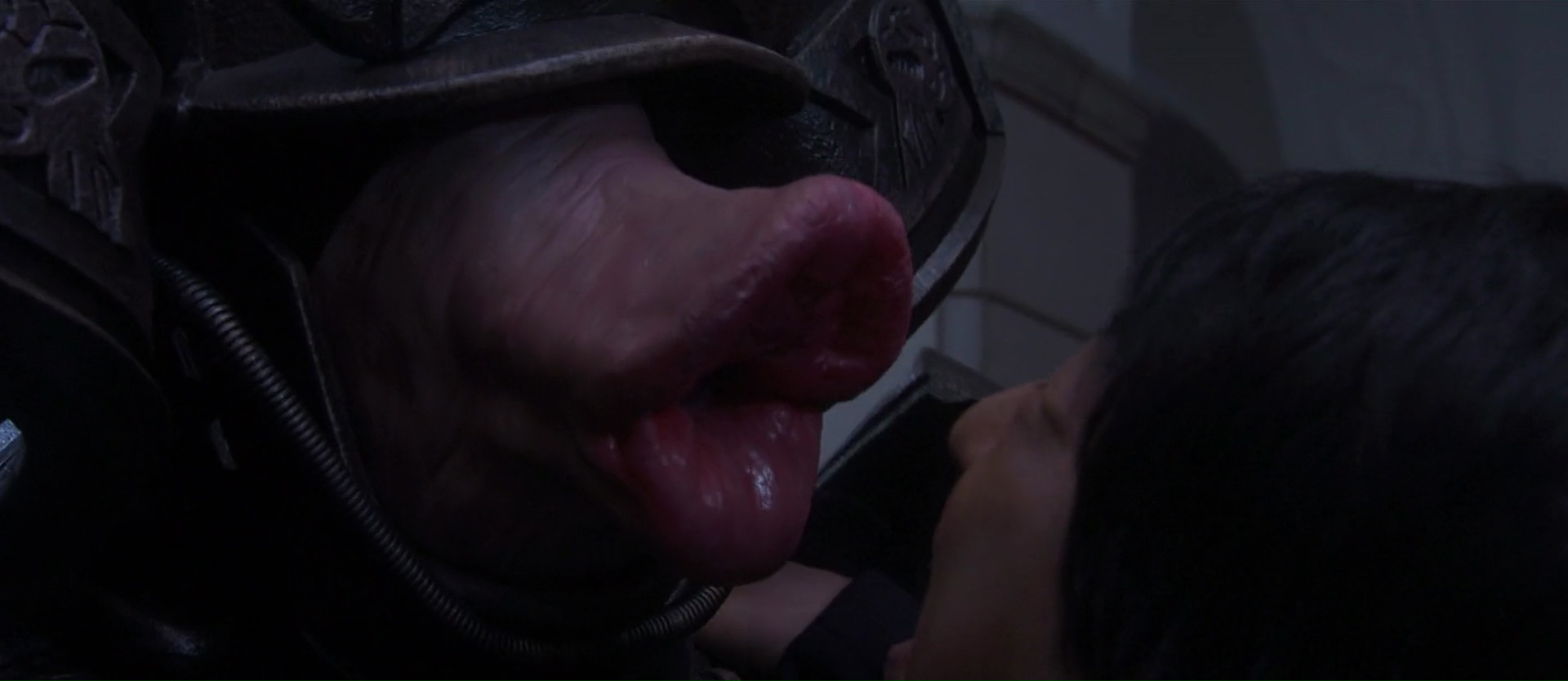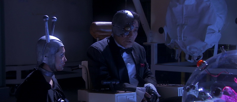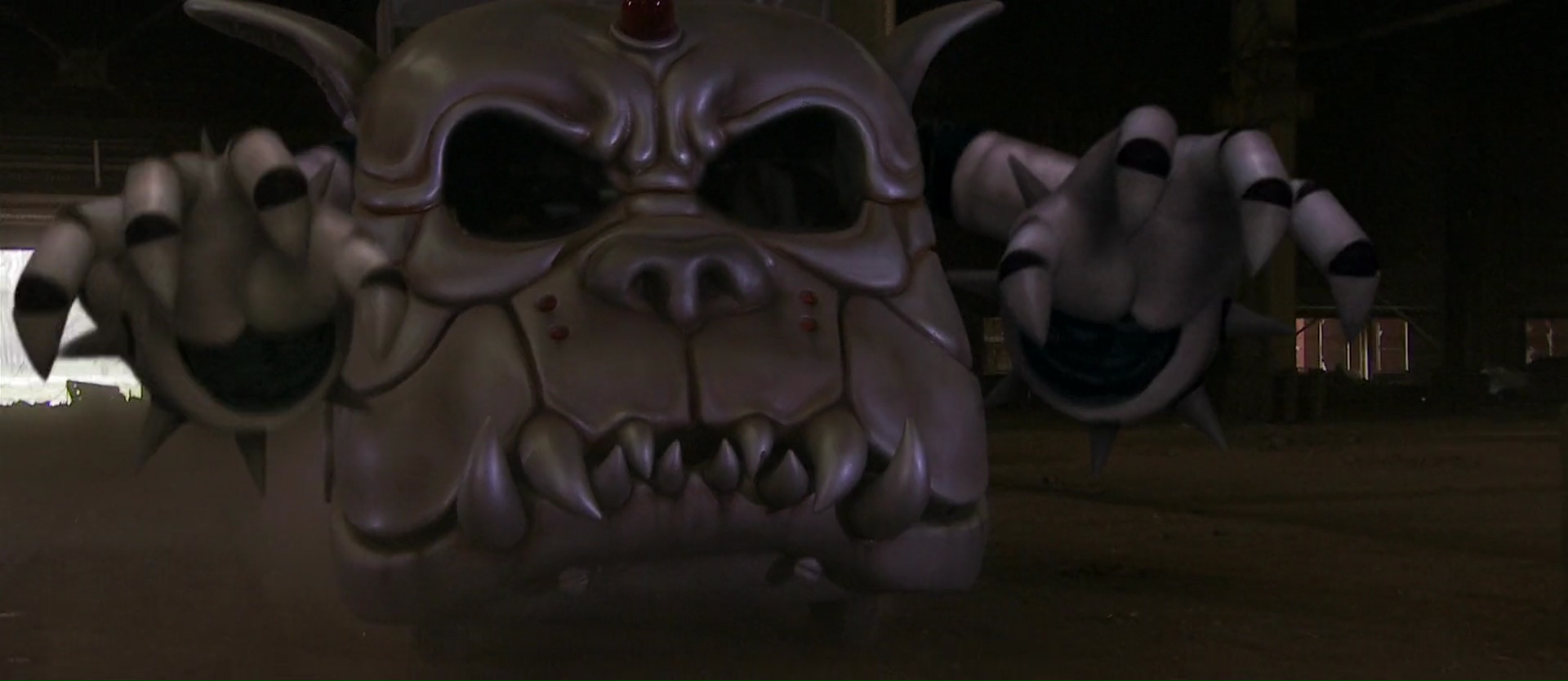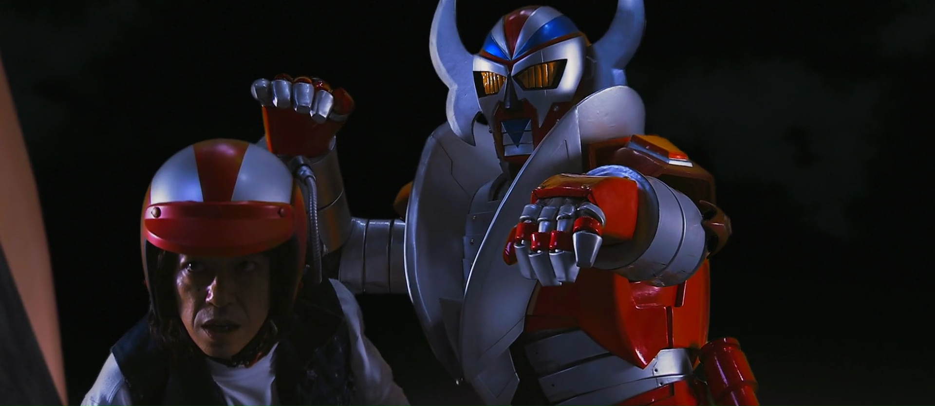 Etonnement, oui. En alliant son style, très limité, avec l’hommage à une série venant d’un genre lui aussi limité en soit, Iguchi a sans doute trouvé pour le coup la formule gagnante. Car on sent, minute après minute, que l’hommage rendu sur pellicule (enfin, sur disque dur, le film étant tourné en numérique hein) est sincère. Et du coup, on reste les yeux ébahis devant notre écran, un peu comme si l’on retombait en enfance, tel un gosse qui savourait alors un spectacle jouissif totalement kitch mais qui s’assume de la première à la dernière minute. Ça ne ment pas sur la marchandise, car dés la scène d’ouverture, nous assistons à l’enlèvement de politiciens par l’organisation Sigma, organisation dirigée par des androïdes, et se servant de robots. Dans le cas de la scène d’ouverture, un robot samouraï. Ça tranche, ça gicle (numériquement malheureusement), ça nous montre des idées bien stupides comme ce robot dont le visage prend la forme d’une bouche géante, le tout avant l’arrivée de notre justicier, notre grand héros, Daimon Yutaka, chevauchant sa fameuse moto, qui peut se transformer en Zaborgar. Oui,c’est limité, c’est kitch, mais c’est généreux, et ça s’assume pour ce qu’il est, en respectant les codes du genre, et la série qu’il adapte. De plus, à l’image d’une série, le film, bien que durant deux heures, est découpé en deux longs chapitres d’une heure chacun, donnant l’impression de regarder deux longs épisodes spéciaux se faisant suite, même si en terme d’intrigue, 25 années séparent les deux parties. Un procédé que malheureusement Iguchi au scénario ne va pas pleinement exploiter. La première partie met clairement l’humour en avant, et les combats. Il faut introduire les personnages, les concepts, multiplier les scènes d’action, les idées débiles, et c’est un pur plaisir tant l’ensemble est fait certes avec respect, mais surtout avec énormément d’humour et de bonne humeur. Daimon et Zaborgar vont affronter des ennemis improbables dans des combats joyeusement kitch, et parfois, débordant aussi de mauvais goût, encore une fois assumé.