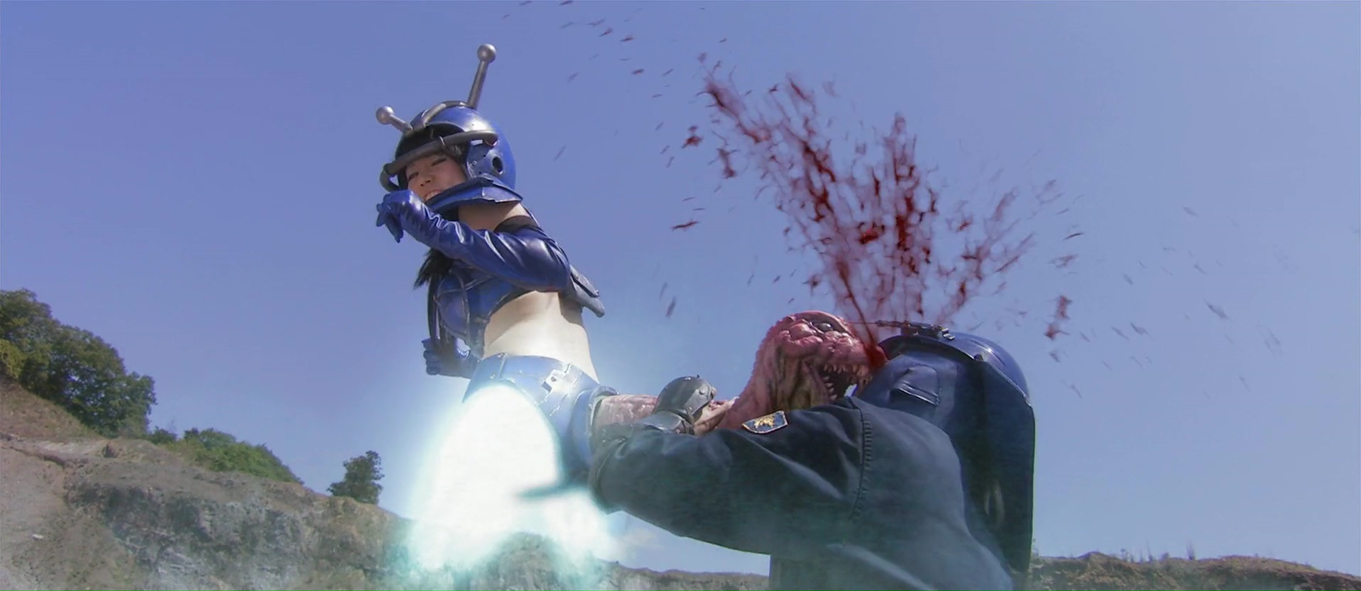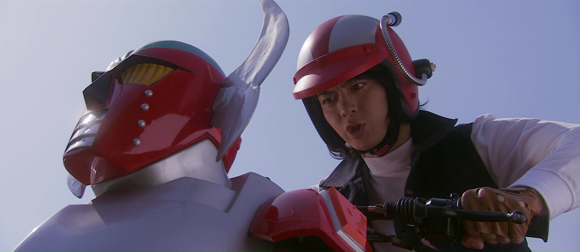 | Iguchi rend hommage aux sentai de la belle époque, avec sincérité et amour. Il parvient à y injecter un peu de sa folie, même si cela reste très gentillet. Mais vu son style limité, c’était sans doute l’homme de la situation. | |