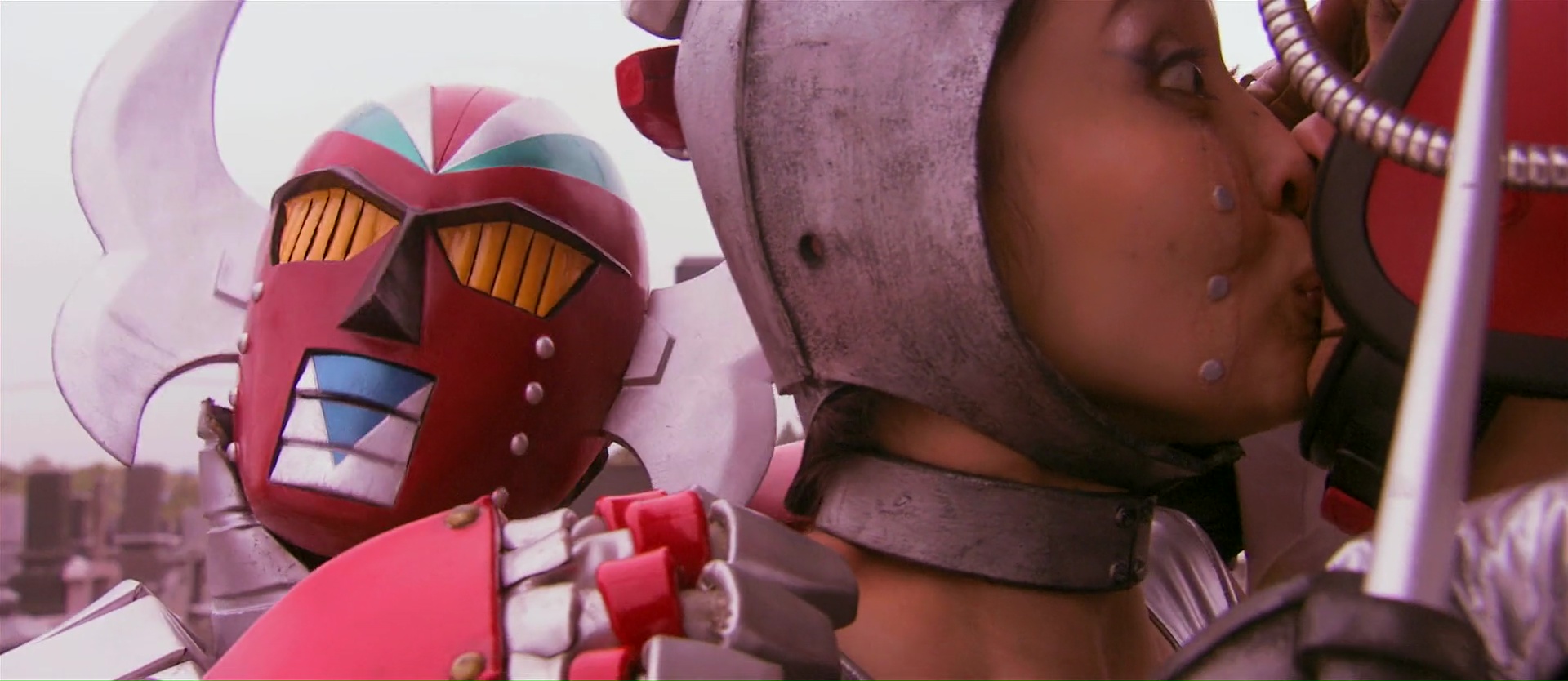 2011 fut une année fort productive pour Iguchi. Trois films tout de même. Tous fauchés certes, mais trois films tout de même, avec l’excellent Tomie Unlimited, le honteusement fun Zombie Ass et ce Karate-Robo Zaborgar dont nous parlons en ces lignes. Et si je ne suis pas un gros fan d’Iguchi, notamment à cause de sa réutilisation à outrance des mêmes gags de films en films, et surtout celui de ne prendre qu’une seule idée et de l’étaler sur un film d’une heure trente, il faut malgré tout dire que j’en ai vu pas mal de ces métrages. Et ce même avant sa percée à l’international en 2008 avec The Machine Girl. Un film qui aura mis le genre de la comédie gore et du Japon sur le devant de la scène, le temps de quelques années, ce qui aura d’ailleurs permis à pas mal de métrages d’Iguchi et de sa bande de potes de sortir chez nous. Oui, on aura eu l’honteux et juste mauvais Robo-Geisha, les deux titres cités plus haut, et même Dead Sushi… qui est également mauvais. Mutant Girls Squad, réalisé à trois et affreusement gore lui reste inédit, allez comprendre. Mais donc, nous sommes en 2011, et avec la Nikkatsu et le studio Sushi Typhoon, studio qui n’aura finalement duré que quelques films et peu d’années, Iguchi réalise Karate-Robo Zaborgar. Un film finalement assez éloigné des habitudes du studio (pas de gore à outrance), mais pas tant que ça éloigné des habitudes du cinéaste, également scénariste, puisque le film a un ton léger, de l’humour en bas de la ceinture. Mais ce qu’il faut savoir, c’est que le métrage remake en réalité la série Denjin Zaborger de 1970. Une série ayant tenue un peu plus de 50 épisodes. Excellente initiative de la part d’Iguchi d’ailleurs d’avoir animé son générique de fin d’images de la série, afin que l’on puisse comparer. Et on peut le dire, son métrage semble fidèle à 200%, tout en incorporant donc la patte d’iguchi dans le mix. Est-ce que ça marche, car malgré tout, la durée avoisine les deux heures ?