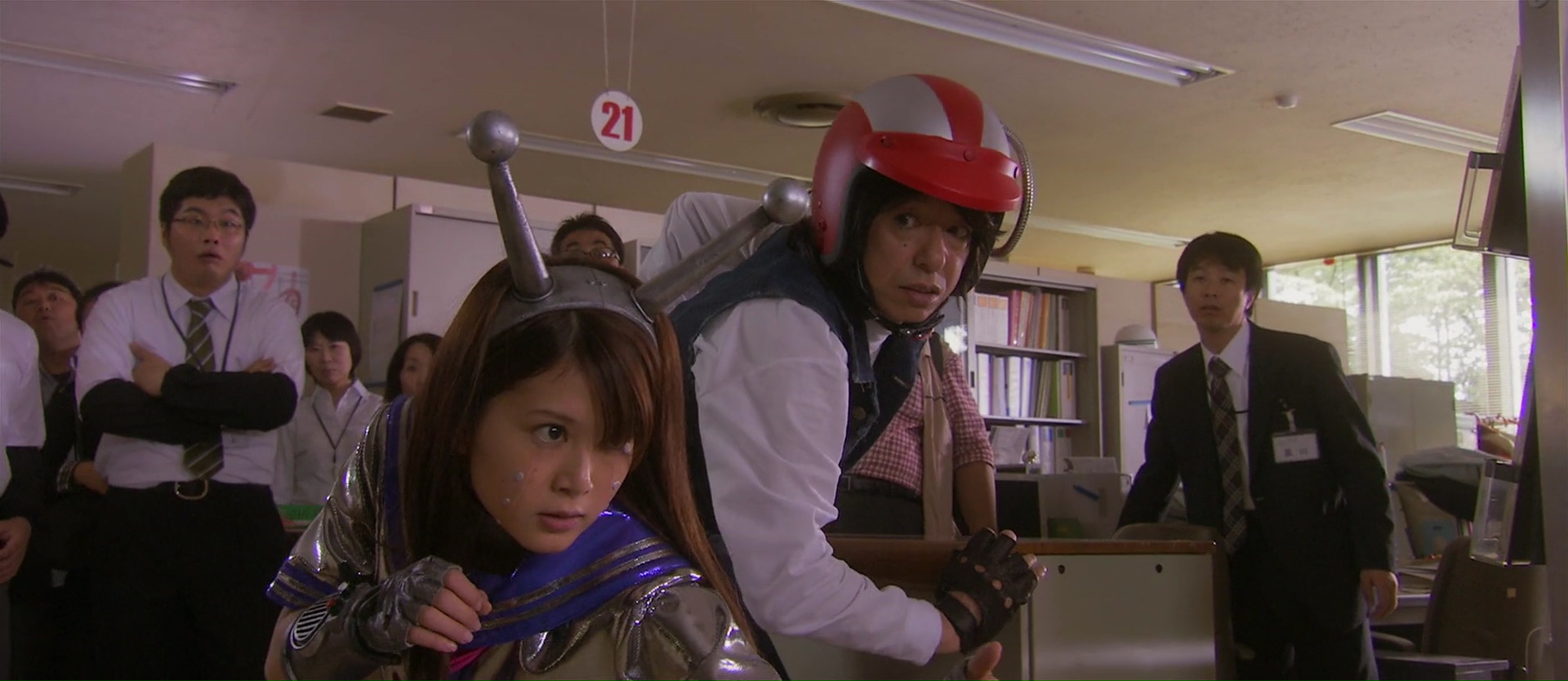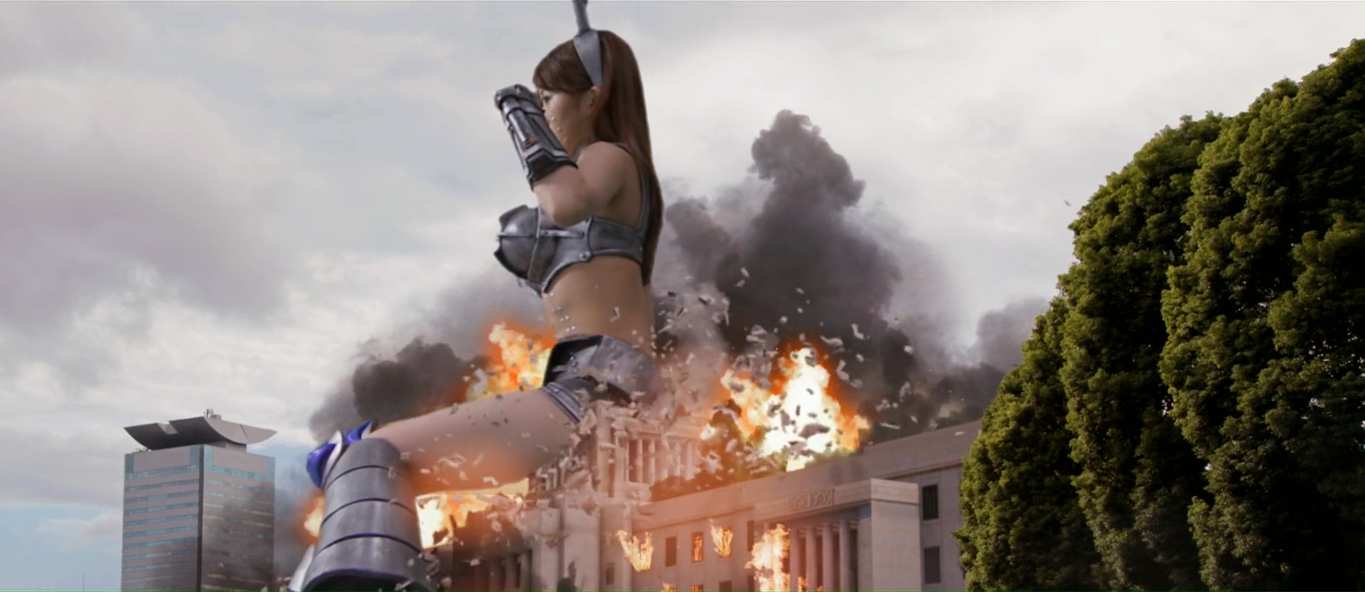 Voir Zaborgar affronter Mecha Fourmi ou la voiture Bouldogue, forcément, ça fait sourire, voir rire. Et en plus, l’humour typique d’Iguchi vient souvent faire irruption dans le film quand on s’y attend le moins. Le combat du cimetière par exemple, avec un plan culotte de robot, et Daimon se prenant carrément une lame dans le front, ça vaut de l’or. Quand l’intrigue reprend pour la seconde partie, 25 ans plus tard, avec notre héros vieillissant et des enjeux plus vastes (la destruction du monde par un robot géant), on jubile. Mais malheureusement Iguchi n’exploite jamais son concept à fond, exception faite de la scène où Daimon cherche un emploi et rencontre le nouvel antagoniste pour la première fois. Une scène hilarante, à coups de jeunes ne respectant plus ce que la génération précédente a fait pour elle, et de héros devant prendre sa piqure d’insuline. Mais passé ce moment, le film retourne sur sa voie toute tracée, multipliant les affrontements, amenant les gags les uns après les autres, et ayant la folie des grandeurs sur la fin en se faisant s’asseoir notre robot géant, ayant les formes agréables à l’œil de Satsukawa Aimi sur le parlement japonais pour le faire exploser. Ce n’est pas profond, mais c’est amusant sur toute la ligne, kitch, et conscient de ce qu’il est, et donc, n’hésite pas à en faire des tonnes pour le plaisir du fan. De la part d’Iguchi, ce n’est pas si mal, on peut même dire qu’il signe une année 2011 plutôt sympathique. De là à dire qu’il signe l’un de ses meilleurs films, il n’y a qu’un pas, puisqu’ironiquement, ça reste toujours aussi limité, les CGI sont toujours foireux, et que, respectueux du genre, Iguchi a sans doute peur de trop s’en éloigner.