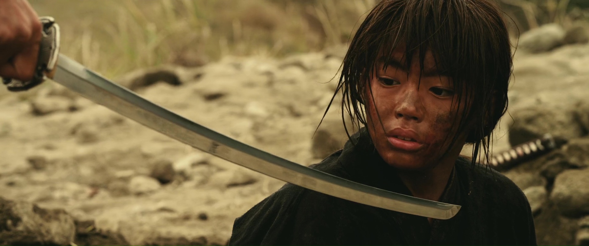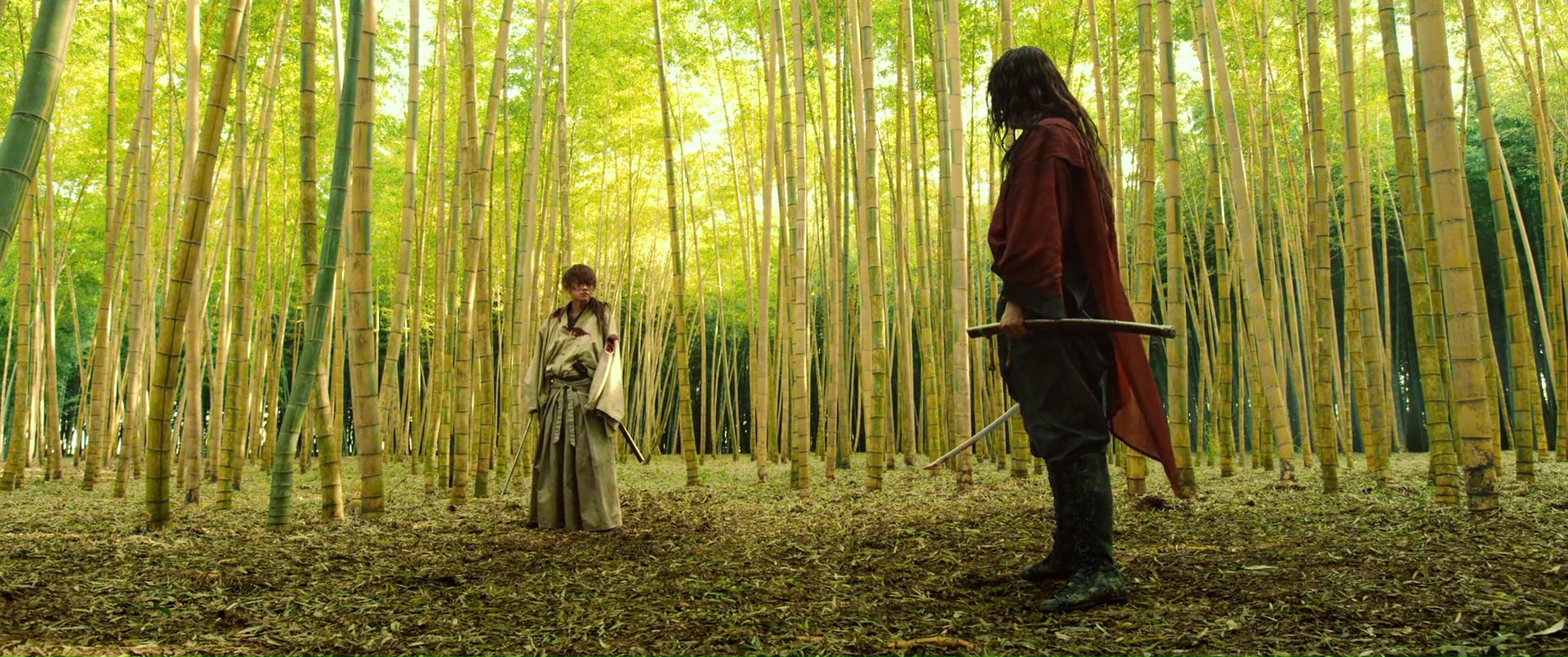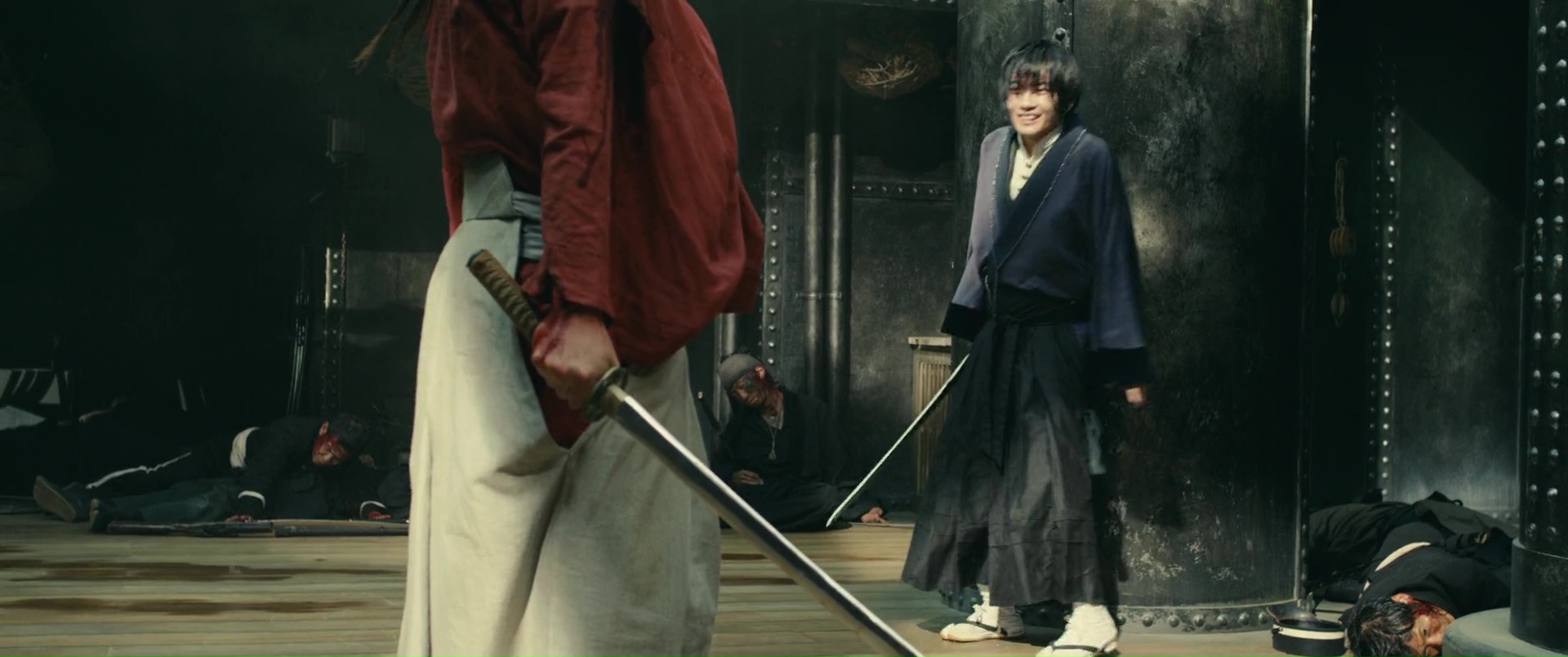 Il est difficile de mettre le doigt sur ce qui peut coincer, car malgré tout, sans mentir, Kenshin 3 clôt parfaitement l’aventure, ne nous laisse aucunement sur un cliffhanger ce coup-ci, nous donne ce que l’on attendait de lui. On retrouve tous nos personnages, même si certains seront toujours en arrière plan. Mais on peut ressentir un déséquilibre un peu fragile entre ses deux parties. Aurait-il fallut raccourcir un peu la première partie pour laisser encore plus de place au spectaculaire ? Ou tout simplement déplacer certaines scènes, quitte à donner au métrage une structure typique de manga ? Vous voyez bien ce que je veux dire, avec ces combats perdu d’avance, qui s’arrêtent alors pour que le héros se rappelle son entrainement, une technique apprise, et finalement, parvienne à vaincre son adversaire ? Peut-être pas, puisqu’au final, les affrontements de sa seconde partie sont longs, techniques, impressionnants, notamment le dernier bien entendu, où Kenshin seul face à Shishio ne suffit pas, et qu’il reçoit l’aide de non pas un, ni deux, mais de trois autres personnages, pour un combat bien chorégraphié à cinq. Et voir des chorégraphies et une technique aussi solide, autant dans les duels à un contre un, dans les combats entre une armée entière (ce que les précédents films mettaient souvent déjà en avant) ou donc là à plusieurs, ça tient déjà du miracle. Mais voilà, prenons cette « conclusion » pour ce qu’elle est. L’ultime opus tout aussi sympathique que les autres, qui trouve sans doute ses limites, mais pas grave, puisqu’en soit, tout se tient, et que le spectateur quitte le spectacle content, avec un divertissement qui a clairement de la gueule et qui ne s’est pas moqué de lui. Et d’ailleurs, cette première partie, plus lente, où l’on en apprend plus sur le passé de Kenshin, et qui va subir un dur entrainement pour espérer gagner la bataille qui s’annonce rude, elle se fait classique dans le genre, mais intéressante, et surtout osée, placée ainsi ici, en début d’épisode final. Bien entendu, à côté, nous suivons les aventures de tous nos autres personnages, avec Kaoru, blessée et toujours en arrière plan malheureusement, tout comme ses amis, qui guérissent doucement de leurs blessures, tandis que Shishio augmente son emprise sur le Japon et le gouvernement, et fait d’ailleurs de Kenshin l’ennemi du gouvernement, l’homme à abattre.