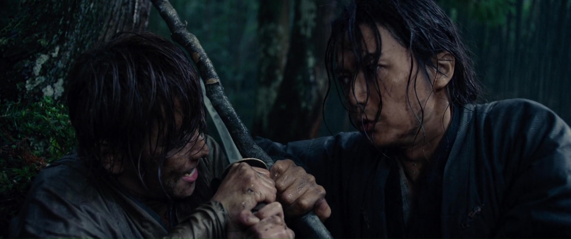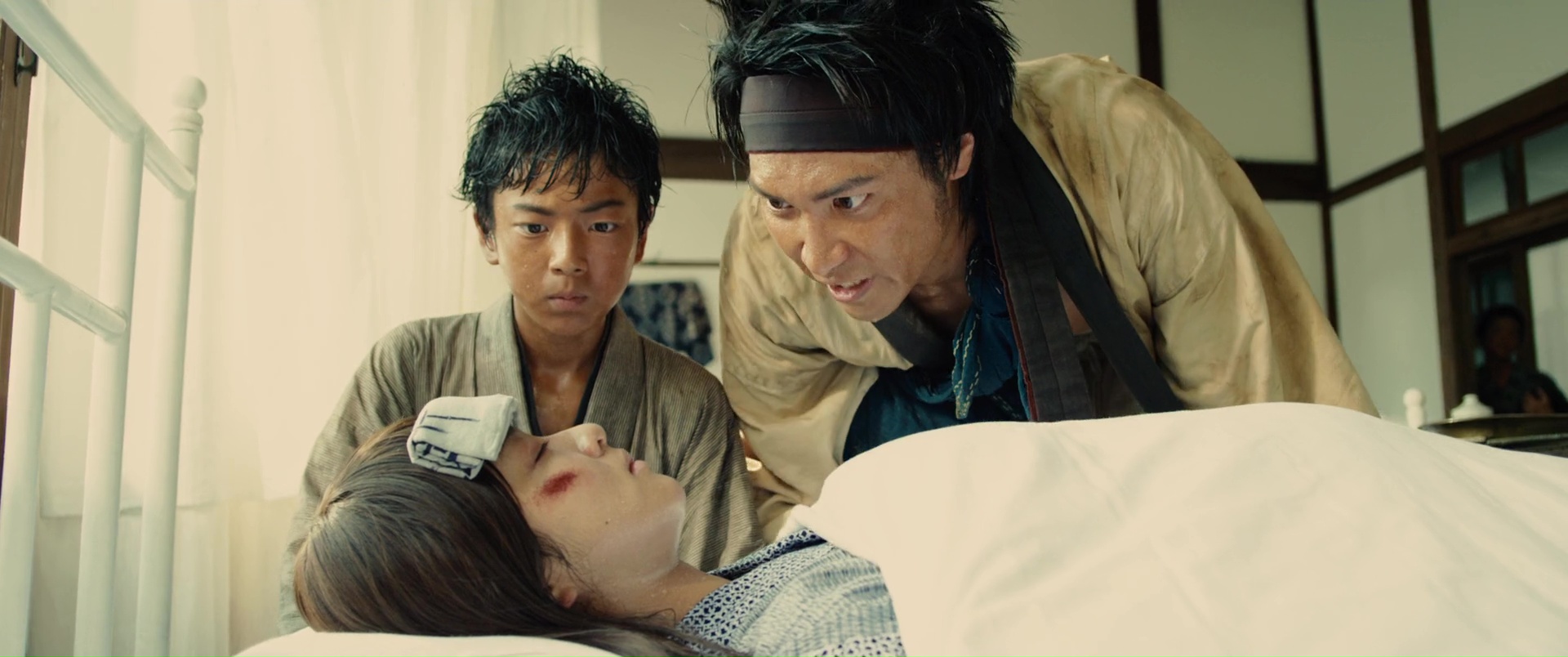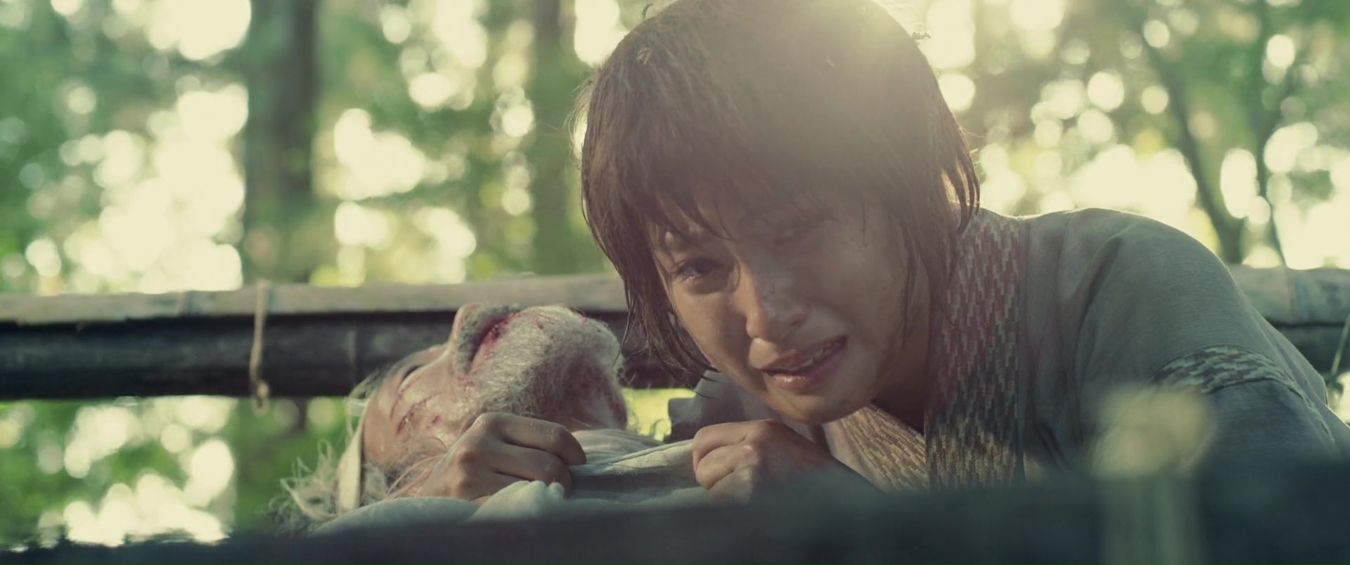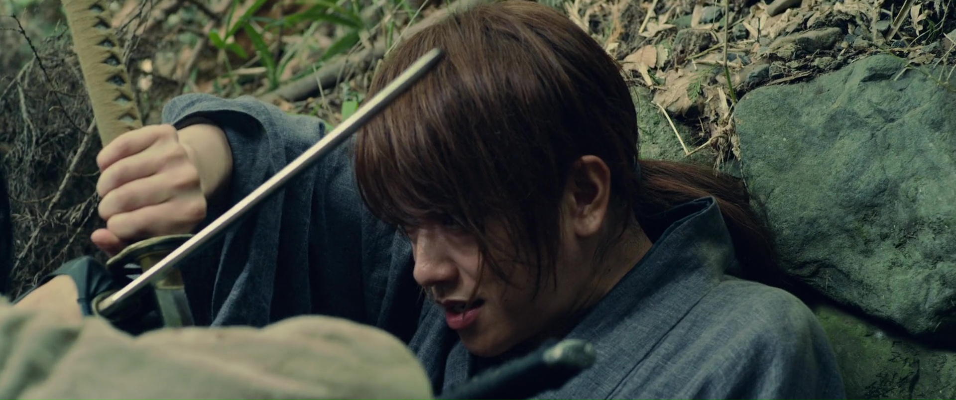 Il est difficile de mettre le doigt sur ce qui peut coincer, car malgré tout, sans mentir, Kenshin 3 clôt parfaitement l’aventure, ne nous laisse aucunement sur un cliffhanger ce coup-ci, nous donne ce que l’on attendait de lui. On retrouve tous nos personnages, même si certains seront toujours en arrière plan. Mais on peut ressentir un déséquilibre un peu fragile entre ses deux parties. Aurait-il fallut raccourcir un peu la première partie pour laisser encore plus de place au spectaculaire ? Ou tout simplement déplacer certaines scènes, quitte à donner au métrage une structure typique de manga ? Vous voyez bien ce que je veux dire, avec ces combats perdu d’avance, qui s’arrêtent alors pour que le héros se rappelle son entrainement, une technique apprise, et finalement, parvienne à vaincre son adversaire ? Peut-être pas, puisqu’au final, les affrontements de sa seconde partie sont longs, techniques, impressionnants, notamment le dernier bien entendu, où Kenshin seul face à Shishio ne suffit pas, et qu’il reçoit l’aide de non pas un, ni deux, mais de trois autres personnages, pour un combat bien chorégraphié à cinq. Et voir des chorégraphies et une technique aussi solide, autant dans les duels à un contre un, dans les combats entre une armée entière (ce que les précédents films mettaient souvent déjà en avant) ou donc là à plusieurs, ça tient déjà du miracle. Mais voilà, prenons cette « conclusion » pour ce qu’elle est. L’ultime opus tout aussi sympathique que les autres, qui trouve sans doute ses limites, mais pas grave, puisqu’en soit, tout se tient, et que le spectateur quitte le spectacle content, avec un divertissement qui a clairement de la gueule et qui ne s’est pas moqué de lui. Et d’ailleurs, cette première partie, plus lente, où l’on en apprend plus sur le passé de Kenshin, et qui va subir un dur entrainement pour espérer gagner la bataille qui s’annonce rude, elle se fait classique dans le genre, mais intéressante, et surtout osée, placée ainsi ici, en début d’épisode final. Bien entendu, à côté, nous suivons les aventures de tous nos autres personnages, avec Kaoru, blessée et toujours en arrière plan malheureusement, tout comme ses amis, qui guérissent doucement de leurs blessures, tandis que Shishio augmente son emprise sur le Japon et le gouvernement, et fait d’ailleurs de Kenshin l’ennemi du gouvernement, l’homme à abattre.