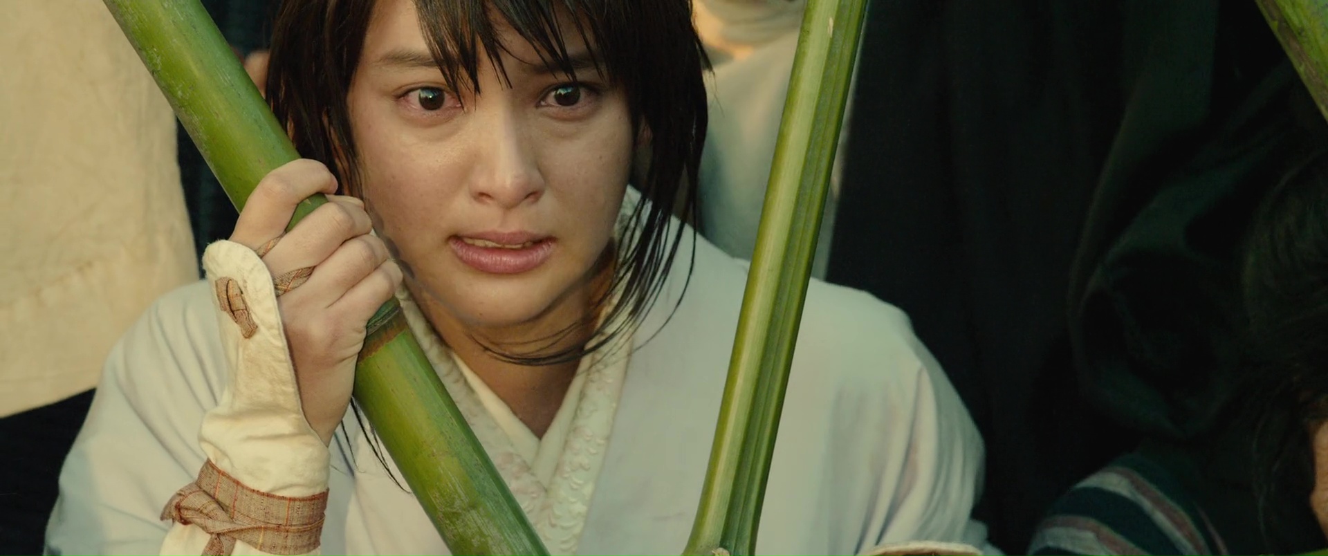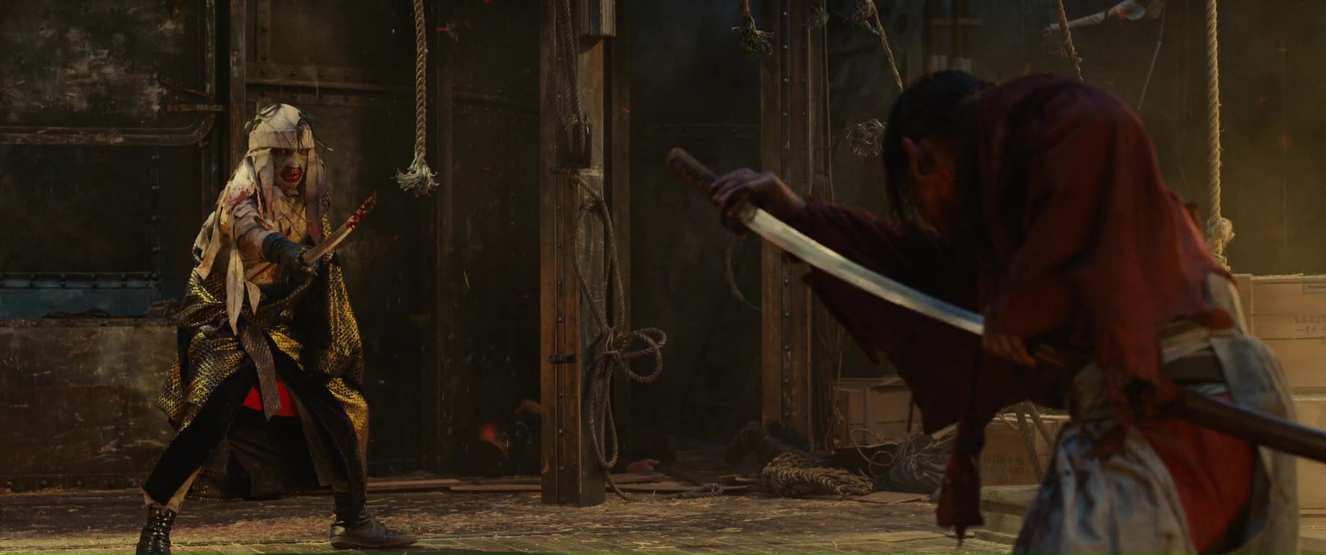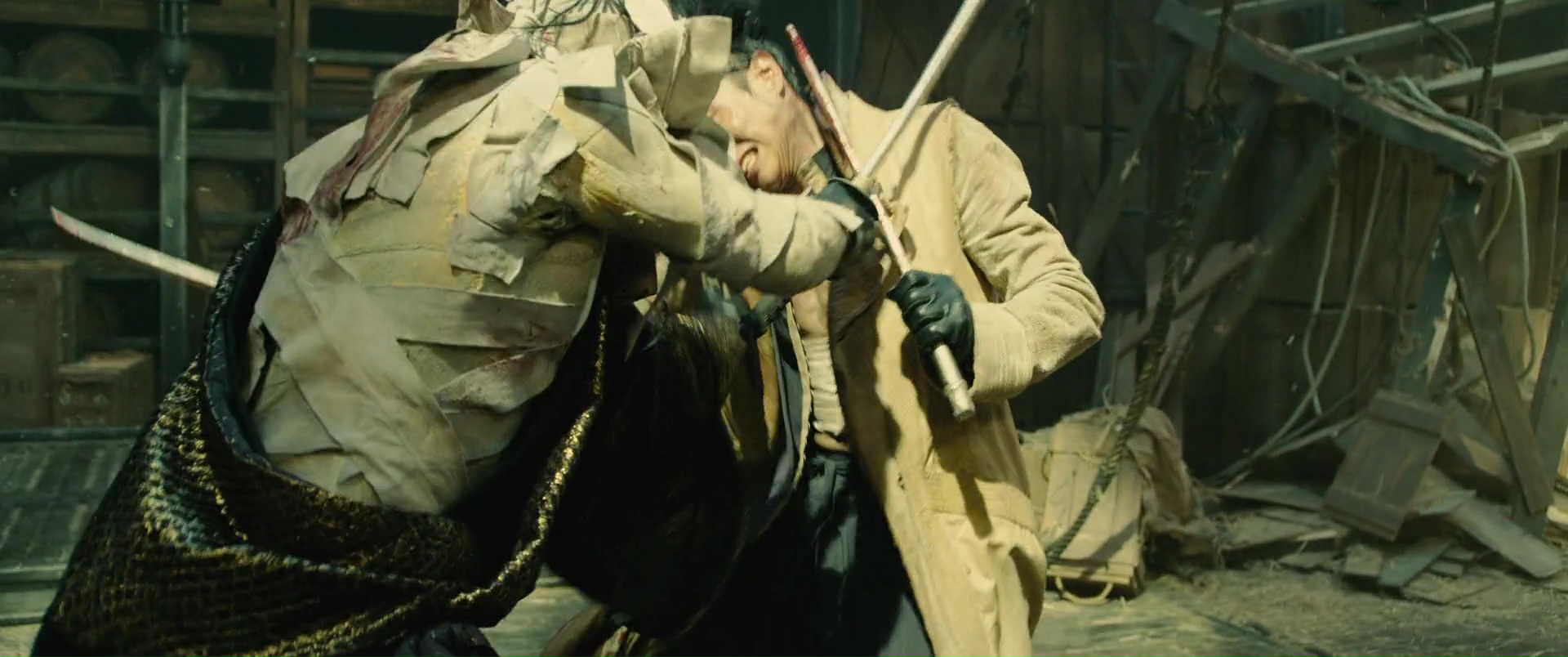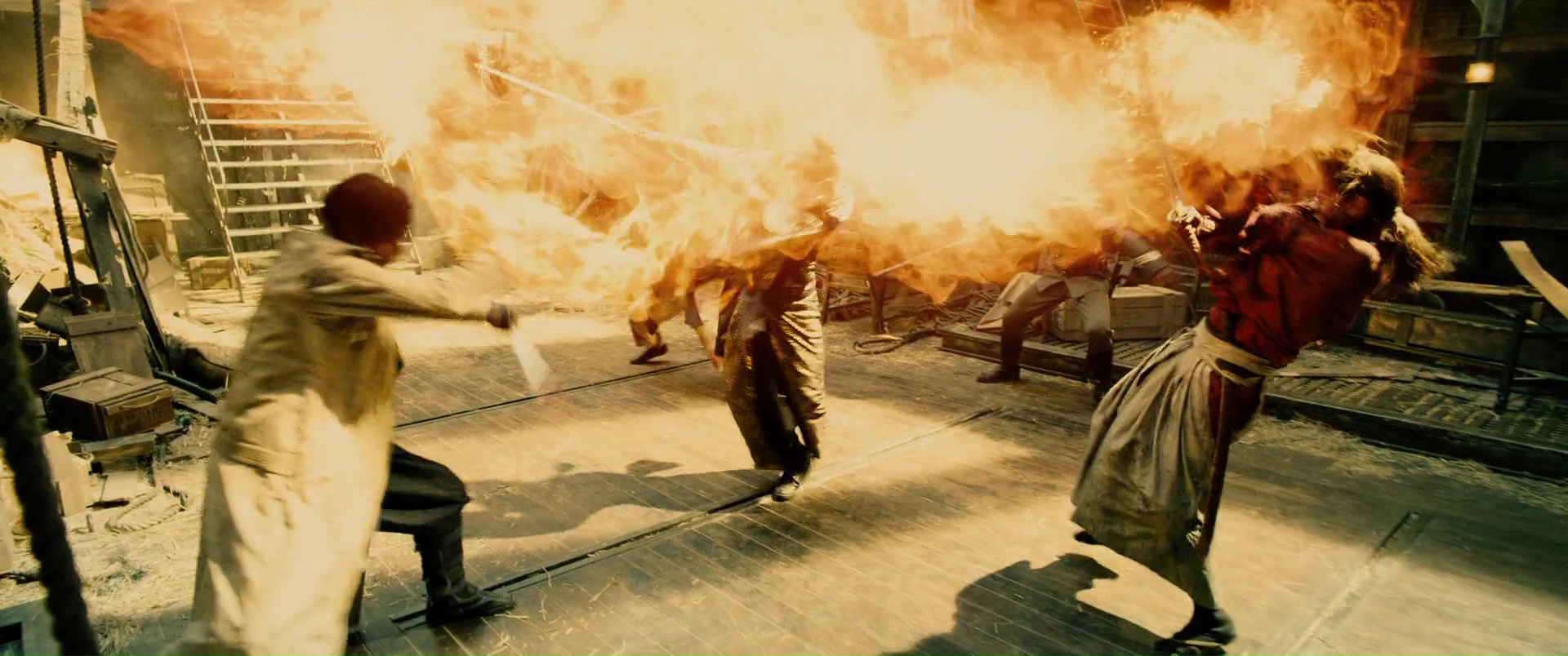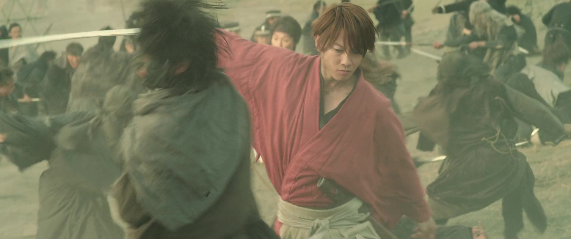 Oui, il y a de bonnes choses, clairement, des pistes intéressantes, un côté sans doute plus intimiste dans certaines péripéties. Mais comme je le disais, le film est clairement découpé en deux parties, et dés que Kenshin se sent prêt, voilà que l’acte final s’enclenche, que tout le monde se retrouve, et que les coups vont faire mal. On retrouve d’ailleurs une structure assez similaire au long final du premier film, à savoir un combat contre de nombreux ennemis, un poil trop court ceci dit, mais fonctionnant toujours grâce au côté épique de la musique, et des chorégraphies souvent bonnes voir impressionnantes quand on prend en compte leur exécution dans le sable, ce qui ralentit et alourdit les mouvements de base, avant divers petits boss, et l’affrontement final. Là forcément, ça envoi du lourd, ça nous en donne pour notre argent, et difficile de bouder notre plaisir, surtout que les affrontements sont longs, parfois techniques, et que l’on sent que les acteurs ont mouillé la chemise pour arriver à un tel résultat. Étrangement par contre, c’est dans cet opus, et surtout lors de son long final, que Kenshin retrouve par moment son influence manga, presque absente jusque là. Dans l’affrontement contre le moine par exemple, un peu trop typé manga, ou dans certains coups ou éléments du combat final, comme ces coups surpuissants qui traversent les objets, ou des coups puissants qui envoient des flammes. En soit, rien de dramatique bien entendu, mais il est assez étonnant finalement de voir l’influence manga, son support de base donc, exploser, notamment lors du final. Pour en mettre plein la vue ? Peut-être. Mais malgré tout ça, et le fait que l’on peut clairement dire que ce dernier opus est un poil en dessous des autres, il reste néanmoins excellent, et clôt tout ça comme il se doit, faisant passer un excellent moment, et posant Kenshin définitivement comme l’un des meilleures adaptations qui soit.
