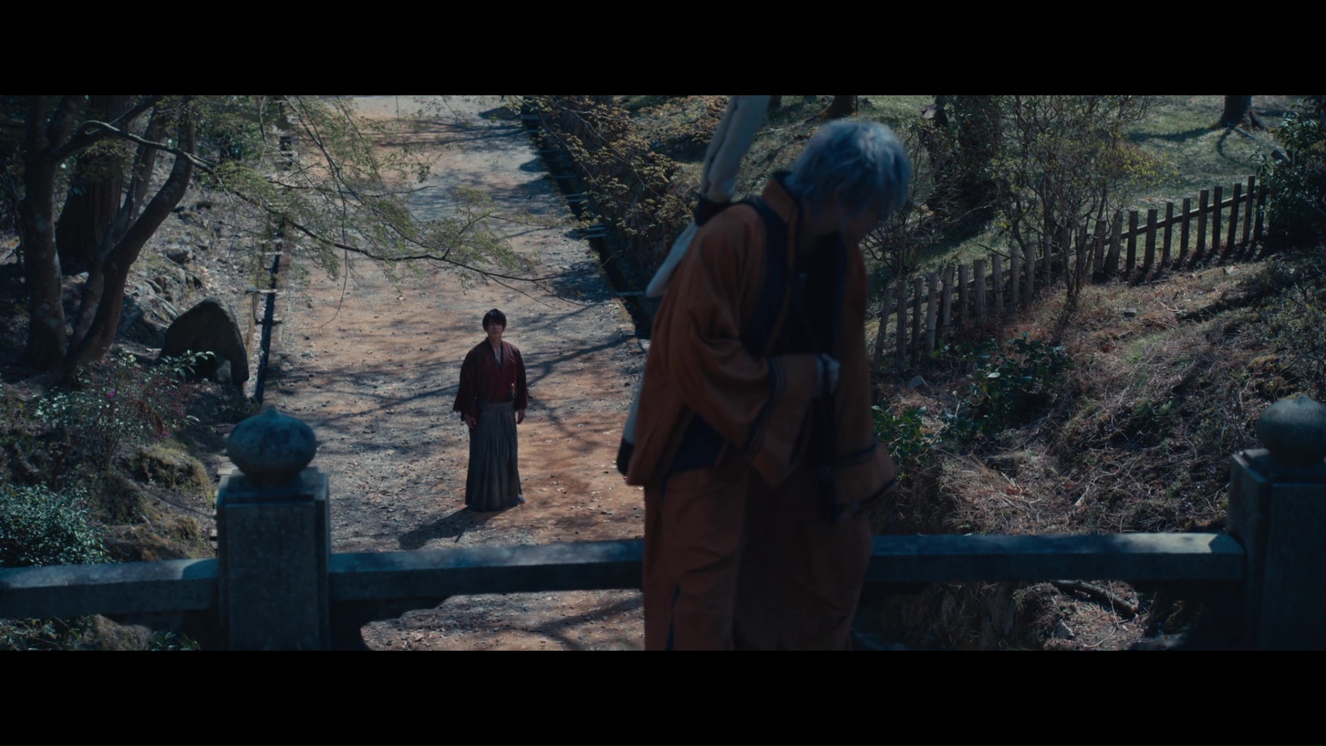 Oui je sais, dés qu’on me lance sur Netflix, je m’égare. Mais donc, comme je le disais, là où ça fait mal, c’est surtout car il est bon, voir très bon ce quatrième film Kenshin. Dans la directe continuité des précédents, et après tout, toute l’équipe rempile, que ce soit les nombreux acteurs, Ôtomo Keishi à la mise en scène et au scénario, Satô Naoki à la musique, ou encore Ishizaka Takuro à la photographie. Ils sont tous là depuis le tout premier film en 2012, et rempile tous une nouvelle fois, donnant à ce nouveau film une continuité avec tout ce qui précédait, certes, mais surtout une continuité dans la qualité. C’est toujours aussi beau pour les yeux, les décors toujours réalistes, les costumes toujours soignés, la photographie toujours à tomber par terre, le travail de caméra toujours très solide et ne cédant jamais aux facilités actuelles de la caméra portée rendant l’action incompréhensible. Dans les moments posés comme dans les nombreux moments d’action, Kenshin 4 envoi du lourd. Et ce même si arrivé mi-parcours, j’ai commencé à avoir peur, me rappelant qu’un cinquième film se situe juste derrière, et ayant donc peur de revoir un des défauts du 3, à savoir une première partie au rythme assez étrange, hachuré, plus posé. Heureusement, et ce même si le rythme n’est pas parfait ici (on aura bien une petite baisse de rythme malgré tout), ce n’est pas le cas, l’histoire se tient et a bien un début, un milieu, et une fin. Ce coup-ci, Kenshin et ses amis vont devoir affronter Enishi, qui n’est autre que le beau frère de Kenshin, et qui est bien déterminé à se venger pour le meurtre de sa sœur, l’ancienne femme de Kenshin dont nous n’avions pas encore entendu parler jusque là, et dont le passé nous rattache à quelques rapides événements aperçus dés le premier film, sans que cela ne fasse jamais forcé d’ailleurs. Mais se venger, c’est bien, mais le faire avec une armée, c’est encore mieux. Du coup, comme pour le troisième film, le grand ennemi n’est pas seul et plutôt bien entouré, ce qui donne de multiples affrontements durant le métrage, et un aspect de niveaux à réussir avant d’atteindre l’objectif final. Ça fonctionne toujours aussi bien en tout cas.
