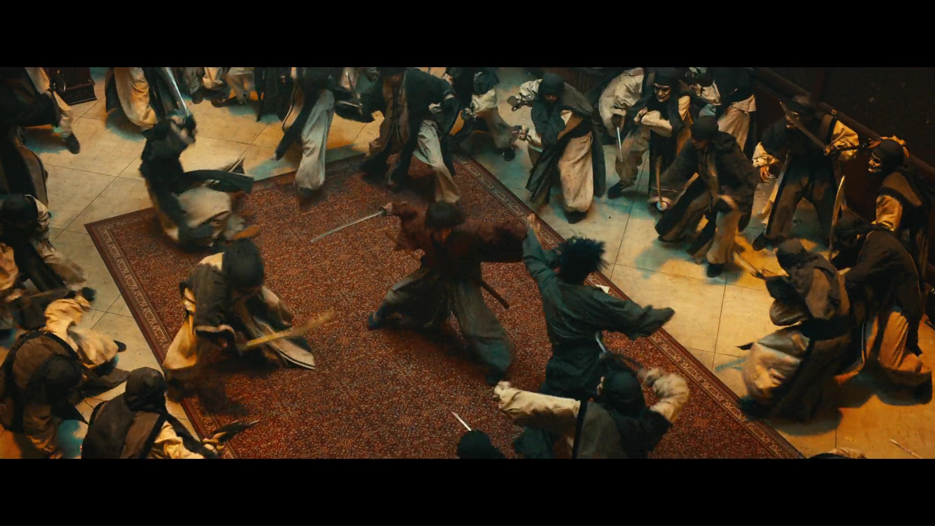 Il faut dire que le travail sur les chorégraphies mais aussi le travail du caméraman (que l’on oublie souvent hein) est phénoménal. Et si je disais que Kenshin 4 en avait sous le capot, je signalais aussi malgré tout une petite baisse de rythme à un moment, sans que cela ne m’ai vraiment dérangé au final. On peut dire la même chose du fond de l’histoire. On en apprend forcément plus sur le passé de Kenshin, vu qu’il a été marié, mais le tout est traité hyper rapidement, on en saura au final peu sur la psychologie des nombreux nouveaux personnages, c’est très épuré, très direct. C’est un peu dommage, sans que cela ne soit désagréable, loin de là. Par contre, ce quatrième opus est clairement généreux sur pas mal d’aspects. L’action bien évidemment, rapide, stylisée, et parvenant le plus souvent à éviter d’être trop surréaliste pour éviter cet aspect trop typé manga live, et qui parvient à être, en plus, bien filmée et chorégraphié, que ce soit dans des combats dans des lieux étriqués, sombre et exigus, ou que ce soit dans des endroits plus larges mais avec un nombre conséquent d’adversaires. Avant bien entendu un long affrontement final qui envoi lui aussi du pâté. Rien à redire, même si finalement, qualitativement parlant, ce quatrième volet n’est pas le meilleur, souffrant de quelques petits défauts, à l’image du troisième opus, et survolant certains éléments de son intrigue qu’il aurait pourtant été judicieux de développer, mais demeure toujours excellent. En fait, Kenshin finit un peu à ressembler, dans le fond, à la saga Baby Cart. À chaque opus, de nouvelles aventures, de nouveaux éléments du passé qui sont révélés, sans pour autant changer la formule de manière générale, avec certains opus meilleurs que d’autres, mais toujours d’un bon niveau. Ça tombe bien, les deux adaptant des mangas, et mettant en scène un sabreur souvent peu bavard et solitaire, même si oui, dans le cas de Kenshin, il a beau vouloir souvent faire les choses en solo, ces amis, nombreux, viennent toujours l’aider, ce qui permet à ce quatrième opus de voir le retour de très nombreux personnages, qu’ils aient été introduis dans le premier, ou dans les deux suites. Du tout bon.