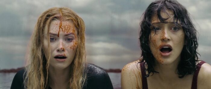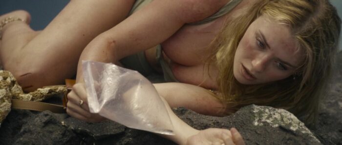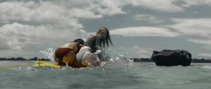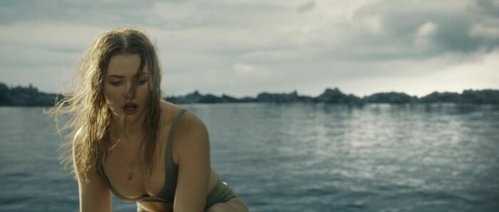Et le reste donc, la partie en mer façon The Shallows ? Et bien c’est comme The Shallows, avec deux personnages au lieu d’un (plot twist, il y aura des tensions et un personnage va périr), perdues sur un rocher, et c’est sacrément moins bien, la faute à des clichés beaucoup trop prévisibles, à des fonds verts parfois assez voyants voire bien ratés (si bien que parfois, on a presque l’impression que la plage n’est pas si loin), et pas mal d’ennui par moment. L’orque parfois reste relativement bien faite ceci dit, suivant les plans, et ses attaques ou tentatives sont assez fréquentes, heureusement. Et c’est dommage, car à quelques rares occasions, le film a quelques idées, ou du moins des petits élans pour certains plans, comme celui inspirant l’une des pochettes du film, avec un SOS sur un petit bout de plage qui se remplit doucement par le sang d’une victime. Mais ce n’est pas assez pour passionner, surtout qu’au final, les rebondissements et autres dilemmes sont assez peu nombreux pour maintenir le suspense sur la durée. D’ailleurs, son final, là où le film doit tout donner, où l’héroïne doit normalement se surpasser pour survivre, pour dompter la nature, il en est dénué, de suspense. Alors oui, peut-être que pour les quelques couacs visuels, Jo-Anne Brechin n’a pas eu le budget de ses ambitions, le budget de faire mieux. On le pardonnerait ça, si le scénario n’avait pas lui tous ces défauts facilement évitables et corrigeables. On se demande du coup si Lionsgate a regardé le film avant de l’acheter, où a juste vu la pochette et a foncé. En tout cas, Orca peut dormir sur ses deux nageoires, Killer Whale ne lui fera pas de l’ombre.