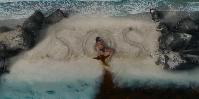 Et le reste donc, la partie en mer façon The Shallows ? Et bien c’est comme The Shallows, avec deux personnages au lieu d’un (plot twist, il y aura des tensions et un personnage va périr), perdues sur un rocher, et c’est sacrément moins bien, la faute à des clichés beaucoup trop prévisibles, à des fonds verts parfois assez voyants voire bien ratés (si bien que parfois, on a presque l’impression que la plage n’est pas si loin), et pas mal d’ennui par moment. L’orque parfois reste relativement bien faite ceci dit, suivant les plans, et ses attaques ou tentatives sont assez fréquentes, heureusement. Et c’est dommage, car à quelques rares occasions, le film a quelques idées, ou du moins des petits élans pour certains plans, comme celui inspirant l’une des pochettes du film, avec un SOS sur un petit bout de plage qui se remplit doucement par le sang d’une victime. Mais ce n’est pas assez pour passionner, surtout qu’au final, les rebondissements et autres dilemmes sont assez peu nombreux pour maintenir le suspense sur la durée. D’ailleurs, son final, là où le film doit tout donner, où l’héroïne doit normalement se surpasser pour survivre, pour dompter la nature, il en est dénué, de suspense. Alors oui, peut-être que pour les quelques couacs visuels, Jo-Anne Brechin n’a pas eu le budget de ses ambitions, le budget de faire mieux. On le pardonnerait ça, si le scénario n’avait pas lui tous ces défauts facilement évitables et corrigeables. On se demande du coup si Lionsgate a regardé le film avant de l’acheter, où a juste vu la pochette et a foncé. En tout cas, Orca peut dormir sur ses deux nageoires, Killer Whale ne lui fera pas de l’ombre.