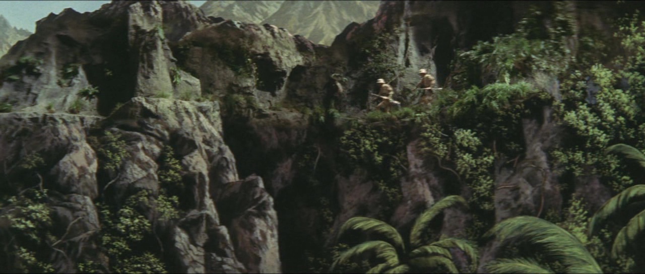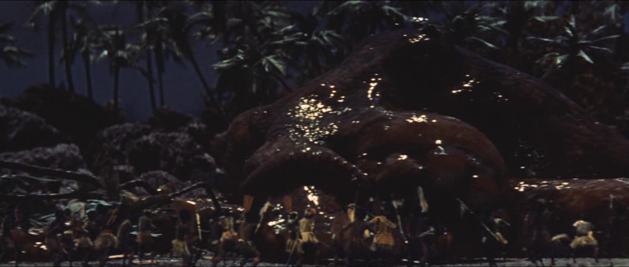 Mais le duel et les deux monstres ne viennent pas relever le niveau, l’ensemble se révélant même plutôt stupide, avec un Godzilla affaiblit par l’électricité (depuis quand ?), et un King Kong qui recherchera encore une fille pendant un petit temps, mais sans que cela ne soit utile au récit, au film, à tout. Et si Honda gère plutôt bien le passage de la saga à la couleur, l’effet rend les Kaijus encore plus kitch par contre, faisant ressortir tous les défauts des costumes, et rendant les combats kitch au possible. Sans parler de la gueule du fameux King Kong, risible. On est bien loin du King Kong original, qui datait pourtant de 29 ans plus tôt, ou du King Kong de 1976, certes 14 ans plus tard, mais bien plus réussi malgré quelques incrustations moyennes. Alors oui, on pourra au final rire de tout ça, et le combat en lui-même, au final relativement long, sait au moins se faire généreux, à défaut d’être réussi. Quelques plans sont même réussis lors de la première apparition de Godzilla contre les militaires, avec Honda choisissant souvent des plans larges pour ne pas forcément se focaliser sur les défauts, ou des plans furtifs. Et puis Godzilla pour sa première aventure en couleur a lui une trogne plus réussie que dans les opus enfantins qui suivront où son design évoluera tristement. Du coup, King Kong contre Godzilla est bel et bien un métrage moyen. Pas catastrophique à tous les niveaux, mais propose un duel décevant, des personnages énervants. Pas le pire, mais pas un bon Kaiju. Oh, et il y a un calamar géant aussi, pour la route, et la scène… tient la route !