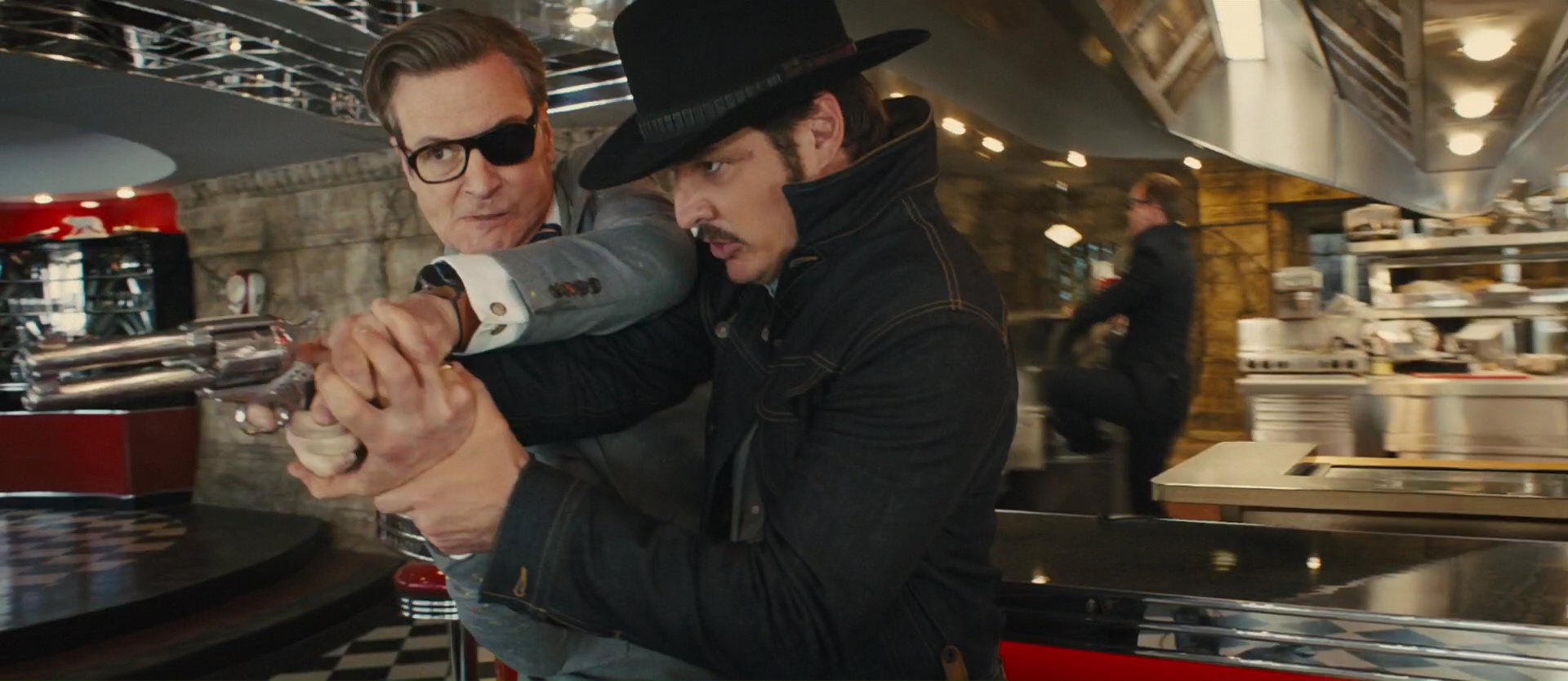 D’ailleurs soyons clair, Kingsman 2, du haut de ses 2h21, est incroyablement bien rythmé, jamais ennuyeux, remplit de bonnes idées, les scènes d’action, que ce soit des poursuites, combats, fusillades, sont toujours aussi fluides, bien chorégraphiées, pleins de bonnes idées, le style Vaughn fait des ravages une nouvelle fois. Ça ne se fou pas de notre gueule. Le fan du premier aura un sourire au visage durant quasiment tout le métrage malgré quelques ratés. Car malgré ses nouveaux méchants, sa nouvelle intrigue, et le fait que par moment, Kingsman 2 fait des choix radicaux et n’hésite pas à se débarrasser de certains personnages (même s’il ne se débarrasse pas forcément des personnages les moins intéressants, dommage), le film reste une suite qui parfois a du mal à surprendre. Car dans le fond, Kingsman 2 reprend encore une fois une structure que l’on connaît bien, et fait même revenir certains personnages qui augmentent encore cette impression. Et au final, la déception de cette suite, ce manque de surprise, on le retrouve justement surtout au niveau des personnages. Quand je vous disais que le casting revenait, un peu trop d’ailleurs, et bien c’est une surprise pour personne vu que les affiches et bandes annonces jouaient sur cet élément, mais Colin Firth (excellent acteur en passant) revient également. Oui, on lui trouve une excuse, et une balle dans la tête n’est plus si mortel que ça. S’il s’intègre plutôt bien à cette nouvelle aventure, son retour annonce un certain manque de risque et une certaine redite, et surtout, c’est con à dire, mais cela nous force à revoir la force de la dite scène du premier film. On peut se dire qu’à côté, on récupère pleins de nouveaux personnages. Et c’est vrai. Mais la plupart ne sont pas ou peu exploités.