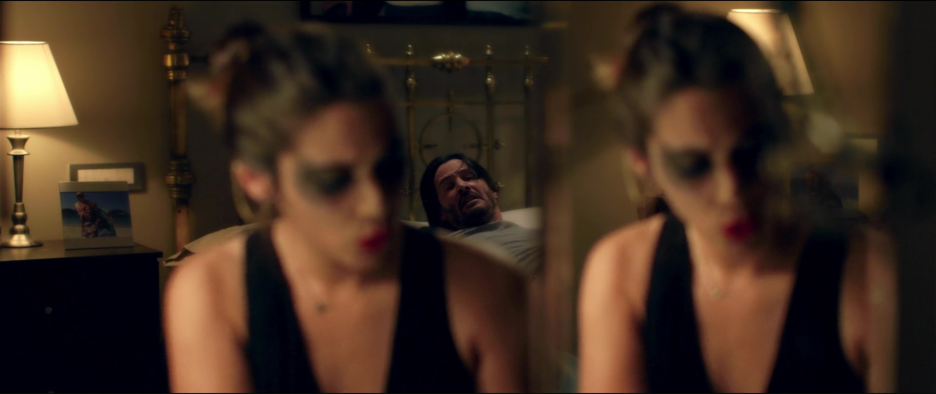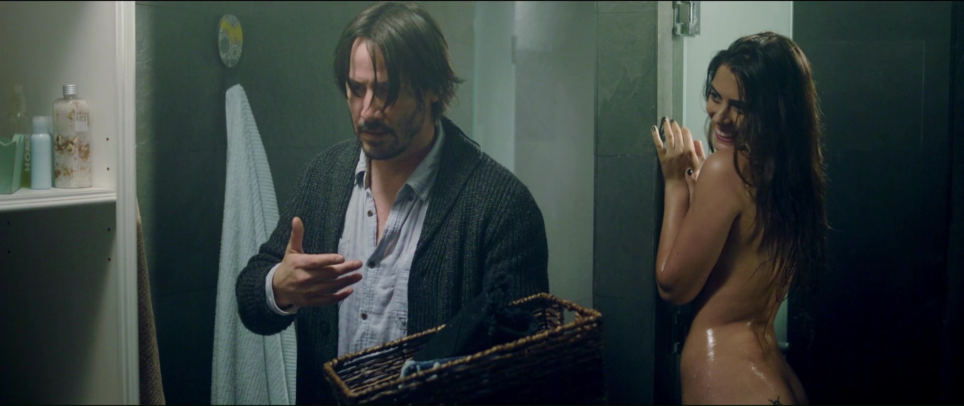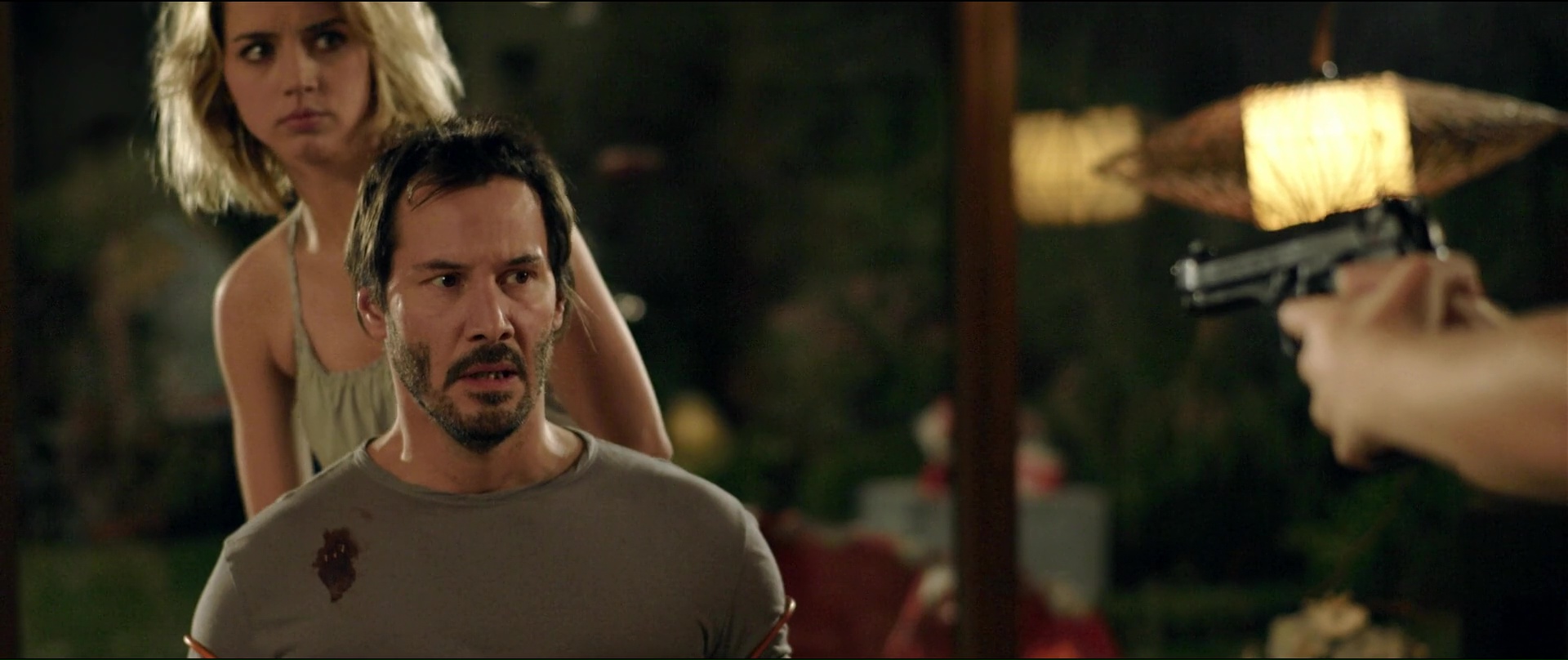 Keanu Reeves nous est présenté comme un père de famille exemplaire. Et je n’aurais jamais cru dire ça après ses prestations inexpressives dans 90% de sa filmographie (Speed et Dracula, ça date quand même), mais le bougre le fait plutôt bien. Oui, il arrive à avoir des expressions, à rire, à crier, à paniquer. Pas de quoi remporter un oscar bien évidemment, mais une honnête prestation inespérée. Eli Roth n’avait pas menti en disant que Keanu livrait une de ses meilleures prestations. Bref, alors que Keanu Reeves reste seul dans la maison pour un week-end, il a le malheur d’ouvrir la porte à deux charmantes demoiselles, qui vont peu à peu devenir envahissantes, séductrices. Des vraies femmes fatales, manipulatrices. Et le pauvre Keanu va craquer, et le regretter amèrement. Il faut bien avouer qu’à sa place, avec Lorenza Izzo et Ana de Armas devant moi, j’aurais craqué également ! Seulement les choses sérieuses commencent directement ensuite, Keanu se faisant malmener comme jamais.