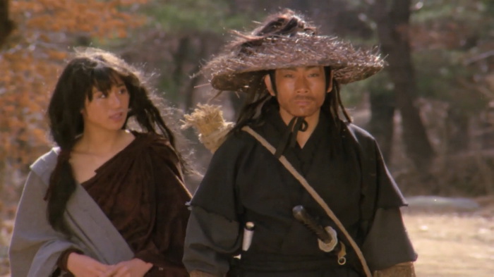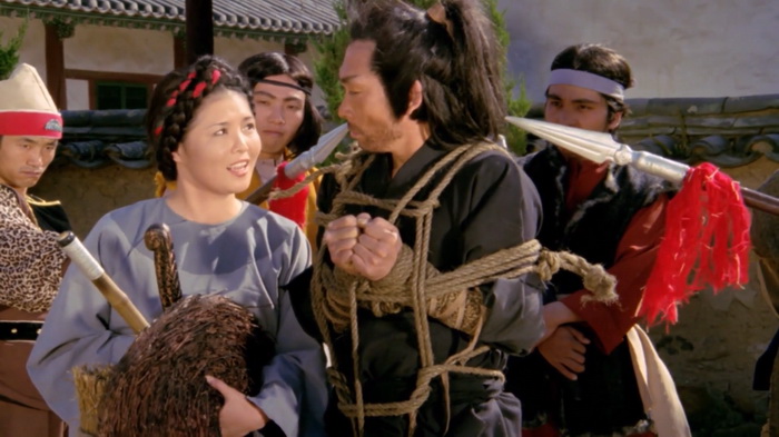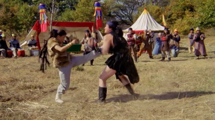Konan the Barbarian Swordsman, quel titre ! Cette version de 1h13 sans les ninjas de la version 2 en 1 de IFD semble également être l’œuvre de IFD si on en croit le logo au tout début du film, mais elle serait en quelque sorte une version 0.7 ou 0.8 de la version originale coréenne. En effet, ils n’ont ici rien rajouté, mais ils semblent avoir enlevé un paquet de scènes pour que le film soit le plus rythmé possible et ne soit quasiment au final plus qu’une succession de combats. Une chose est sûre, c’est qu’il n’y a dans Konan The Barbarian Swordsman absolument aucun barbare, ni même de personnage appelé Konan. Ce titre inventé de toutes pièces pour le marché américain est clairement marketing et j’imagine la déception du public US lorsqu’il s’est aperçu de la supercherie au visionnage. Malgré les grosses coupes qu’a subi cette version, l’histoire est assez simple et se résume au fait que le personnage central, Kona… euh, Eagle donc, recherche le général Yong, qui a tué sa famille et capturé sa sœur, afin de le tuer, et il va se retrouver confronté à tous un tas d’ennemis qui vont lui barrer la route. Oui, on a connu plus original. Si on devait définir Konan The Barbarian Swordsman, on pourrait dire qu’il est le rejeton d’un film de chanbara mettant en scène un héros solitaire façon Baby Cart et d’un wu xia chinois avec tout ce que ça comporte de combats aériens câblés. Et ils se sont dit qu’ils allaient faire passer ça pour un film de barbare. La supercherie, c’est une seconde nature pour IFD. Etant donné que le personnage va d’un point A à un point B, il est assez facile de comprendre que ce sont les scènes de ses trajets et quelques moments d’exposition qui ont été charcutés au montage. Pour le coup, aucun personnage n’est réellement développé, à commencer par le personnage central, et on a cette sensation de personnage qui se téléporte d’un lieu à l’autre. Certes, on y gagne en rythme, mais difficile de s’imprégner de l’ambiance que le film tente parfois d’instaurer car on ne nous laisse pas le temps de le faire. Ces coupes sont en plus faites à l’arrache, accentuant encore plus l’aspect fauché du film.