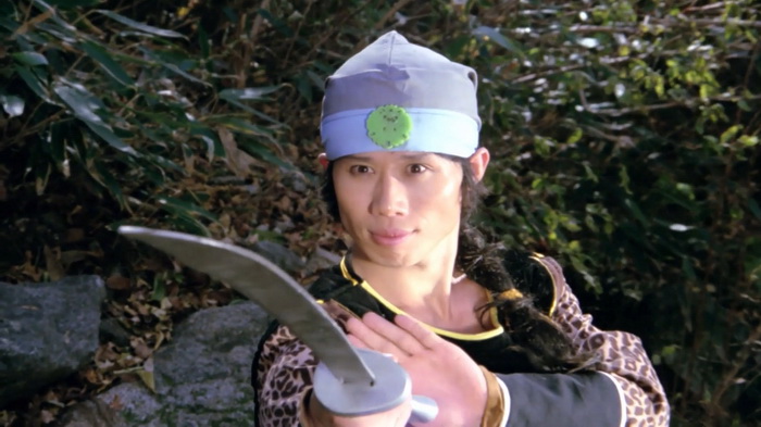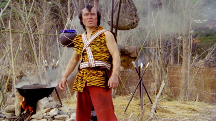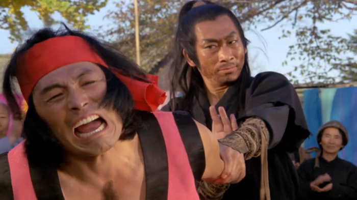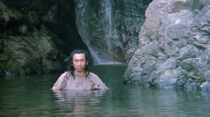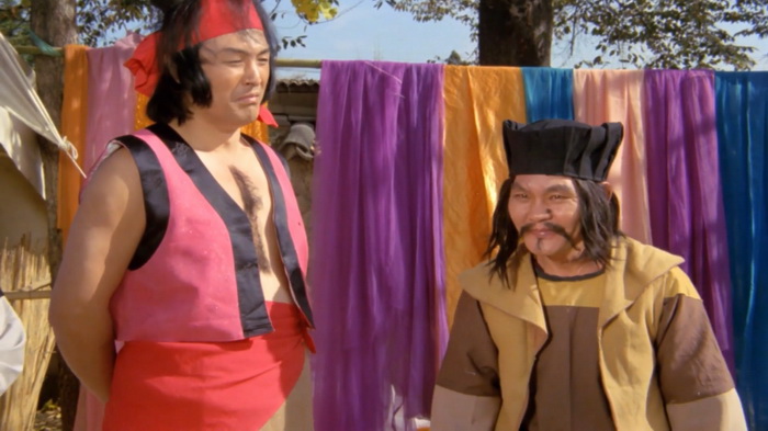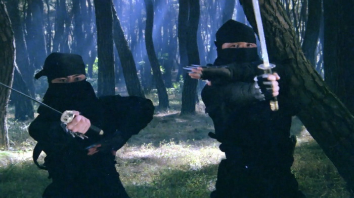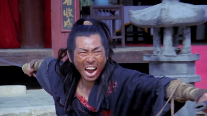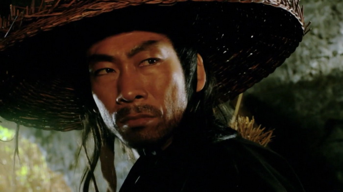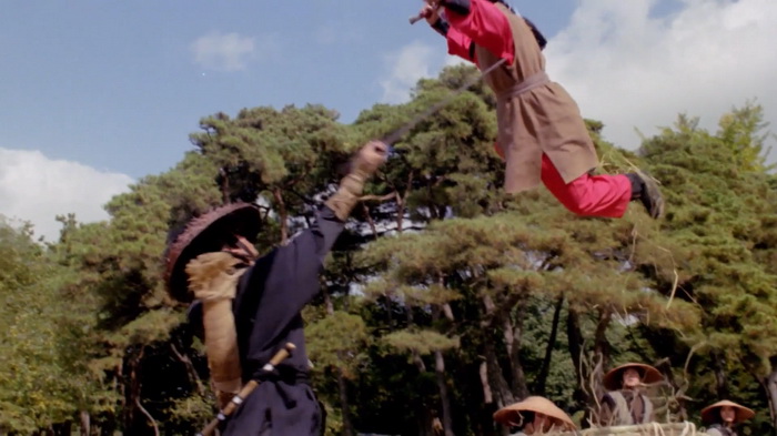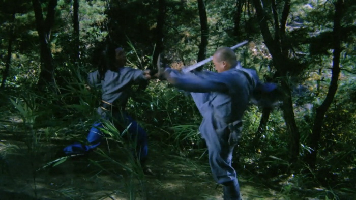 On sent effectivement un très faible budget et ce sont les costumes qui trahissent immédiatement. C’est simple, de nombreux personnages secondaires ont des dégaines pas possibles, vêtus de hauts tellement fins qu’ils auraient pu être découpés dans du papier crépon, aux couleurs parfaites pour passer inaperçues. Oui, se cacher dans une forêt verdoyante avec un petit haut rose bonbon, c’est le top du top. La mise en scène est plutôt honnête et le réalisateur s’inspire parfois des western spaghettis avec beaucoup de gros plans sur les visages, sur les regards crispés au moment des affrontements. Le problème, c’est que cette tension qu’il essaie de mettre dans les affrontements, elle est un peu vaine car les personnages ne sont pas du tout développés, comme s’ils n’avaient pas réellement d’histoire personnelle et les motivations qu’ils ont pour tuer sont extrêmement sommaires. Peut-être est-ce dû aux nombreuses coupes que ce montage semble avoir subi. Au final, on se retrouve avec 1h11 quasiment exclusivement réservés aux combats avec toute une tripotée de personnages hauts en couleurs qui vont être impliqué d’une manière ou d’une autre. Lancier cracheur de feu, contorsionniste qui sort d’un faux rocher, géant habillé en papier crépon, archer au camouflage rose, gamins un peu trop impertinents, moines shaolin, ninjas habillés de noir qui descendent les arbres la tête en bas, … C’est sans doute parce qu’il y a ces ninjas noirs que IDF a dû acheter ce film, en se disant qu’ils pourront rajouter d’autres scènes avec des ninjas pour leur Full Metal Ninja. Les combats sont très nombreux, plus ou moins longs, jamais d’une très grande qualité mais néanmoins plutôt corrects et on sent une envie de bien faire, aussi bien lorsque ça singe les chanbaras que lorsque ça lorgne vers les combats câblés du cinéma de Hong Kong. Ce n’est pas du grand art, mais ça se regarde. Petit élément rigolo, chaque affrontement se conclut, lorsque le héros range son sabre, par les premières notes de la célèbre Toccata et fugue en ré mineur de Bach.