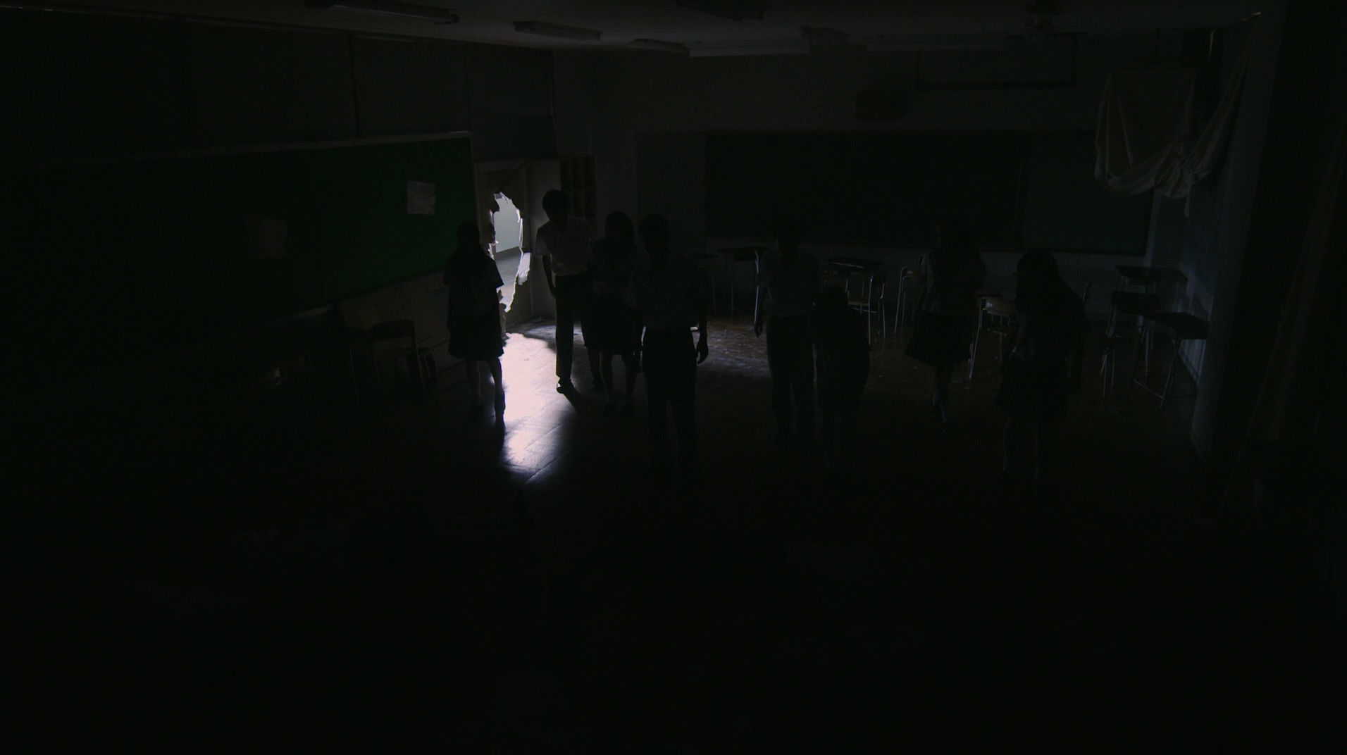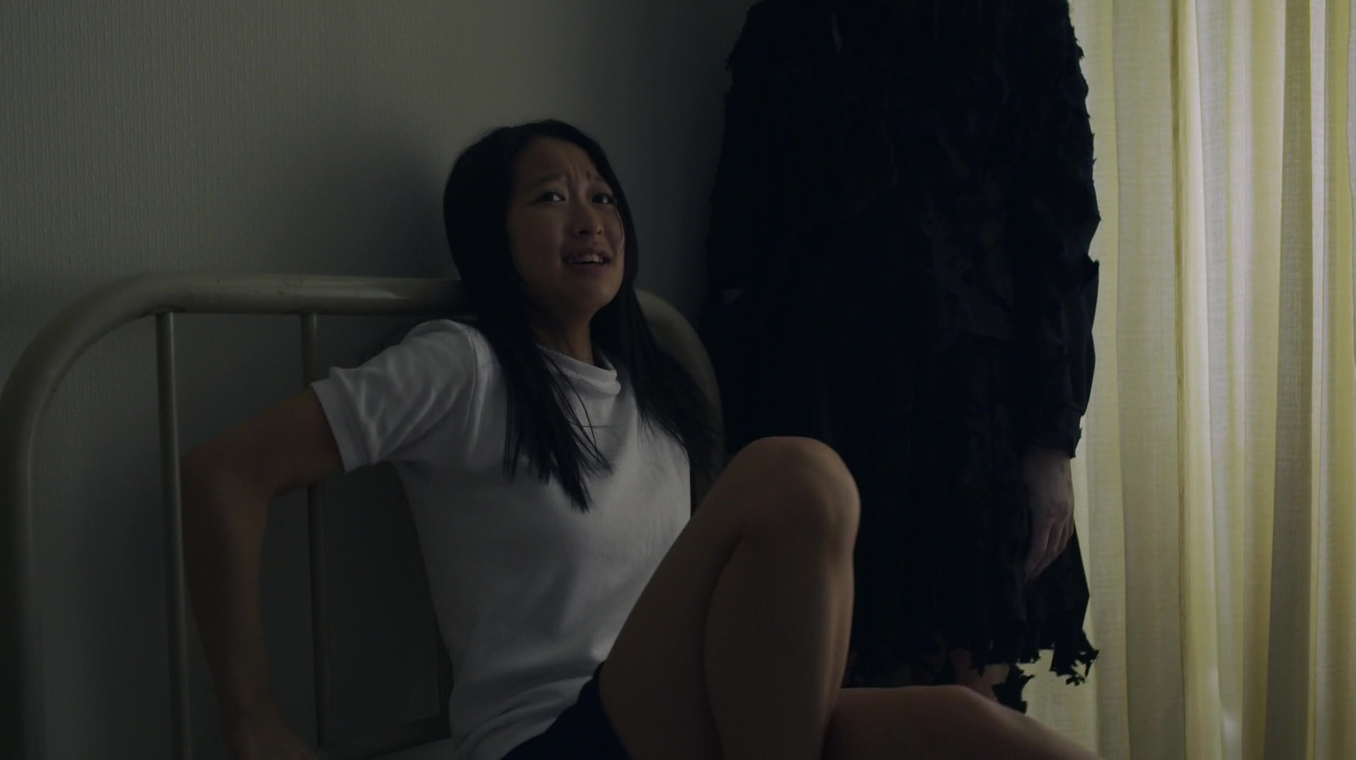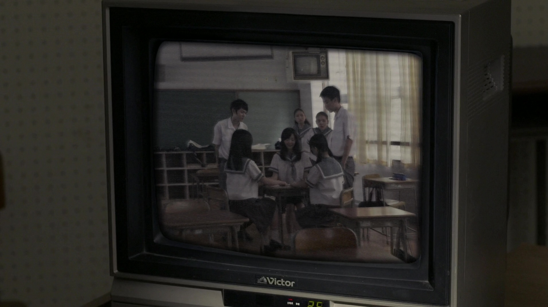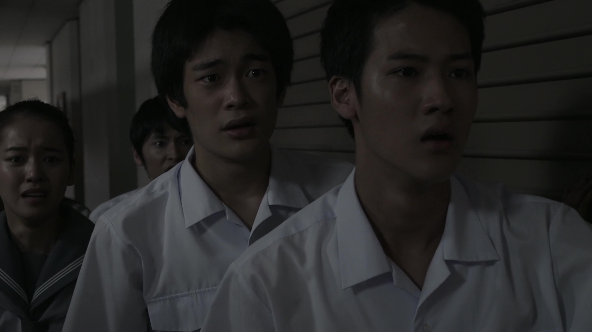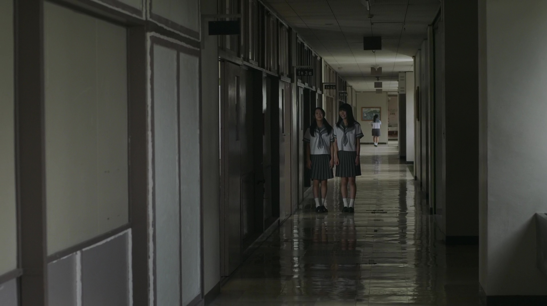 Après une scène d’introduction qui pose le ton et s’avère efficace, nous voilà donc plongé dans l’aventure. D’un côté, une jeune femme qui va retrouver le journal de sa mère, ancienne étudiante d’une école où un malheur a eu lieu en 1988, et qui a laissée derrière elle 4 pièces de 100 yens en souvenir. Puis il y a cette classe dans une école qui se raconte des histoires pour faire peur, dont celle de la fameuse classe 4 (4 en Japonais veut aussi dire Mort), dont les lycéens seraient morts asphyxiés suite à une fuite de gaz. Deux intrigues, fort bien. Ah non attendez, en voilà une troisième, avec 4 jeunes qui rentrent dans l’école, à présent fermée au public, dans le but d’y tourner de fausses vidéos de fantômes, avec l’un d’entre eux carrément près à se déguiser et maquiller en Hanako-san pour apparaître dans les toilettes de l’école. Trois histoires, pas mal de personnages, et un lieu unique, ce qui bien entendu nous grille dés le départ le fait que les trois histoires ne se déroulent pas forcément en même temps, dans la même temporalité, mais dans le même lieu, physiquement. Et du coup, le film se permet en quelque sorte de mettre en avant plusieurs types d’effets. Du coup, jamais le temps de s’ennuyer, et malgré tout, une intrigue simple et compréhensible, qui ne s’éparpille jamais, en laissant un temps adéquat à chaque intrigue à l’écran pour leur permettre de bien se développer. C’est fluide, lisible, et en terme d’horreur, et bien la surprise est totale, puisque si le film a également quelques ratés, il s’en sort très bien malgré tout. Il sait jouer sur l’ambiance, certains moments anodins peuvent inquiéter, quelques jumpscares sont bien trouvés (et oui, moi qui dis ça), et comme dit, pas une seconde pour s’ennuyer, entre l’intrigue qui sait où elle va, la multitude de personnages, les trois époques, des apparitions spectrales, des sons inquiétants, un jeu de miroir intéressant à un moment.