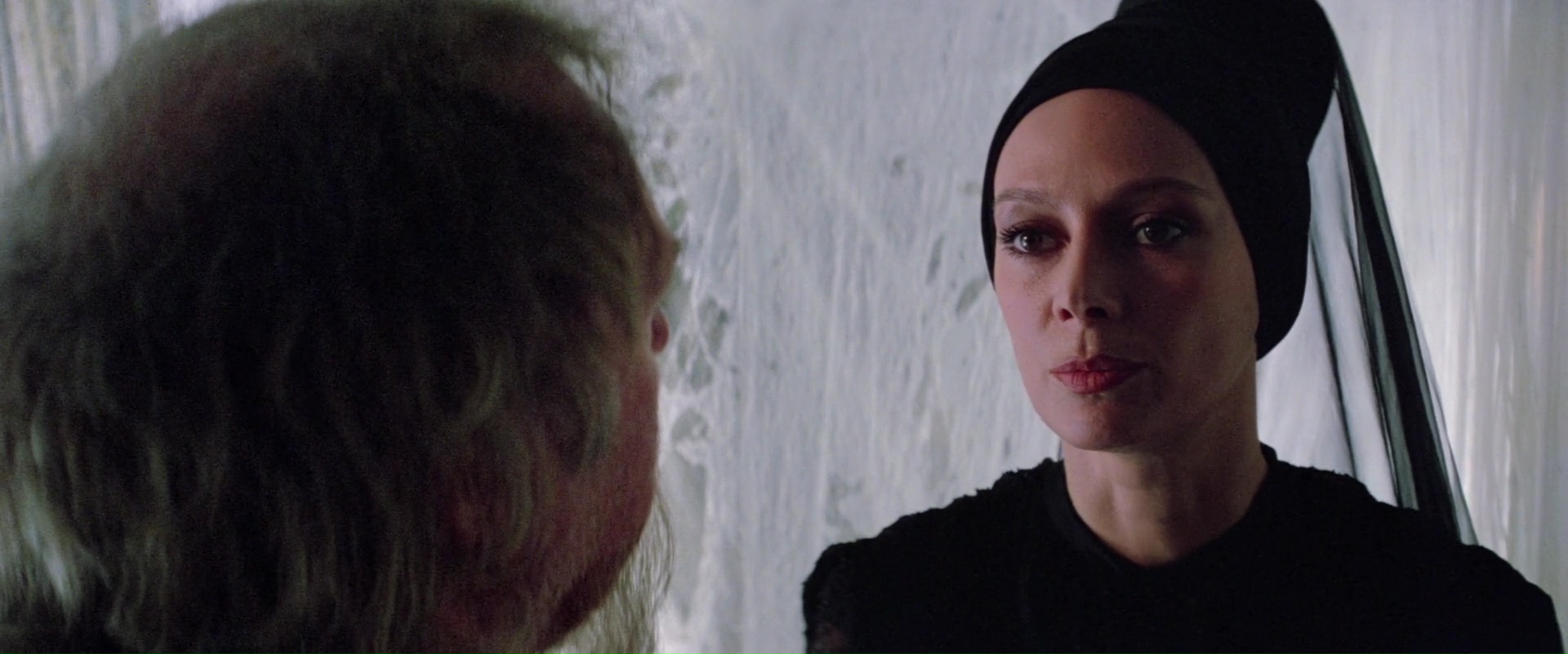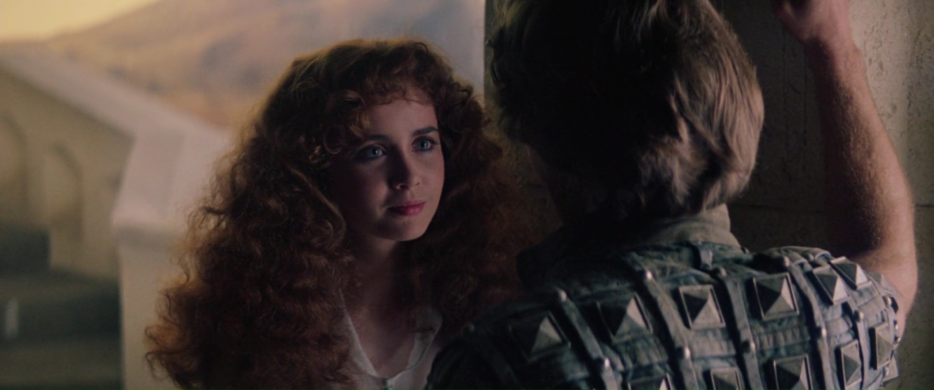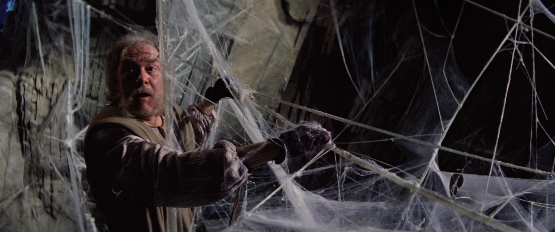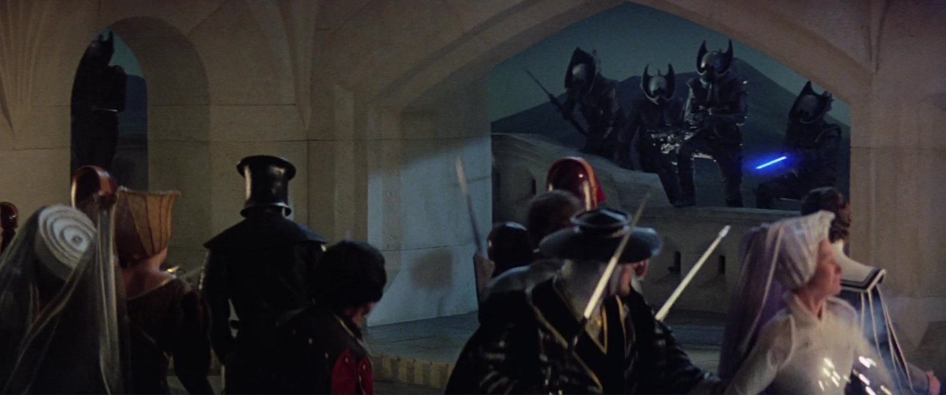 Dans le royaume de Krull, une bête maléfique, et donc, géante, vivante dans une forteresse, kidnappe une princesse le jour de son mariage avec Colwyn, ce qui aurait eu pour but d’unifier le royaume et de combattre la dite bête. Colwyn, aidé par Ynyr (Freddie Jones), puis rejoint par des bandits et un magicien faisant office de sidekick comique, va se mettre en route pour un long périple afin de délivrer la belle, sauver le monde, et tout ça. Un récit de fantaisie tout ce qu’il y a de plus classique dans les faits, avec sa dose de paysages sublimes, d’êtres fantastiques (des chevaux de feu, un cyclope), de créatures dangereuses (dont une araignée protégeant son antre), si ce n’est que les ennemis de notre héros ne viennent pas de ce monde, se déplacent dans une forteresse volante et qui change donc souvent d’emplacement, et que les ennemis apparaissent sous forme humanoïde, mais sont en réalité des parasites qui s’échappent lors de la mort de l’hôte, et que leur arme, pouvant servir d’épée, tire aussi des rayons lasers. Oui, un gros mélange entre la fantaisie de base et Star Wars. Et c’est souvent kitch oui, et parfois un peu maladroit, mais sans pour autant en être honteux, irregardable comme j’ai pu le lire sur différents sites, ou désagréable. Krull sait se faire rythmé, varier les péripéties, les décors, et sait en mettre plein la vue. Les décors intérieurs ont bénéficié pour beaucoup d’un grand soin (et d’un nombre très élevé de plateaux lors de son tournage aux studios Pinewood), et les décors extérieurs sont souvent magnifiques. Même si Peter Yates, le réalisateur, a tendance a vouloir rendre ses décors majestueux et donc à filmer certains plans d’un peu trop loin. Vous rêviez de voir notre vaillant héros escalader une montagne ? Ne vous inquiétez pas, ce sera filmé de loin, très loin, si bien que l’exploit sera invisible à l’œil nu (et la doublure aussi, sans doute), mais que l’on se rendra bien compte de la grandeur du lieu. Mais bon, je m’attarde sur un détail. Krull a donc tous les clichés du genre, une variété de lieux, une quête de deux heures, une galerie de personnages variés, même si pas tous intéressants.