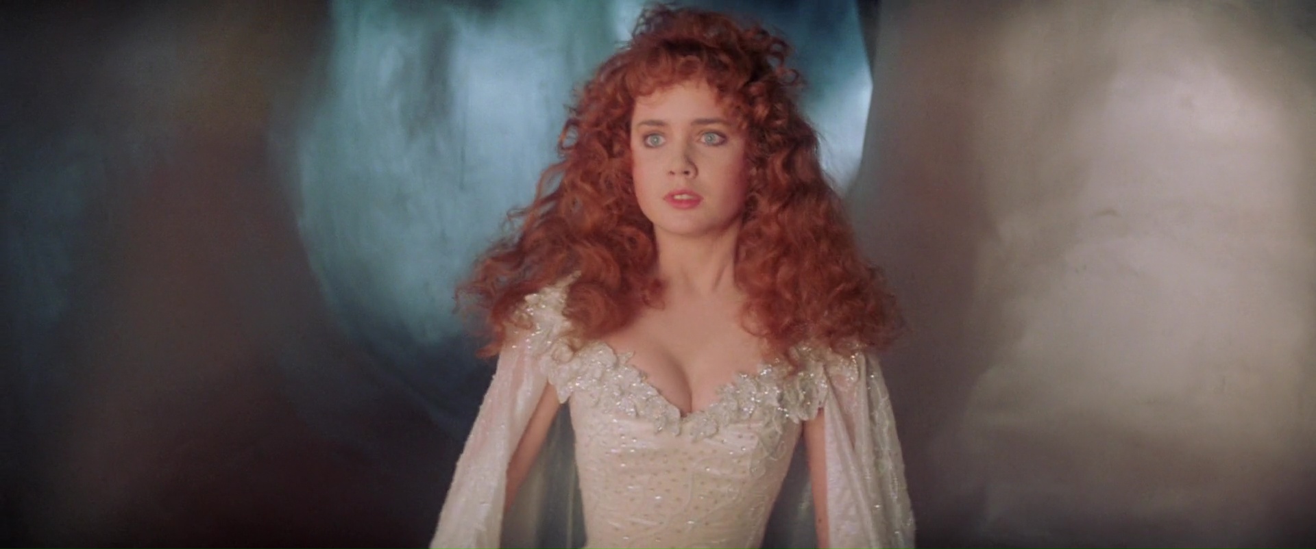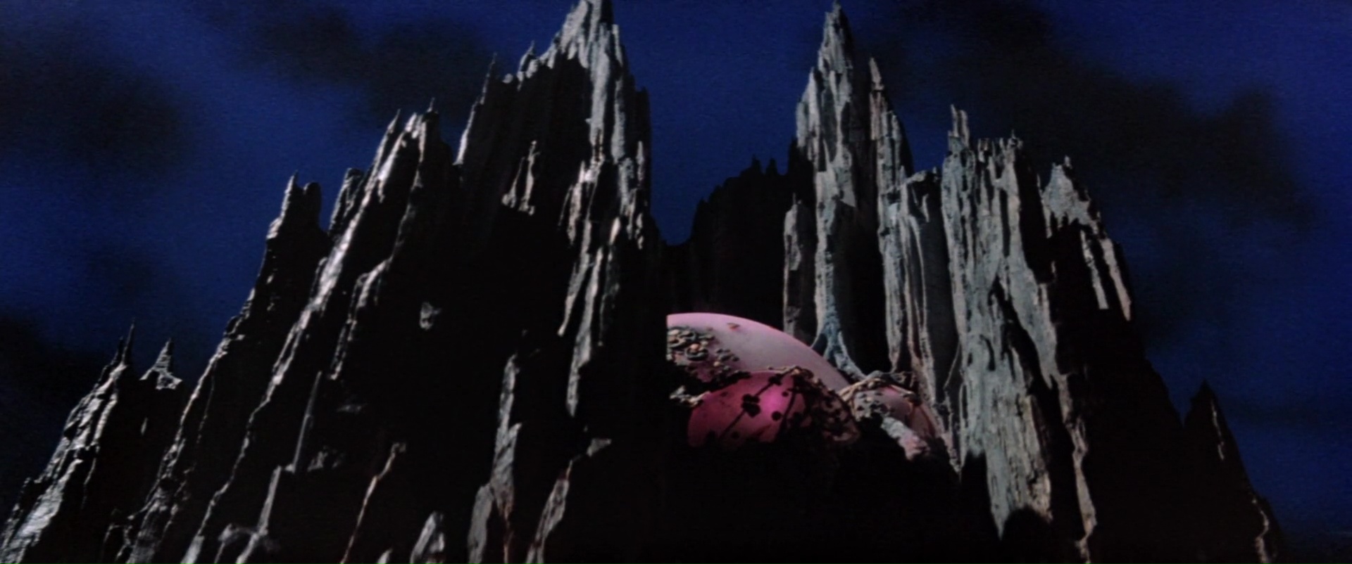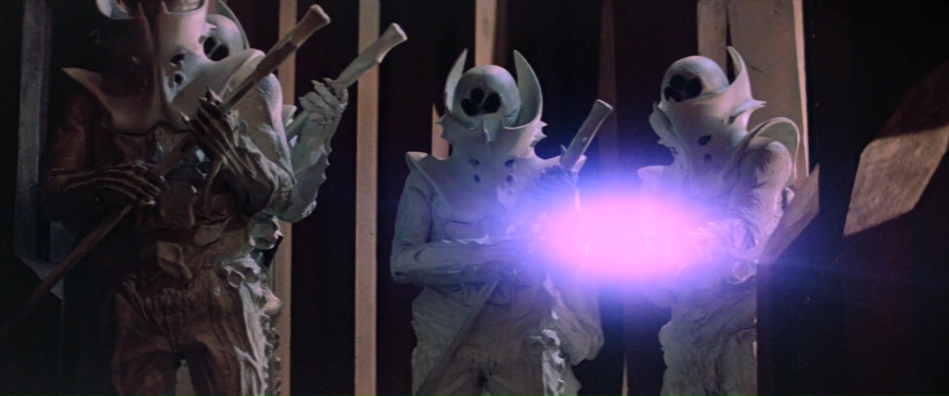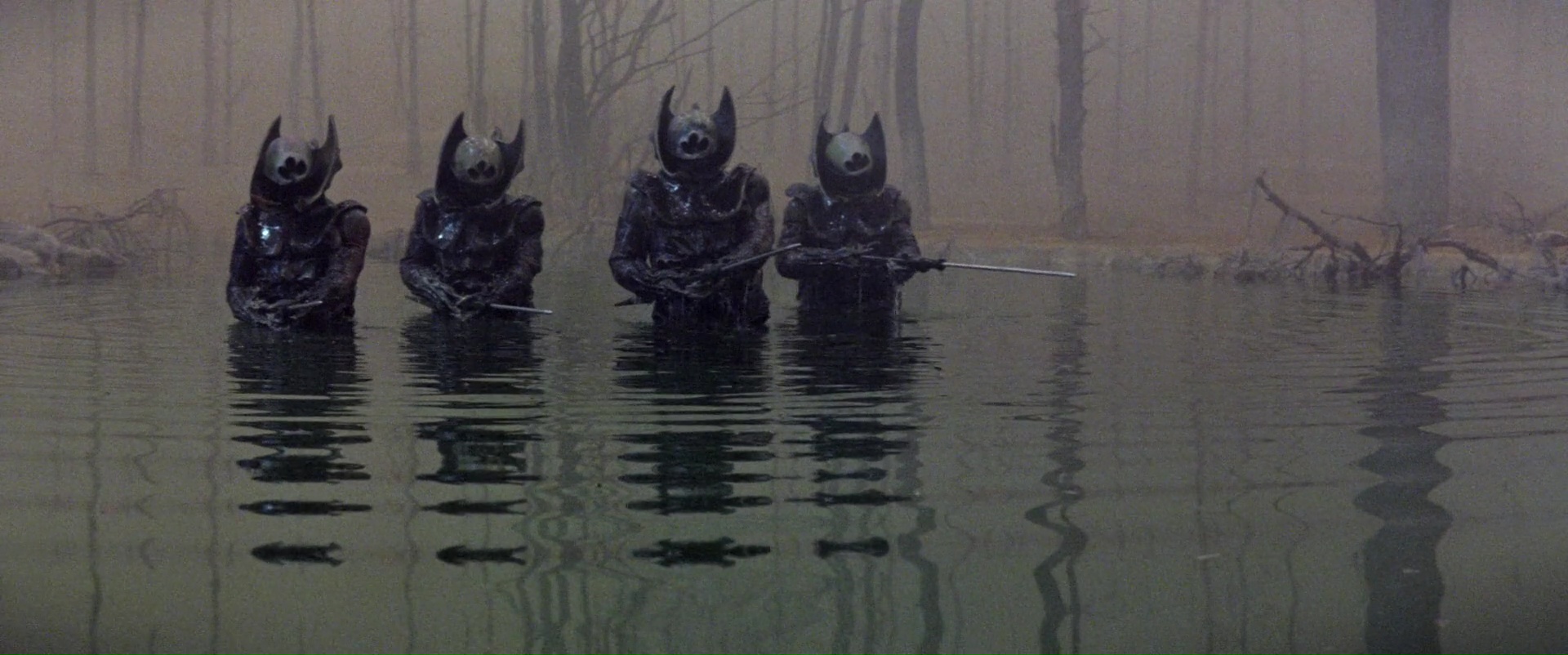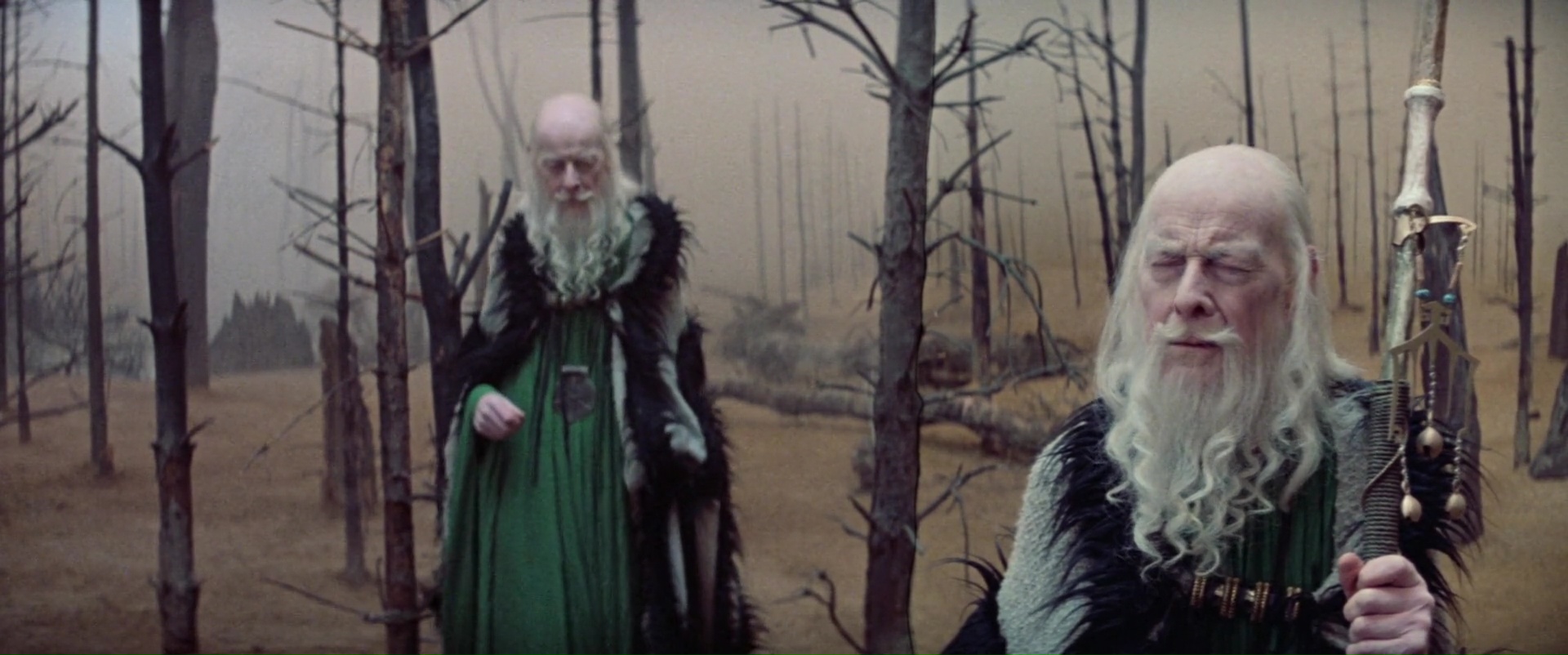 Dans le royaume de Krull, une bête maléfique, et donc, géante, vivante dans une forteresse, kidnappe une princesse le jour de son mariage avec Colwyn, ce qui aurait eu pour but d’unifier le royaume et de combattre la dite bête. Colwyn, aidé par Ynyr (Freddie Jones), puis rejoint par des bandits et un magicien faisant office de sidekick comique, va se mettre en route pour un long périple afin de délivrer la belle, sauver le monde, et tout ça. Un récit de fantaisie tout ce qu’il y a de plus classique dans les faits, avec sa dose de paysages sublimes, d’êtres fantastiques (des chevaux de feu, un cyclope), de créatures dangereuses (dont une araignée protégeant son antre), si ce n’est que les ennemis de notre héros ne viennent pas de ce monde, se déplacent dans une forteresse volante et qui change donc souvent d’emplacement, et que les ennemis apparaissent sous forme humanoïde, mais sont en réalité des parasites qui s’échappent lors de la mort de l’hôte, et que leur arme, pouvant servir d’épée, tire aussi des rayons lasers. Oui, un gros mélange entre la fantaisie de base et Star Wars. Et c’est souvent kitch oui, et parfois un peu maladroit, mais sans pour autant en être honteux, irregardable comme j’ai pu le lire sur différents sites, ou désagréable. Krull sait se faire rythmé, varier les péripéties, les décors, et sait en mettre plein la vue. Les décors intérieurs ont bénéficié pour beaucoup d’un grand soin (et d’un nombre très élevé de plateaux lors de son tournage aux studios Pinewood), et les décors extérieurs sont souvent magnifiques. Même si Peter Yates, le réalisateur, a tendance a vouloir rendre ses décors majestueux et donc à filmer certains plans d’un peu trop loin. Vous rêviez de voir notre vaillant héros escalader une montagne ? Ne vous inquiétez pas, ce sera filmé de loin, très loin, si bien que l’exploit sera invisible à l’œil nu (et la doublure aussi, sans doute), mais que l’on se rendra bien compte de la grandeur du lieu. Mais bon, je m’attarde sur un détail. Krull a donc tous les clichés du genre, une variété de lieux, une quête de deux heures, une galerie de personnages variés, même si pas tous intéressants.
