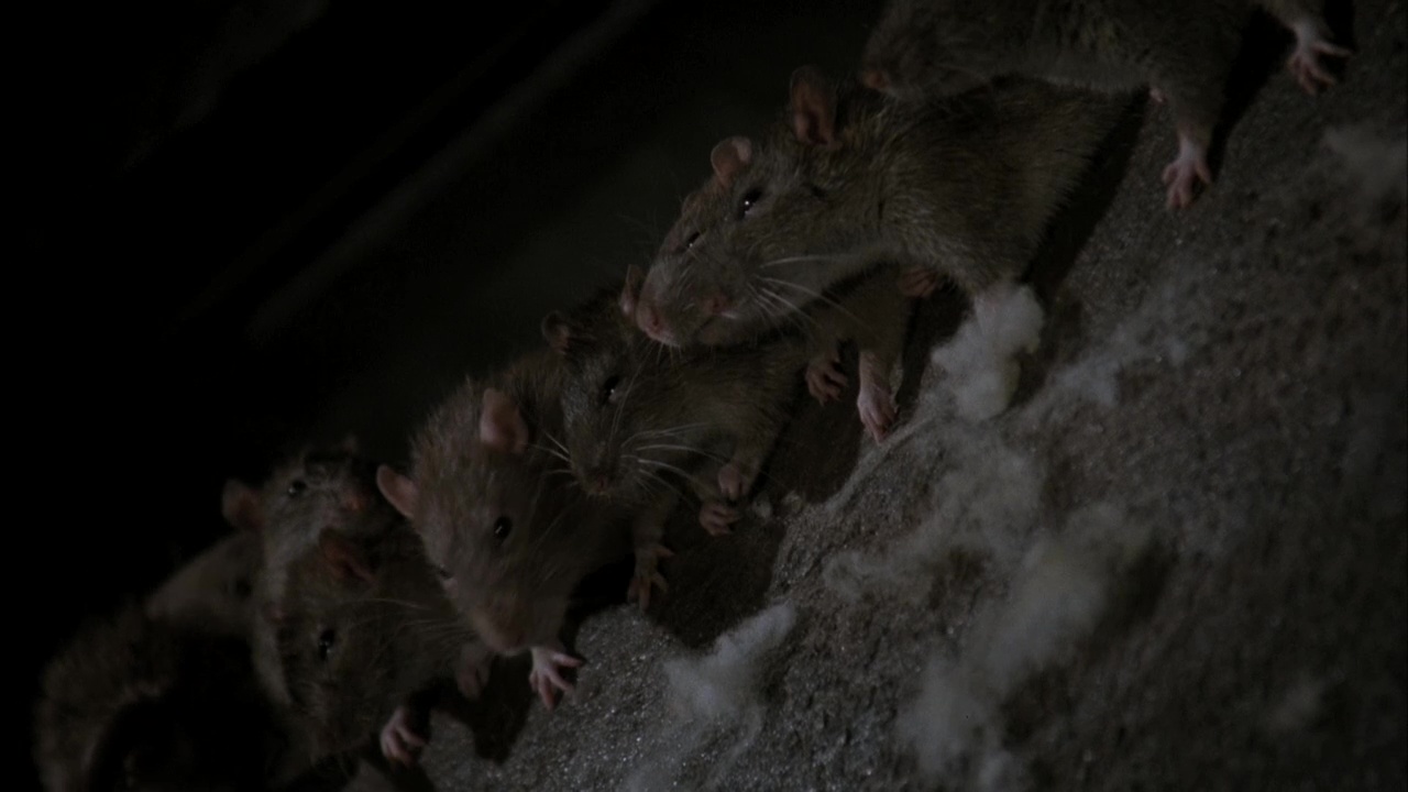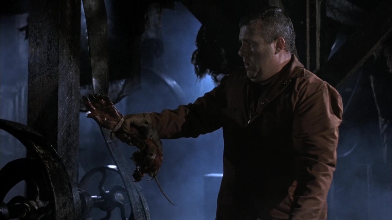 John Hall arrive dans cette ville, et il a de la chance, car une place vient tout juste de se libérer dans l’usine après un malheureux accident. Si ses collègues ne l’apprécient pas forcément, et que le patron, Warwick, est ce qu’on peut littéralement appeler un connard, tout pourrait se passer comme sur des roulettes, si ce n’est que l’usine est infestée de rats, et qu’une créature à moitié rat et à moitié chauve-souris à établie son nid dans les souterrains du cimetière à côté. Comme il faut ici adapter une nouvelle, l’intrigue va prendre son temps, et durant la première moitié, la créature se fera très discrète, le scénario préférant s’axer sur autre chose, à savoir le quotidien des ouvriers et leurs conditions de travail. C’est-à-dire des conditions bien merdiques, avec des horaires de nuit (le fameux Graveyard Shift du titre original, allant de 23h à 7h du matin), des lieux infestés de rats, l’humidité, des lieux pas forcément très stables et un bordel ambiant pire que la chambre d’un enfant qui aurait refusé de ranger. On découvre nos personnages, on apprend à détester le patron, utilisant ses employés, les manipulant, et on découre donc le fameux dératiseur qui en fait des tonnes, à savoir ce bon vieux Brad Dourif. Et contre toute attente, le métrage se fait plutôt prenant. Classique, sans surprise, lent à démarrer, mais plaisant. Les décors sont franchement réalistes, les acteurs fournissent le boulot, les rares meurtres sont plutôt sanglants, l’ambiance poisseuse fonctionne bien. Ce n’est pas du grand cinéma, l’écriture n’est pas merveilleuse, mais l’ensemble fonctionne et La Créature du Cimetière est une série B certes comme les autres, mais plutôt solide.