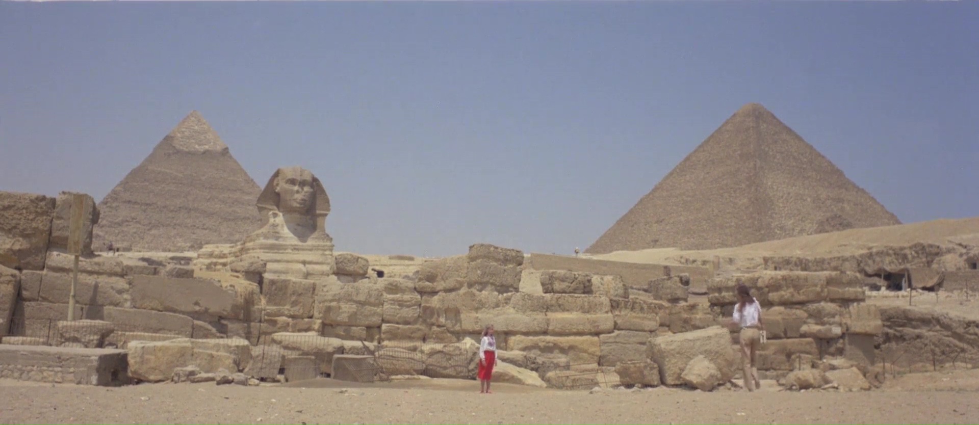 À défaut d’être vraiment une bonne année, 1982 fut une année importante pour Fulci, puisqu’après déjà plusieurs collaborations avec le producteur Fabrizio de Angelis, notamment sur L’Enfer des Zombis, L’Au-Delà et La Maison Près du Cimetière, les deux hommes mettront fin à leur collaboration avec deux films incroyablement différents, deux films qui séparent radicalement les deux aspects principaux caractérisant le cinéma de Lucio Fulci depuis 1979, et donc, caractérisant aussi son succès à l’international. D’un côté, Fulci livre L’Éventreur de New York, sorte de slasher/giallo ultra violent et frontal, mais également très froid, laissant donc au placard l’ambiance que l’on connaît, et de l’autre, il y a ce film. Un film qui a très longtemps hanté ma collection, et ma cinéphilie. Non pas que je le jugeais mauvais, mais parce qu’il était dans ma collection depuis la sortie du dvd, donc il y a bien 13 ans de ça au moins, mais que je n’avais jamais réussi à arriver au terme de la vision du film. La Malédiction du Pharaon m’a toujours profondément ennuyé. Aujourd’hui, le mal est réparé, j’ai vu le film, d’une traite, en entier. Et bien c’était sacrément chiant ! On peut même affirmer sans se tromper que La Malédiction du Pharaton, appelé au départ Manhattan Baby, est bien le point de rupture de la carrière de monsieur Fulci. Et pourtant, tout n’est pas à jeter. Notamment techniquement. Et le pire dans tout ça, c’est que la scène d’ouverture, en Égypte forcément pour justifier le titre, et bien elle fonctionne super bien. On reconnaît immédiatement la patte de Fulci dans la mise en scène, dans la façon de poser une ambiance, dans le montage alternant des plans désertiques larges et des plans beaucoup plus serrés sur les yeux.