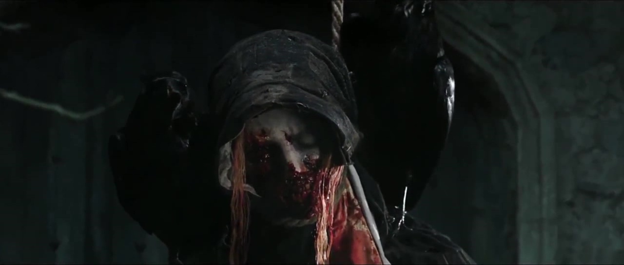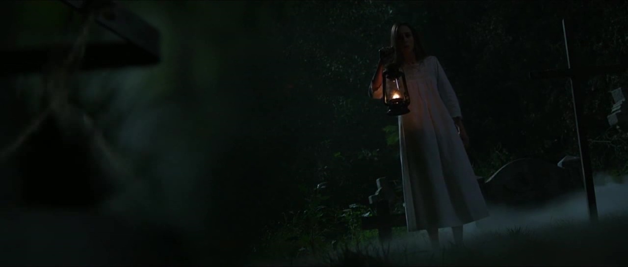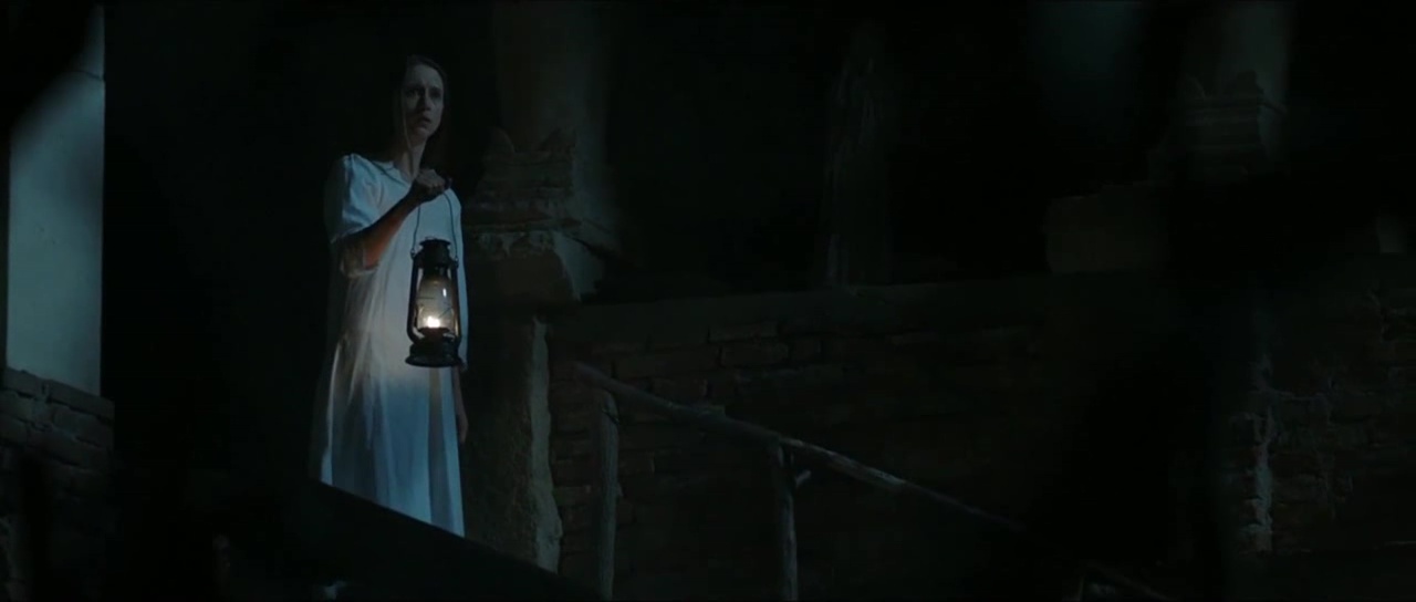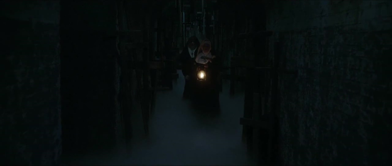 L’histoire se déroule donc bien avant les Conjuring et même avant les Annabelle (bien que je n’ai pas vu le second opus, apparemment bien supérieur au premier). Et dés la scène d’ouverture, chose confirmée par la suite par les révélations de l’intrigue, La Nonne a su brosser le vieux spectateur trentenaire que je suis dans le sens du poil. Une porte cachée dans une abbaye, deux nonnes, une clé, puis une mort gentiment sanglante, une pendaison et l’apparition de la fameuse Nonne. Oui, immédiatement, mon cerveau se sera posé une question. Accident ou hommage. Une Nonne se suicidant par pendaison, amenant ainsi un esprit maléfique sur les lieux, ça ressemble comme deux gouttes d’eau à Frayeurs de Lucio Fulci. Alors quand peu de temps après, le film nous balance une autre scène rappelant Frayeurs à 200%, avec un prêtre enterré vivant et qui sera sauvé in-extremis à coup de pelle traversant le cercueil, le doute n’est plus permis. Et en fait, tout dans la Nonne respire cet amour du cinéma bis des années 60 à 80, avec du Fulci, mais également beaucoup de la Hammer et de Mario Bava. Des apparitions spectrales en fond, une abbaye imposante filmée en contre plongée, un vieux cimetière baignant dans la brume… La Nonne est une déclaration d’amour au cinéma de genre d’autrefois, et donc s’adresse en particulier aux spectateurs cinéphiles ou ayant connu cette époque malheureusement résolue. En ce sens, c’est une de ses forces, force qui se retrouve décuplée par le formidable travail visuel effectué sur le film. Ça en jette, Maxime Alexandre (Haute Tension, La Colline a des Yeux, Silent Hill Revelations) à la photographie livre un travail étonnant et magnifique pour les yeux. Les éclairages, les jeux d’ombres, les silhouettes, c’est parfait jusqu’à certains mouvement de caméra mettant parfaitement en valeur les majestueux décors.