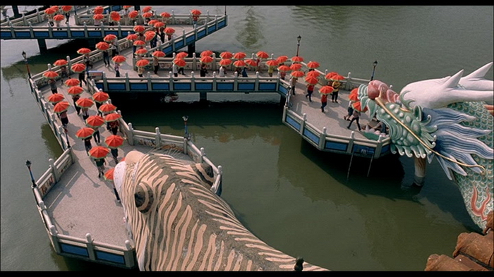 THE WAYWARD CLOUD emprunte donc à peu près le même schéma : des problèmes naturels liés aux activités humaines frappent Taiwan (cruel manque d’eau potable), les gens errent désabusés et en manque d’inspiration, et donc pour éclairer quelque peu le tout on nous propose des scènes musicales absolument rayonnantes de bonne humeur. Certes les chorégraphies n’ont rien de génial, il y a pas mal d’approximation, mais là n’est pas la question. Seule la gaieté est importante, et dans ces moments là on la compte par kilos entiers. Malgré sa lenteur (les anti Tsai Ming-Liang peuvent circuler ils n’apprécieront sans doute pas le film à sa juste valeur), THE WAYWARD CLOUD distille de furieux moments de franche rigolade, un humour pince sans rire qui m’a parfois totalement retourné. Bien évidemment, il est recommandé de voir les films de Tsai Ming-Liang dans l’ordre chronologique pour comprendre l’évolution que connaît le personnage de Hsiao-Kang, et surtout pour ne pas passer à côté de tous ces détails qui renvoient aux films passés (une partenaire de Hsiao-Kang, entendez par là une actrice porno taiwanaise, est quand même interprétée par Lu Yi-Ching, qui jouait la mère du même Hsiao-Kang dans les autres films de Tsai Ming-Liang…).