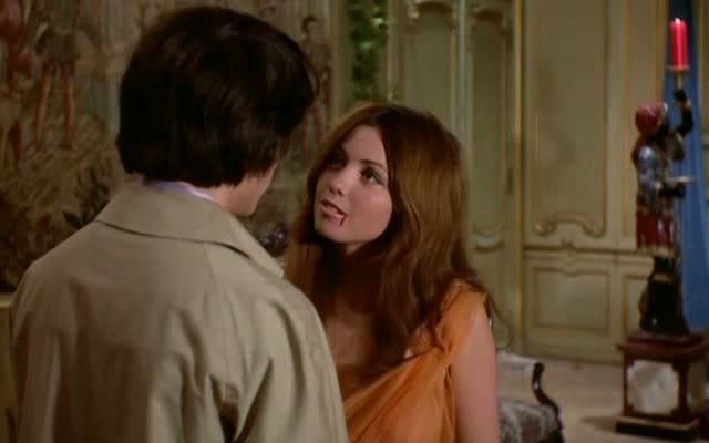Dès le plan d’ouverture, Rollin veut nous imprégner d’une ambiance étrange, poétique, pleine de mystère. Une fille nue est dans une pièce où des hommes portant des masques d’animaux lui prélèvent du sang. Aucun dialogue. S’ensuit le générique, puis nous retrouvons notre jeune femme (jouée par Caroline Cartier, possédant un charme certain dans son regard) fuyant les hommes aux masques d’animaux dans la rue, et tombant sur Pierre, qui va tenter de la sauver. La jeune femme se fait tirer dessus, et Pierre s’enfuit. Toujours aucun dialogue. Juste une musique étrange et de très beaux plans. Pierre va suivre les hommes et découvrir que la jeune femme n’est pas morte, et a été emmenée dans un hôtel géré par son père. S’ensuit une histoire pleine de bonnes intentions et souvent gâchée par une exécution loin d’être parfaite. Car déjà, pour ce qui est de son titre, oui de la nudité, il y en aura, Rollin aimant s’attarder sur les corps dénudés de ses actrices (mais en évitant une certaine vulgarité, donc ça passe), mais l’aspect vampirique sera plutôt absent. Si les personnages croient que la jeune femme est une vampire et la protègent donc du soleil et lui donnent du sang, elle n’a pas de dents longues, ne vide pas ses victimes de leur sang, ne se change pas en chauve-souris ou autre clichés du genre.