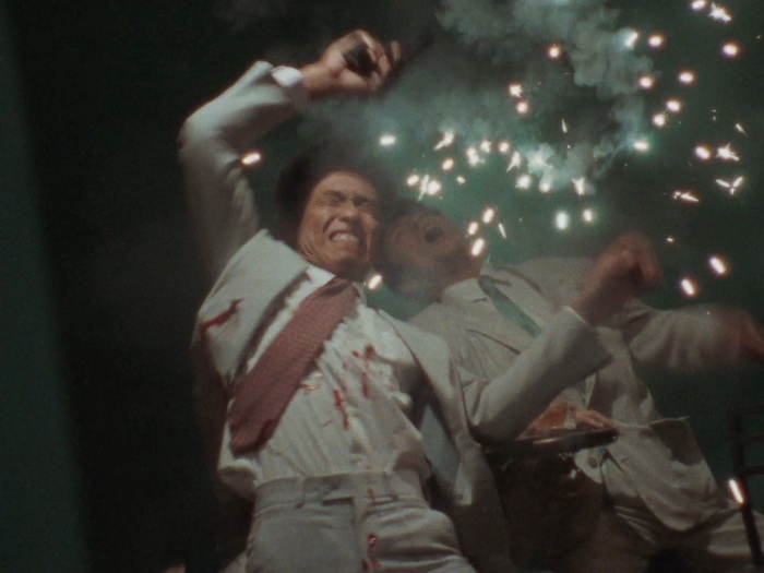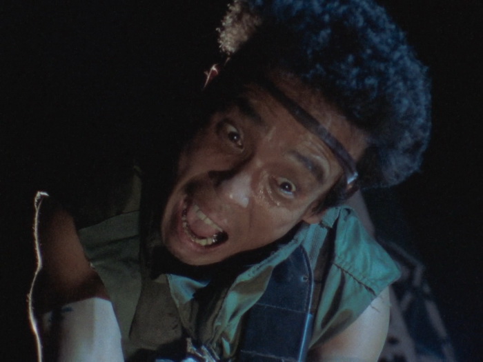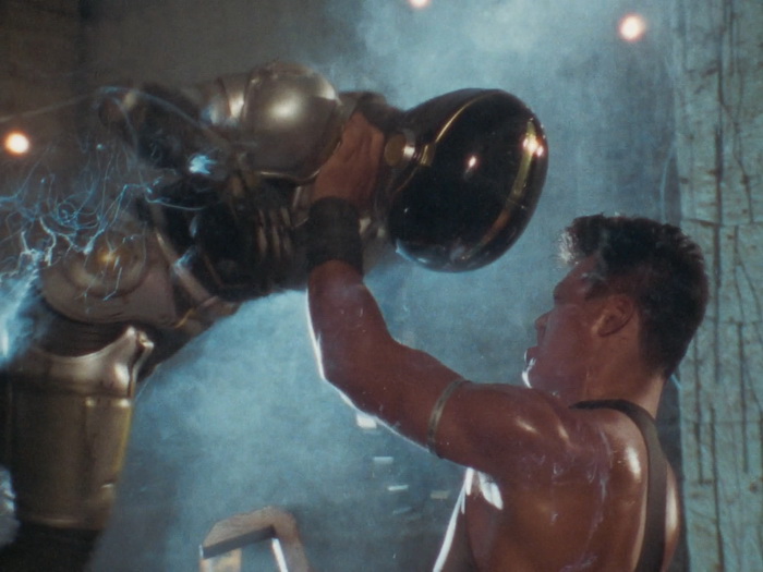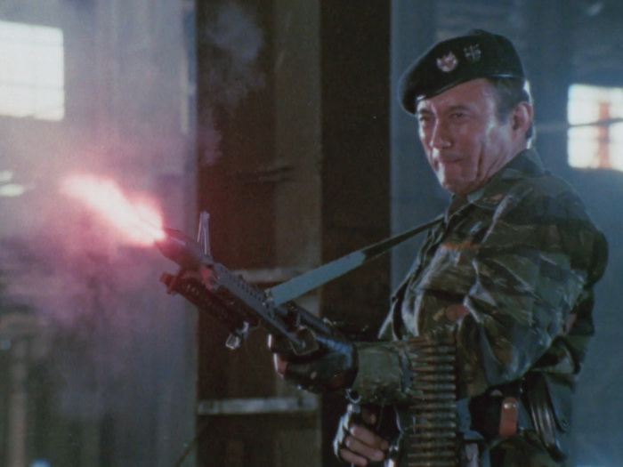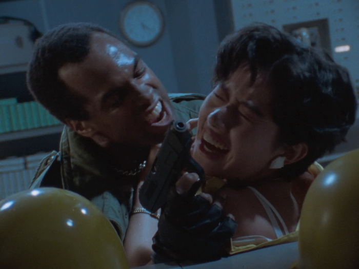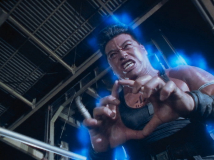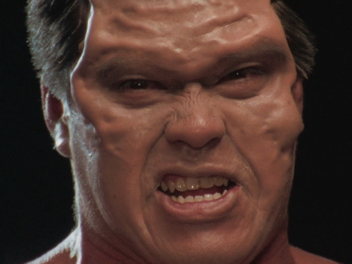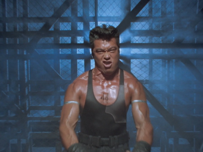 Il n’y a pas grand-chose qui tient objectivement la route et pourtant l’ensemble fonctionne étonnement bien car le tout que l’ensemble forme est parfaitement homogène. Les acteurs surjouent au possible, on sent les limites du maigre budget sur chaque plan, les effets spéciaux font délicieusement sourire, il y a des trous béants dans le scénario avec une profondeur de personnages laissée aux oubliettes, la musique jazzy semble parfois provenir d’un boulard des 80’s, il y a des incohérences, mais ça fonctionne ! Ça fonctionne car on sent une envie de bien faire les choses avec les moyens du bord. C’est, mine de rien, bien réalisé, c’est généreux car ça veut en donner pour son argent au spectateur, c’est plein d’idées funs, ça n’hésite pas à verser dans la violence sanglante quand nécessaire, ça va direct à l’essentiel (le film dure 1h23 génériques compris), et puis il y a un des méchants improbable absolument génial. Imaginez une sorte de Schwarzenneger bodybuildé télékinésiste télépathe qui passe son temps à grogner, à grimacer, à gonfler à mort sa musculature en ayant toujours l’air d’être très énervé et d’avoir envie de faire caca. Ajoutez à cela des gros plans très réguliers sur son visage qui se déforme, avec des veines qui pulsent, un peu à la manière de Ken le Survivant lorsque les méchants sont près à exploser, et le plaisir n’en est que décuplé. Les maquillages sont à l’image du reste, kitch mais pourtant réussis dans leur genre et au final, on s’amuse, on s’amuse énormément sur Lady Battle Cop. En fait, c’est comme un gros bonbon plein de couleurs bien chimiques : on sait qu’il ne faut pas le manger parce que ça va te bousiller les dents et te faire grossir, mais on le mange quand même parce que c’est trop bon.