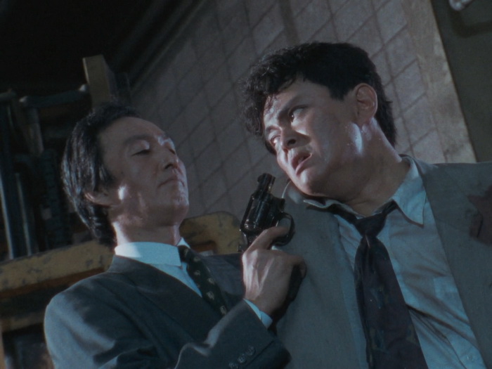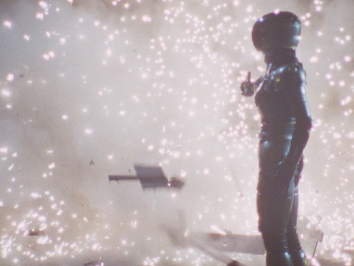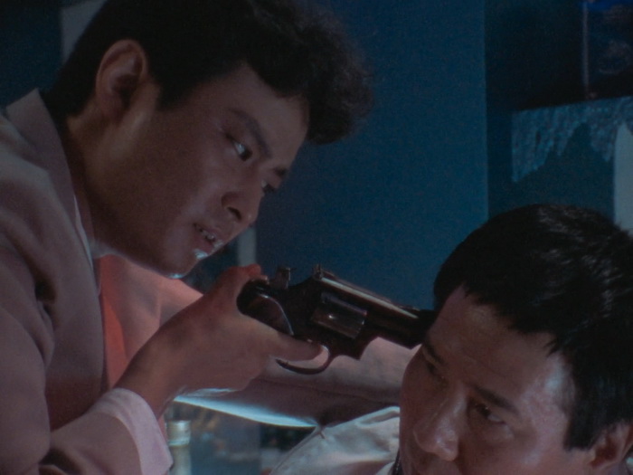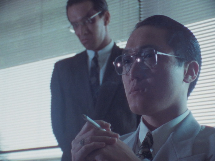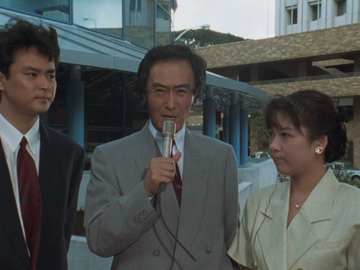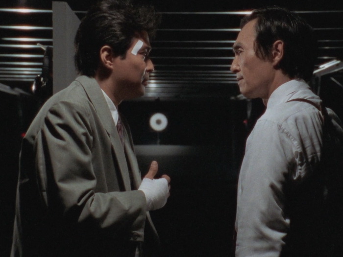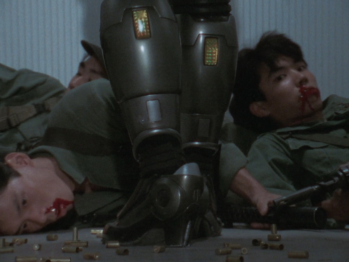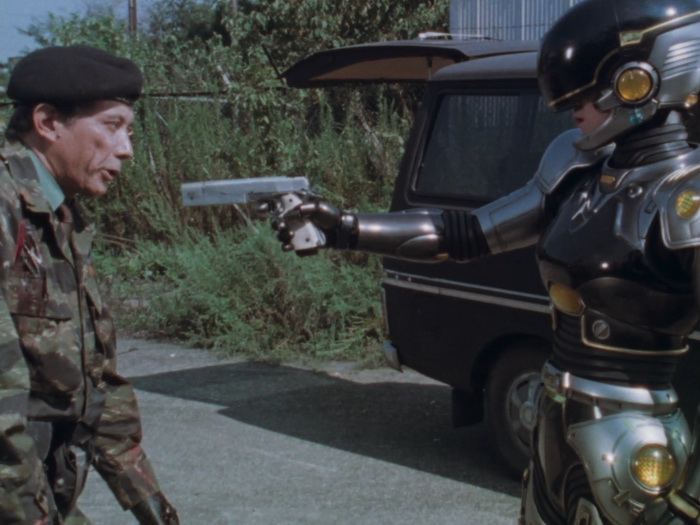 Il y a clairement dans Lady Battle Cop des similitudes avec le Robocop de Verhoeven. Le film de Okamoto s’ouvre de la même façon. Dans les deux films, le personnage principal devient un cyborg après sa mort. Même si le ton est différent, chacun critique le pouvoir en place, le capitalisme et les médias dans le film US, le militarisme et le pouvoir en place qui ne fait rien pour régler les problèmes dans le film japonais. Bien que plus poussée dans Robocop, il y a également dans Lady Battle Cop une réflexion sur l’identité. Les cyborgs aussi ont quelques points communs, avec par exemple ce casque qui laisse entrevoir le bas du visage ou ce pistolet caché dans la jambe droite dans les deux cas. Mais au final, avec son ton et son contexte culturel différent, le film d’Akihisa Okamoto trouve sa propre voix et semble bien plus imprégné par le tokusatsu et l’animation, sorte de prolongement de ce qui se faisait déjà dans les décennies précédentes au Japon. Ici, notre Lady Battle Cop n’est pas une policière mais une ancienne joueuse de tennis qui va se faire justice elle-même en se vengeant de ceux qui ont provoqué sa mort, un cartel qui fait sa loi dans Neo-Tokyo. Mais difficile de conseiller le film aux amateurs du policier justicier de Détroit et Lady Battle Cop est clairement à réserver à d’autres publics, soit les amateurs de toku, soit les amateurs de bobines lowcost hongkongaises des années 80, soit aux friands de bisseries. Le costume cybernétique de notre cyborg a été désigné par Keita Amemiya et est à la fois ringard et très travaillé. Ringard car les talons hauts et la boucle d’oreille, était-ce réellement nécessaire ? Il n’y a pas besoin de ça pour comprendre que c’est une femme à l’intérieur. Très travaillé car il fourmille de détails et de bonnes idées (certes peu exploitées) et que dans son ensemble, il a quand même de la gueule et les scènes où elle arrive au premier plan depuis l’arrière-plan ont pas mal de gueule. Pour le reste, on est au royaume de la débrouille et de la kitcherie pour le plus grand plaisir des amateurs qui s’amuseront comme des petits fous.