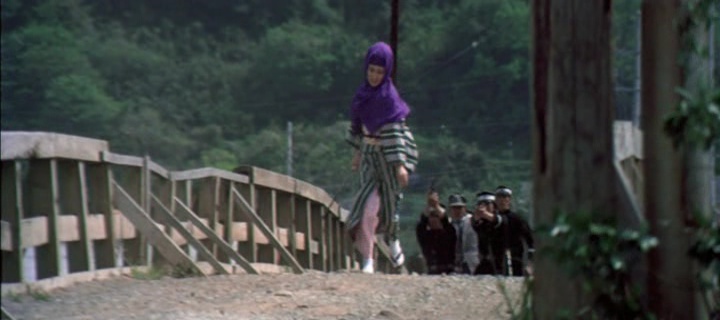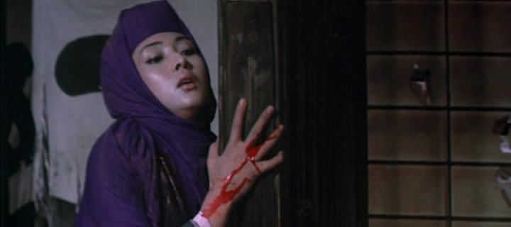 Le premier Lady Snowblood est un film que j’adore, voir un de mes films cultes des années 70, et il m’avait permis de découvrir Kaji Meiko, également une de mes actrices préférées de ces années là, avec un bon nombre de films cultes (pour Fukasaku notamment) et de rôles cultes (Lady Snowblood, et Sasori surtout). Mais je n’avais jamais vu ce second Lady Snowblood. Peut d’être déçu sans doute, il faut dire que la saga ne compte que deux opus, et que l’histoire du manga avait été racontée dans le premier film, la vengeance de Yuki était accomplie. Mais voilà, Sasori, pour Kaji Meiko en tout cas, c’était terminé depuis 1973, année du premier Lady Snowblood, avec un quatrième opus en dessous des trois premiers (et réalisé ce coup-ci par Hasebe Yasuharu) mais malgré tout sympathique. Son rôle le plus iconique était achevé, tout comme la saga Stray Cat Rock (les 4 films sont sortis entre Mai et Novembre 1970). L’actrice reprend donc le rôle de Yuki dés 1974 pour cette suite, qui est, il faut bien le dire, largement inférieure au premier film, tout en bénéficiant du même soin, du moins dans le visuel, Fujita Toshiya rempilant à la mise en scène. Rien à dire d’ailleurs à ce niveau là, la mise en scène est toujours excellente, et c’est toujours un plaisir de retrouver l’actrice. Là où ça coince, c’est plus au niveau du scénario, qui a pourtant des ambitions et des éléments intéressants, mais qui s’avère bien moins prenant que le premier film. Sa vengeance accomplie, Yuki est arrêtée et doit être exécutée. Le début du film commence fort, et fait bien le lien avec le premier. Nombreux sont ceux qui veulent arrêter Yuki, et toujours dans de longs plans séquences filmés caméra à l’épaule, la jeune femme va trancher des hommes, offrant de la violence pure et dure, parfois épurée, parfois grotesque.