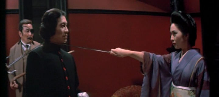 Mais voilà, la jeune femme est condamnée, dépose le sabre, mais se voit libérée par la police secrète qui lui donne une mission en échange de sa vie : celle de surveiller et d’éliminer des révolutionnaires. Ce qui coince aux premiers abords, ou du moins, donne moins de force aux événements, c’est clairement que les motivations de Yuki sont moins personnelles. Elle ne cherche pas à se venger. Elle obéit à des ordres pour échapper à la peine de mort. S’il n’y avait qu’au niveau des motivations. Le souci d’un tel scénario, c’est qu’après la vengeance pure et dure, ultra rythmée et clairement d’exploitation du premier film, Lady Snowblood 2 se fait moins intéressant, tout en étant, paradoxalement, plus développé dans le fond, se permettant clairement une critique sociale, notamment envers les forces de l’ordre. C’est intéressant oui, sans doute plus profond que le premier film, mais plus déséquilibré également. Le premier point qui fâche, malgré la prestance de l’actrice, c’est clairement que Yuki ne peut être vue pendant les 3 quarts du temps que comme un personnage secondaire du métrage, et surtout extérieur à l’intrigue. Durant toute la première moitié en tout cas. Il faut attendre un peu plus de la moitié du métrage pour que Yuki change, et prenne parti pour ceux qu’elle devait éliminer, et se retrouve alors un rôle clairement plus actif au sein de l’intrigue, et reprenne le sabre. Là où dans le premier, les affrontements sanglants étaient au service de l’évolution du personnage, et de l’iconification de ce personnage, le tout avec poésie, ici, les affrontements seront clairement au service de l’intrigue, et donc, du discours social de celui-ci.