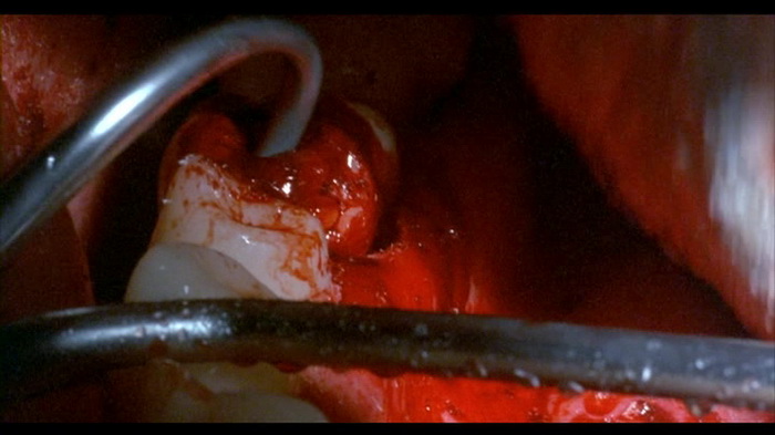 Les bons points du Dentiste 2, c’est clairement dés le départ que Yuzna a reprit bien entendu Corbin Bernsen pour le rôle titre, mais également qu’il ne s’attarde pas sur les éléments les plus grotesques de son intrigue, à savoir l’évasion de l’asile par son docteur. C’est gros, pas très crédible, pas forcément intéressant non plus, et cet aspect est torché en une scène pour que l’on retrouve notre docteur dans une nouvelle ville, à se construire une nouvelle vie. Les autres bons points, d’ailleurs nécessaires à une bonne suite, c’est que l’on connait déjà notre personnage principal, ainsi que quelques secondaires (sa femme, gravement blessée dans le premier film, est de nouveau là). Du coup, l’intrigue débute rapidement, le spectateur sait à quoi s’attendre, et notre brave dentiste fait tout son possible pour calmer ses pulsions. Mais malgré de bonnes scènes, et quelques scènes gores qui font toujours mal, Le Dentiste 2 ne parvient jamais à faire aussi bien que son ainé, même si celui-ci était déjà bancal sur certains aspects. L’intrigue est en soit moins intéressante déjà, l’effet de surprise n’est plus là, surtout que Yuzna et son équipe réutilisent le même procédé que le précédent en ce qui concerne les scènes gores, et beaucoup trop de scènes ramènent inlassablement à l’original. Car oui, la raison du nouveau pétage de plombs du dentiste, ce sera encore et toujours ses deux soucis principaux, à savoir la propreté (de manière générale) et les femmes. Ahlala, pas de bol ce pauvre Feinstone…. Je veux dire Caine. On pourra également regretter malgré tout que suite oblige, et donc, nécessité d’en faire plus oblige, le film prenne souvent la voie de l’humour.