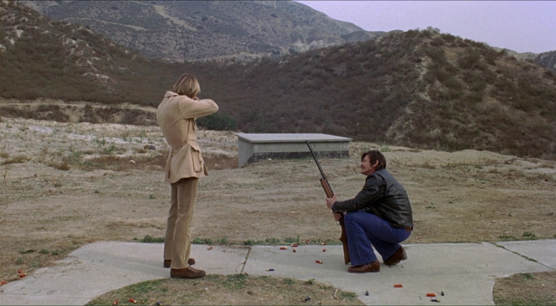 Le genre de mise en bouche qui met en confiance, et annonce la couleur. Le Flingueur est un film froid, calculateur, tout comme son personnage principal, Arthur Bishop. Vivant seul, dans sa grande maison, silencieux, parlant juste pour dire ce qui doit être dit. Un homme appliqué, qui sait et qui aime prendre son temps pour être sûr de contrôler son environnement, et la plupart du temps donc, sa cible. Un homme qui a de la bouteille, et une vision bien définie du monde qui l’entoure. Quand on lui donne un nouveau contrat, qui est d’éliminer une personne qu’il connait bien, puisque cette personne lui donne également du travail, Bishop s’exécute. Après tout, c’est tout ce qu’il sait faire. Exécuter les ordres et ses cibles, sans poser de questions, sans ressentir quoi que ce soit. Et c’est là que tout change pour lui, puisqu’il prendra sous son aile le fils de sa cible, joué par le jeune Jan Michael Vincent (Supercopter, ou le chef d’œuvre X-Tro 2). Et il y a là pas mal de choses intéressantes. Car autant dans son scénario, Le Flingueur est un petit polar tout ce qu’il y a de plus classique, avec le tueur à gage formant la relève, autant au niveau des personnages, et donc dans la profondeur du film, le métrage s’avère riche, de sens, de degrés de lectures, et de sous entendus. Si le scénariste lui-même pense que tout le propos homosexuel est absent du métrage, je le trouve pour ma part pourtant bel et bien présent. Que ce soit dans certains regards que Steve balance à Bishop, regards silencieux, perçants, presque de désirs. Et cela semble mettre Bishop à l’aise, celui-ci n’hésitant pas à ouvrir à son nouvel élève qu’il connaît à peine dans un vieux peignoir. Mais outre cela, il y a clairement une relation père fils entre les deux. Steve se cherche un nouveau père après la mort du sien, tandis que Bishop le prend sous son aile. Par pitié ? Par souci d’humanisation ? Par solitude ? Peut-être les trois après tout, lui qui va jusqu’à payer une prostituée pour qu’elle lui écrive des lettres d’amour, lui donnant alors l’impression d’avoir une vie presque normale, lui qui passe pourtant ses journées seul.