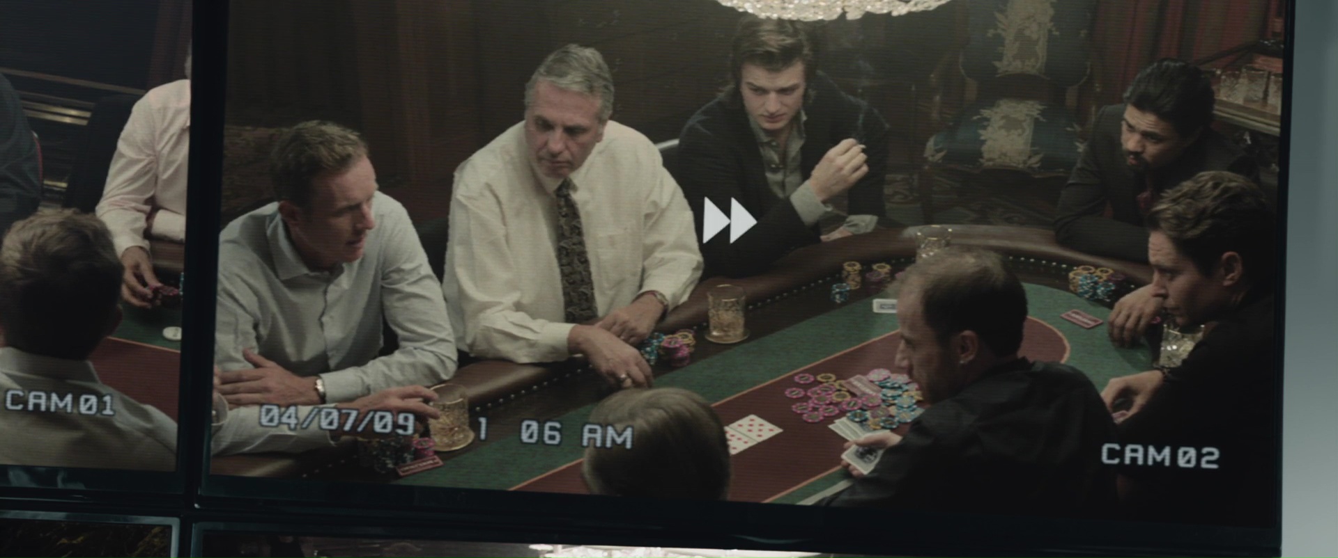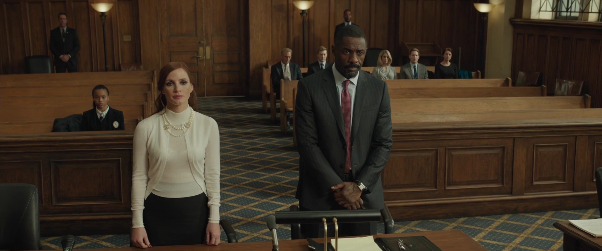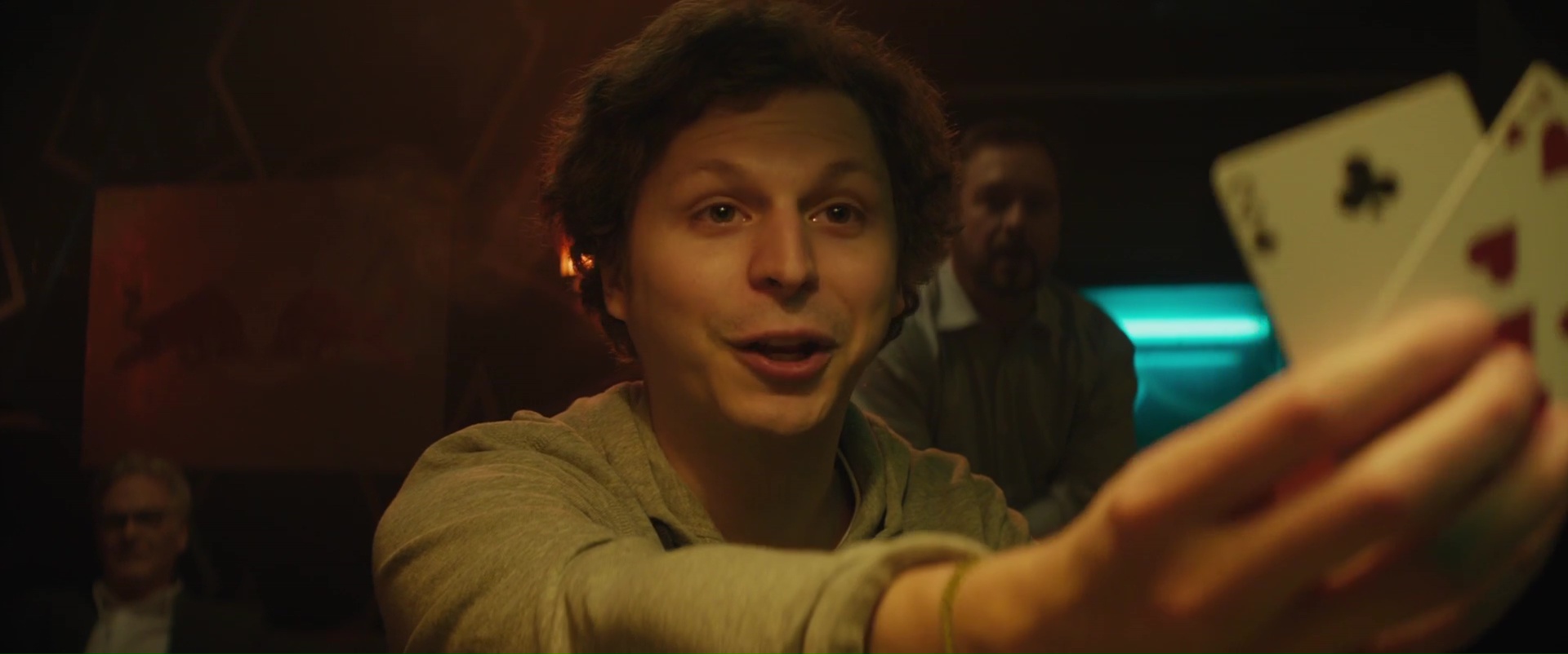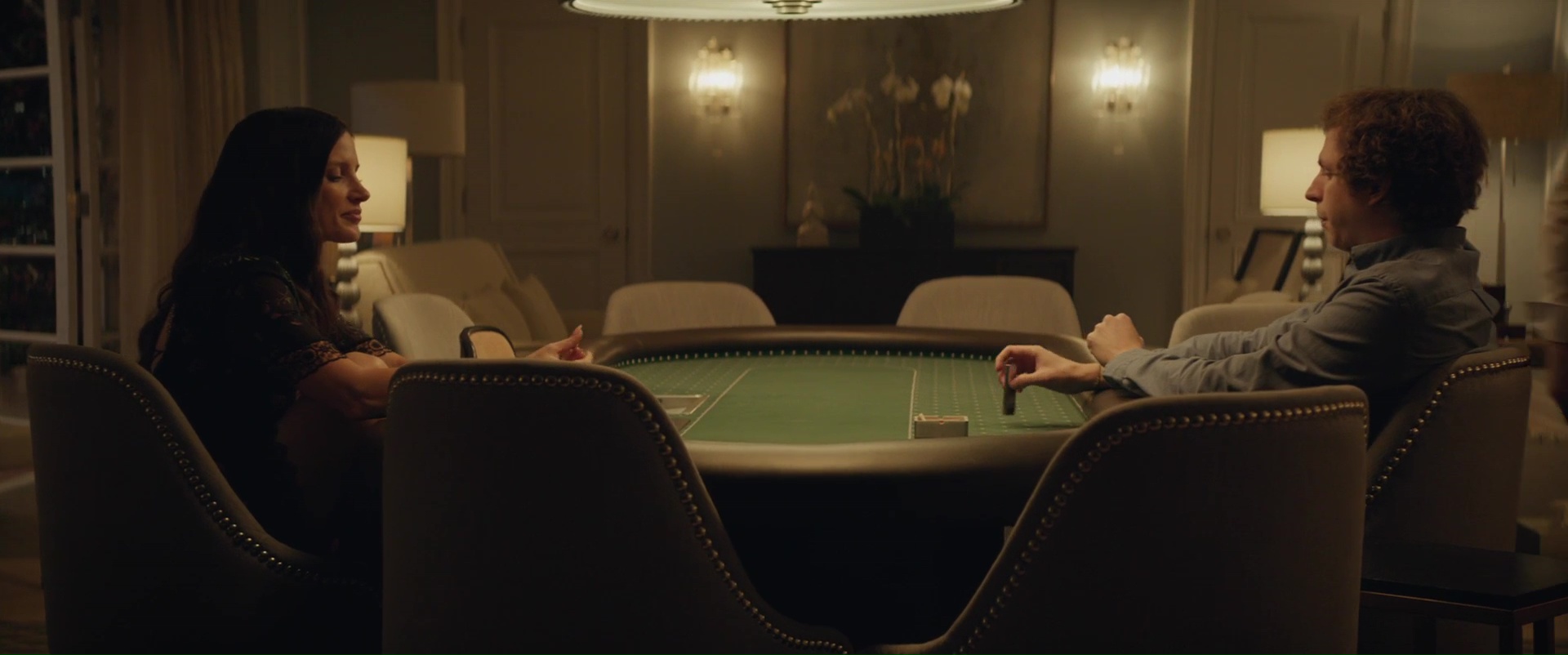 Mais ce qui fait de ce Molly’s Game un bon biopic finalement, ce n’est pas forcément son sujet, ou le parcours de son héroïne, classique, mais bel et bien la plume de son auteur dans un premier temps. Les dialogues sont ascérés, parfois percutants, parfois amusants, et cela laisse les acteurs s’exprimer. Bon point, puisque le casting est aussi une réussite. Comme pour Social Network d’ailleurs, Aaron Sorkin divise son intrigue suivant trois temporalités. Il y a la jeunesse de notre personnage, et ses conflits avec son père (le trop rare Kevin Costner), puis les débuts à Los Angeles et son ascension dans le milieu, et enfin, les soucis de justice, où Molly va s’allier avec son avocat. Trois temporalités qui vont se mélanger, s’alterner, parfois se faire des jeux de miroir. Rien de neuf bien entendu, mais on peut dire que ça fonctionne, puisque Aaron Sorkin sait écrire. Et il a embauché de biens bons acteurs pour les rôles importants. Jessica Chastain est toujours juste dans le rôle de Molly, Kevin Costner est donc convaincant même si souvent en retrait dans le rôle du père. Mais il ne faut pas oublier les deux autres personnages les plus importants de l’intrigue, à savoir, l’avocat, et celui qui sera nommé Joueur X. L’avocat, ce sera Idris Elba, toujours juste, rien à redire. Le Joueur X, pour quiconque connait un peu l’histoire vraie (ou quiconque fouillera un minimum, comme moi), ce n’est pas bien difficile de savoir de quelle personnalité importante il s’agît, même si le film a quelque peu adoucit certains événements. C’est Michael Cera qui s’y colle. Lui qui parait par moment si gentil, comme dans Juno ou Scott Pilgrim, il avait déjà prouvé par le passé qu’il pouvait jouer des personnages plus troubles, comme dans Magic Magic. Ici, il joue tout simplement un enfoiré, qui dit clairement les choses. Son but n’est pas tant de gagner face à son adversaire. Non, ce qui lui plait, c’est tout simplement de ruiner la vie des autres.