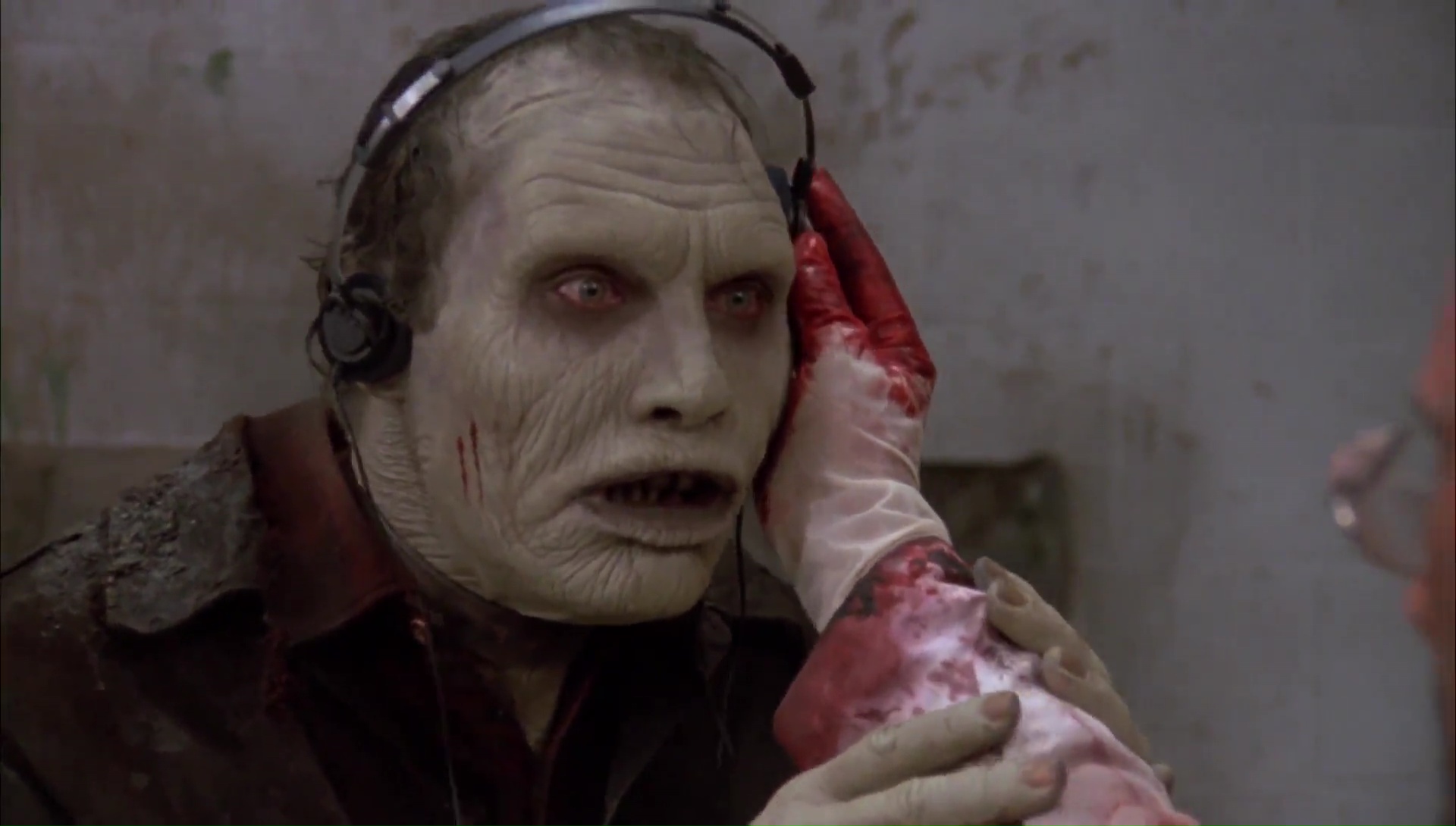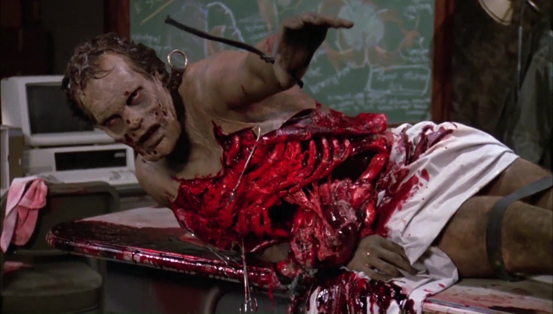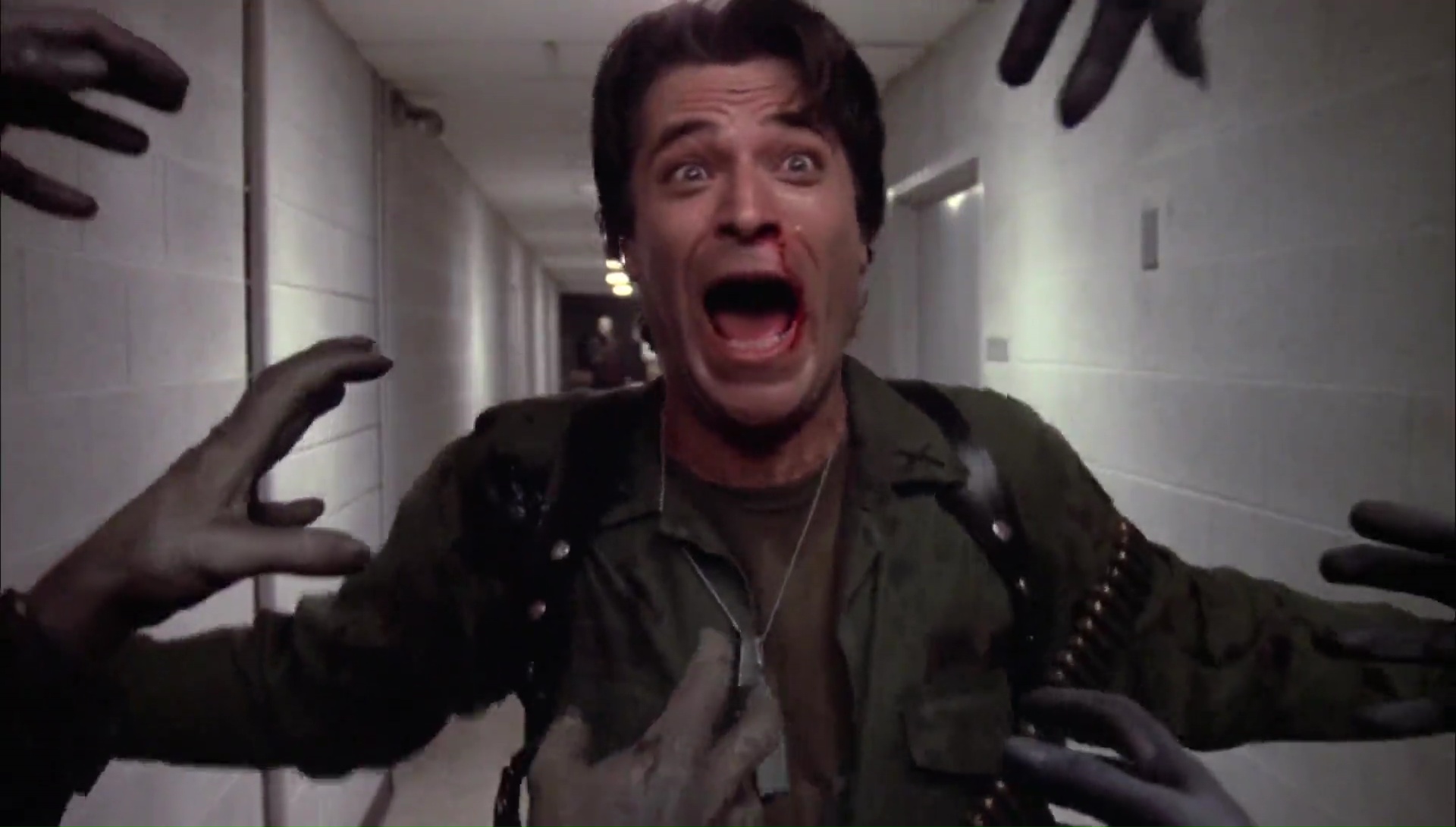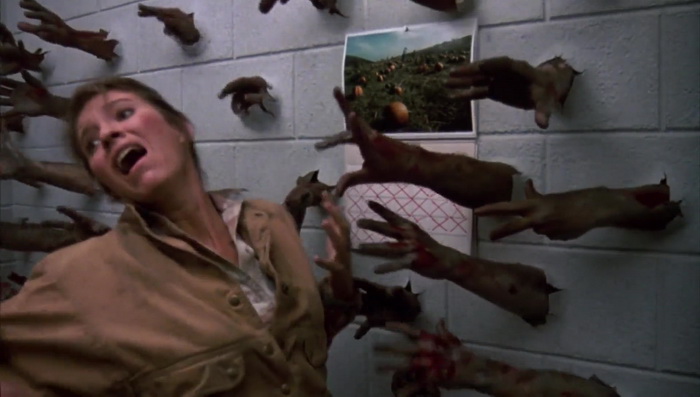 Le Jour des Morts-Vivants et moi, nous avons toujours eu une relation difficile qui date d’il y a des années. J’étais jeune, très jeune, trop jeune d’ailleurs, lorsque j’avais vu Zombie sur Canal +. Mes petits yeux innocents avaient été choqués, extasiés, j’avais adoré, c’était un film culte, un film puissant, hautement divertissant et portant un message sur notre société. Du pur Romero donc. Dans la foulée, j’avais pu me procurer en VHS ce fameux Jour des Morts-Vivants, espérant y trouver la même formule. Sauf que Le Jour des Morts-Vivants ne contient pas la même formule, il se base sur l’ambiance, sa première heure est très calme et se focalise avant tout sur les humains, deux groupes d’humains, des scientifiques et des militaires. Si bien que la jeune personne que j’étais avait été déçue, avais rangé la VHS et ne l’avais pas ressorti, restant sur un mauvais souvenir durant 20 ans. Le film me faisait peur. Mais face ces derniers temps à pas mal de gens qui m’encourageaient à retenter l’expérience, je me suis laissé tenté, pas plus tard qu’hier soir. Préjugés de côté, mon chat sur les genoux, les cigarettes à portée de main, et c’était parti pour Le Jour des Morts-Vivants, séance de rattrapage 20 ans après la première vision, passant de la qualité VHS en VF à la qualité Blu-Ray en VO par la même occasion. Je devais bien ça à Romero après tout qui nous a quitté récemment. Et en seulement une scène, je me suis dis que j’avais vraiment du passer à côté de quelque chose, que j’étais sans doute trop jeune pour le spectacle que Romero voulait nous proposer en 1985. Quelques notes de musique au synthé du fidèle John Harrison (qui réalisera plus tard Darkside produit et écrit par Romero), une ambiance froide avec une photographie grisâtre du tout aussi fidèle Michael Gornick (futur réalisateur de Creepshow 2, également produit par Romero), pour une scène de cauchemar qui représente parfaitement l’ambiance du métrage.