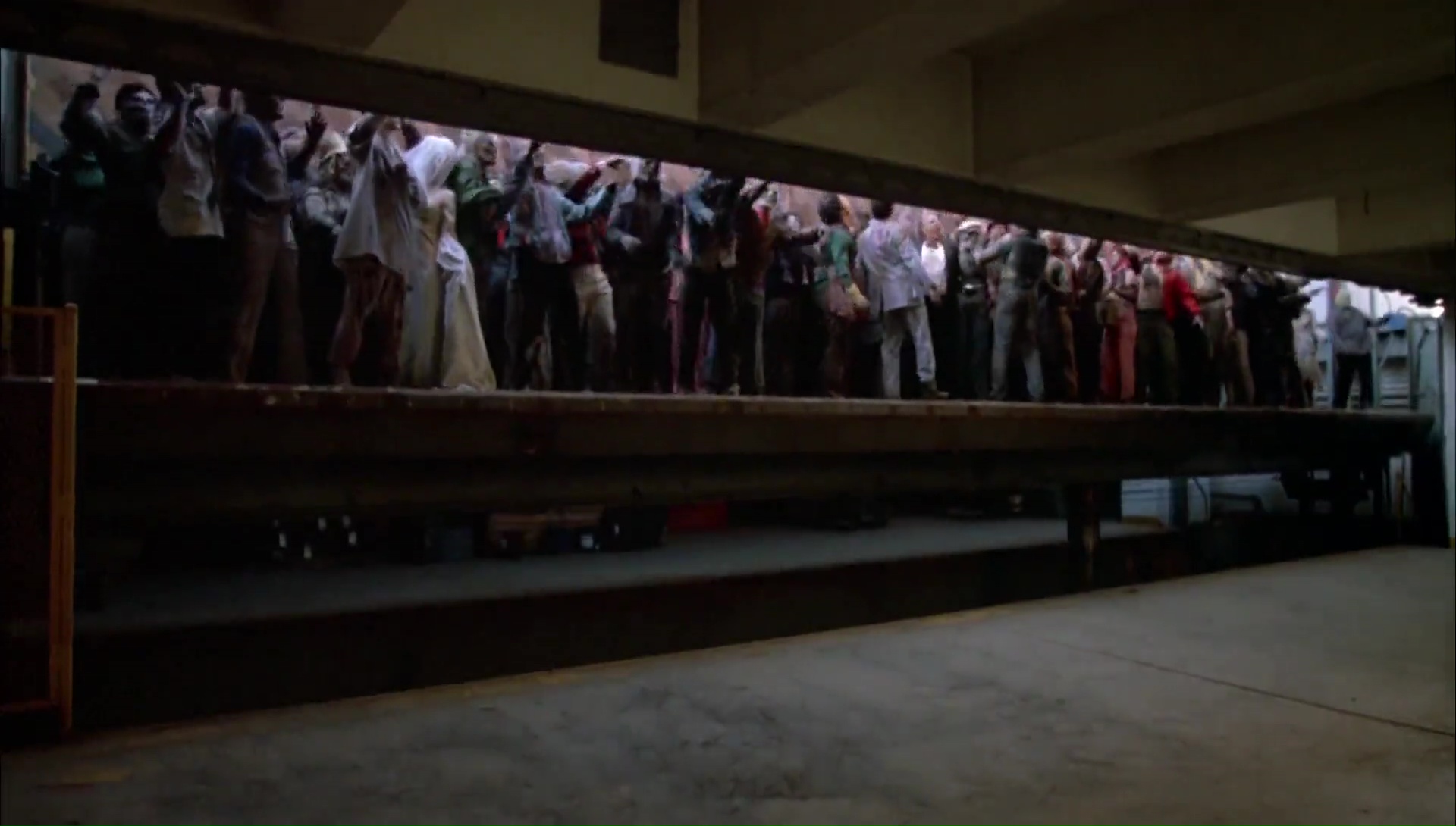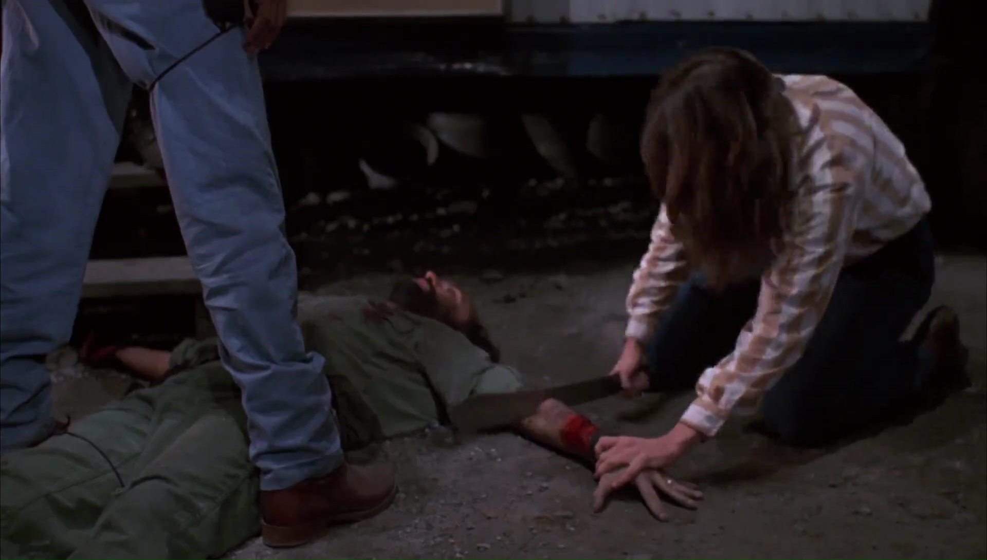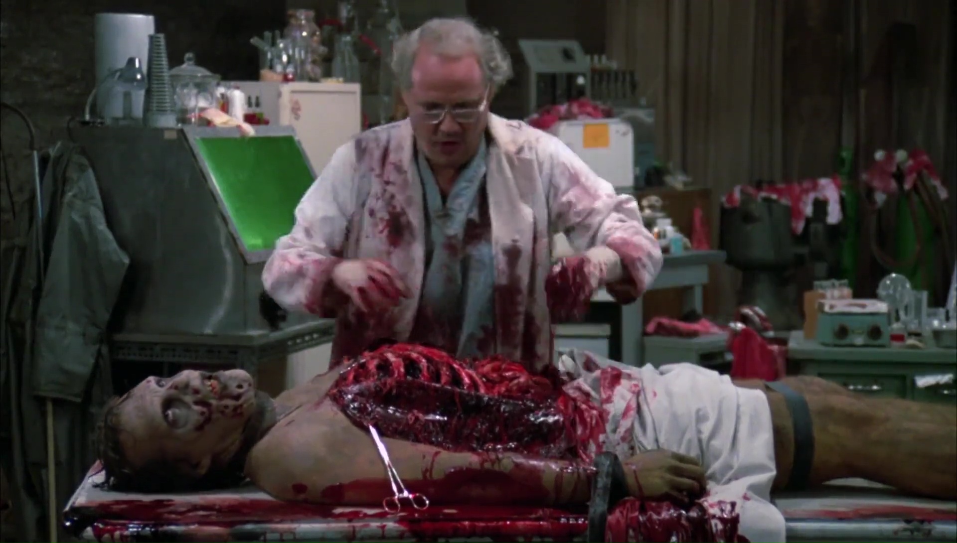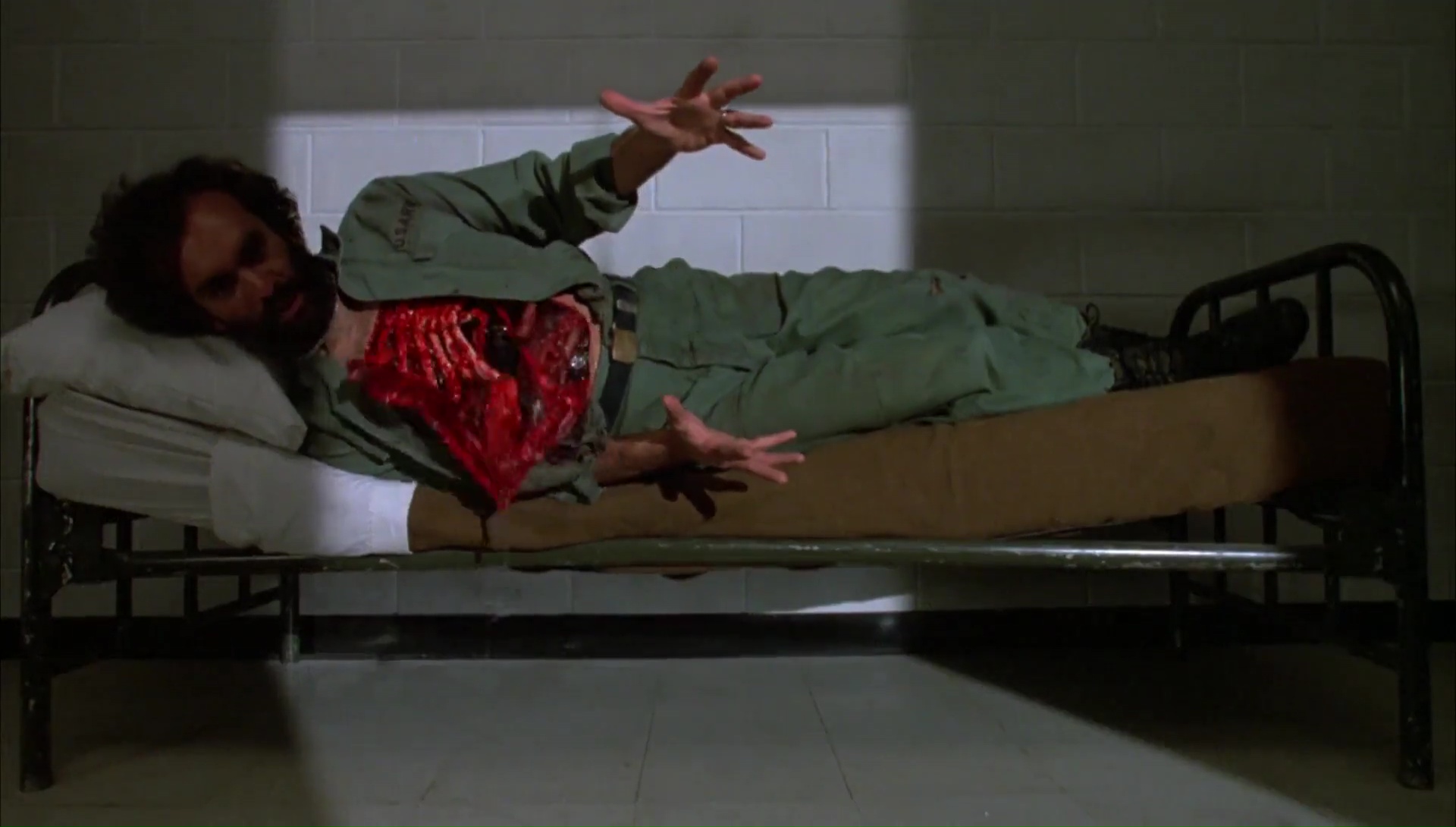 Le Jour des Morts-Vivants et moi, nous avons toujours eu une relation difficile qui date d’il y a des années. J’étais jeune, très jeune, trop jeune d’ailleurs, lorsque j’avais vu Zombie sur Canal +. Mes petits yeux innocents avaient été choqués, extasiés, j’avais adoré, c’était un film culte, un film puissant, hautement divertissant et portant un message sur notre société. Du pur Romero donc. Dans la foulée, j’avais pu me procurer en VHS ce fameux Jour des Morts-Vivants, espérant y trouver la même formule. Sauf que Le Jour des Morts-Vivants ne contient pas la même formule, il se base sur l’ambiance, sa première heure est très calme et se focalise avant tout sur les humains, deux groupes d’humains, des scientifiques et des militaires. Si bien que la jeune personne que j’étais avait été déçue, avais rangé la VHS et ne l’avais pas ressorti, restant sur un mauvais souvenir durant 20 ans. Le film me faisait peur. Mais face ces derniers temps à pas mal de gens qui m’encourageaient à retenter l’expérience, je me suis laissé tenté, pas plus tard qu’hier soir. Préjugés de côté, mon chat sur les genoux, les cigarettes à portée de main, et c’était parti pour Le Jour des Morts-Vivants, séance de rattrapage 20 ans après la première vision, passant de la qualité VHS en VF à la qualité Blu-Ray en VO par la même occasion. Je devais bien ça à Romero après tout qui nous a quitté récemment. Et en seulement une scène, je me suis dis que j’avais vraiment du passer à côté de quelque chose, que j’étais sans doute trop jeune pour le spectacle que Romero voulait nous proposer en 1985. Quelques notes de musique au synthé du fidèle John Harrison (qui réalisera plus tard Darkside produit et écrit par Romero), une ambiance froide avec une photographie grisâtre du tout aussi fidèle Michael Gornick (futur réalisateur de Creepshow 2, également produit par Romero), pour une scène de cauchemar qui représente parfaitement l’ambiance du métrage.