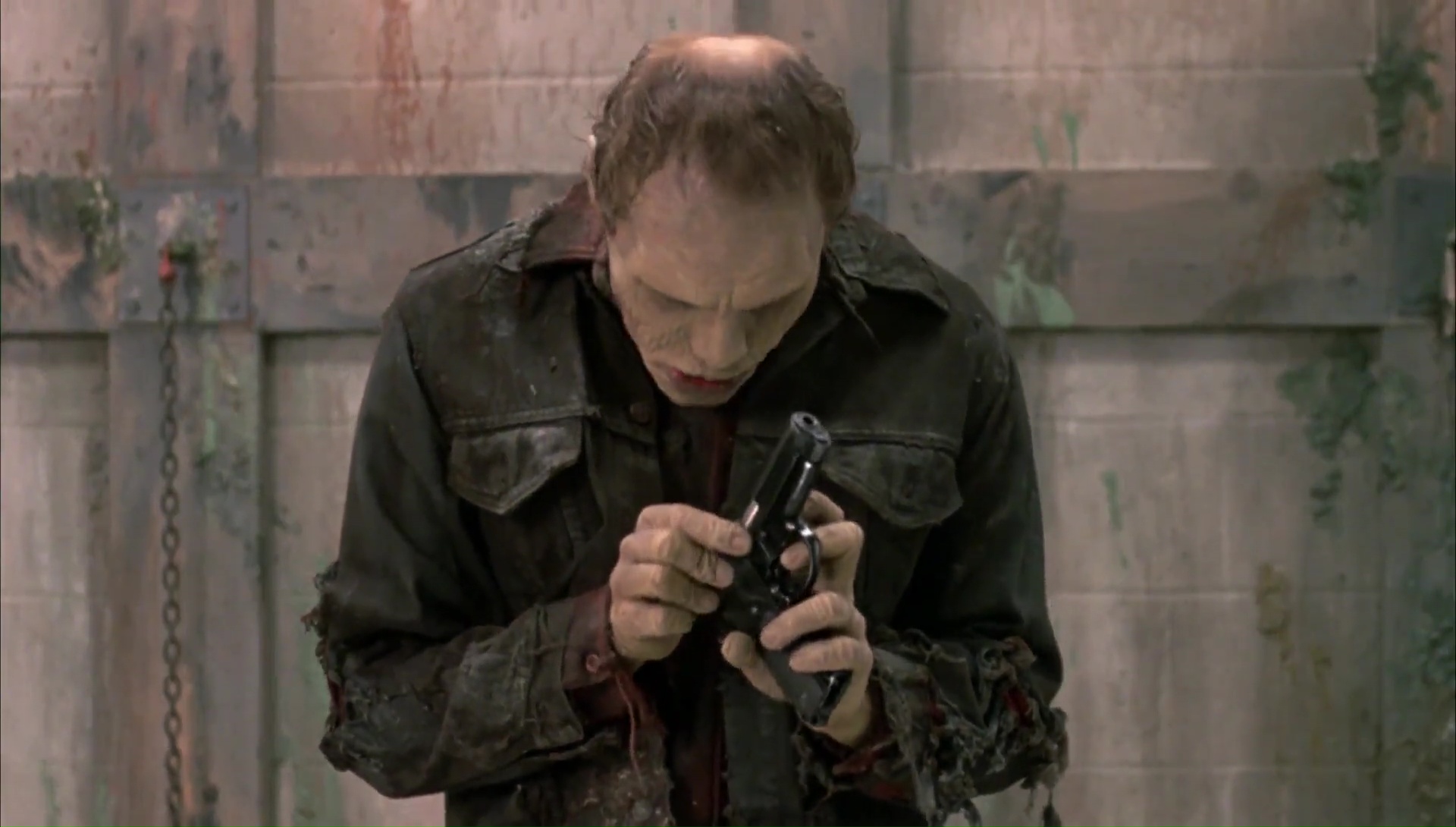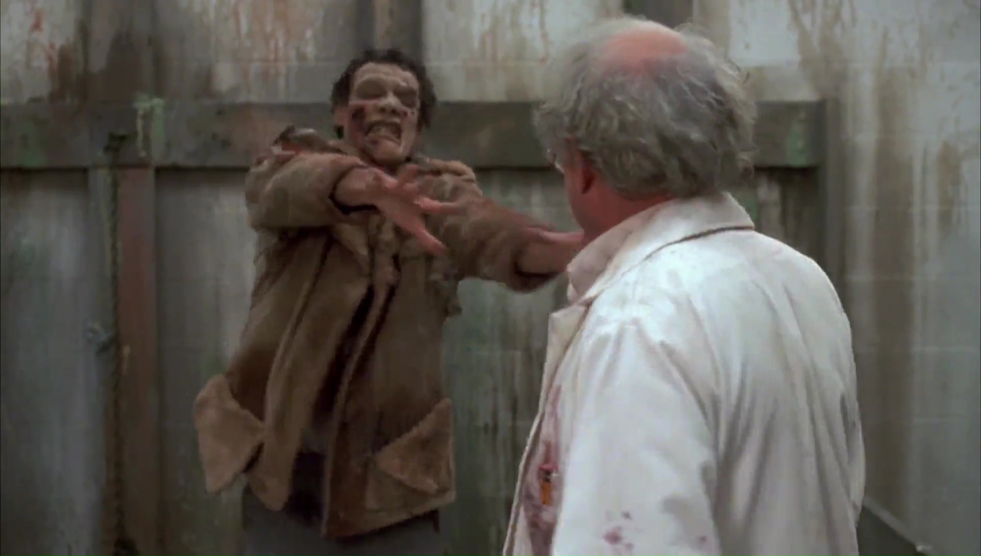 Le danger viendra donc fatalement encore et toujours de l’humain avant tout. La Nuit… nous montrait un petit groupe incapable de s’entendre et courant à sa perte, Zombie nous montrant un petit groupe qui s’autodétruisait petit à petit avant l’arrivée de pillards qui faisaient le reste du boulot. Et bien dans Le Jour… c’est un peu pareil, mais Romero prend son temps. Toute la première heure, à l’exception du zombie Bud sera dédiée aux humains. Romero accentue les caractéristiques de chacun des groupes, si bien que l’ensemble m’aura malgré tout parût légèrement cliché. Oui, les militaires sont stupides et préfèrent tirer, tandis que le groupe de scientifiques ne fait pas très attention et ils pensent à leurs expériences avant tout. À l’exception de notre héroïne bien entendu. Les humains sont destinés à se détruire face à leur incapacité à se comprendre, à s’expliquer, à vivre ensembles. Du coup, la quasi intégralité des personnages manquent de morale. Et parmi tout ça, il y a Bud, un zombie prisonnier qui va montrer des qualités humaines en apprenant petit à petit, en se servant d’objets, et même en faisant preuve de compassion et de reconnaissance.
