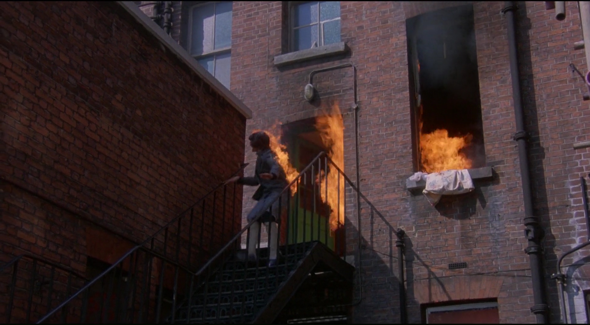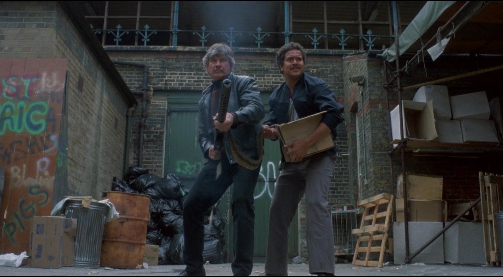 Car si Le Justicier de New York n’est pas oublié de nos jours, et a même de nombreux fans, voir plus de fans que le film original (oui oui, véridique apparemment), il le doit clairement et uniquement grâce à sa dernière demi-heure, ce moment jouissif totalement improbable faisant office de défouloir géant, et faisant monter le bodycount du film a plus de 80, ce qui n’est pas rien, quand on prend en compte que dans les premiers films, Bronson ne tuait jamais plus de quoi, 10 personnes. Ici, c’est carrément la guerre urbaine, on a l’impression de voir du Rambo, ou pour rester dans le même studio, du Chuck Norris, et du coup, Bronson et les autres habitants de l’immeuble qu’il tentait de protéger prennent les armes, et là ça ne plaisante plus. Ça fusille dans tous les sens, ça explose à coup de grenades, ça sort carrément la mitrailleuse de guerre, ça passe de rue en rue en faisant le vide. Si bien que le film aurait pu s’appeler Le Destructeur de New York (même si oui, tourné à Londres) que ça serait passé sans souci. Si la mitrailleuse taille XXL ne suffisait pas, Bronson nous sort carrément un bazooka sur la fin, rien que ça. Et vous savez c’est quoi le plus drôle ? C’est qu’il achète ses armes tout naturellement et se les fait… livrer par la poste, tout simplement, comme ça, même pas besoin de signature, le postier arrive, lui donne son paquet, il l’ouvre, oh tiens un bazooka. Ces moments improbables, ces autres moments d’une violence radicale et n’ayant d’autre but que d’assouvir les pulsions de… on ne sait pas trop en fait, et bien forcément, ça en fait un film bâtard, couillon même, mais que l’on regarde, comme fasciné par autant de violence, de meurtres, le tout sans prise de tête bien entendu. C’est improbable, totalement surréaliste, faisant office de défouloir qui ne veut pas s’arrêter, et finalement, n’a plus trop de sens, mais après tout, Bronson ayant déjà perdu sa femme dans le premier film puis sa fille dans le second, il ne fallait pas imaginer avoir un prétexte ici. Juste non, les choses vont mal, et comme il passe par là, il fait le ménage. Alors, ce n’est pas réellement bon, mais ça fait du bien !