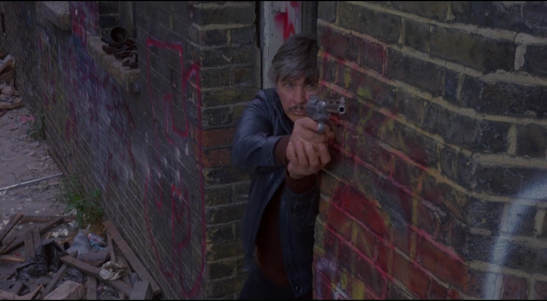 Alors oui, au début, on a l’impression et presque l’envie de prendre le tout au sérieux, car forcément, ça commence doucement. Quelques passages à tabac, Bronson qui improvise des pièges quelques années avant Maman j’ai Raté l’Avion. Mais on se rend aussi compte rapidement que le film fait l’apologie de la violence pour régler la violence, sans se prendre la tête. Ainsi, Bronson se fait voler un appareil photo dans la rue ? Pas de soucis, un magnum, un tir dans le dos en pleine rue, de jour devant des dizaines de témoins et… et non, tout le monde applaudit Bronson, le voit comme un héros et lui demande de l’aide pour exterminer cette vermine qui pollue les rues. Même cas de figure alors qu’il mange tranquille, mais que deux voyous tentent de voler sa voiture. Il arrive, s’exclame que c’est sa voiture, avant de tuer froidement les deux voyous avant de repartir finir sa soupe comme si de rien n’était. La réinsertion sociale, il faut croire que Charles Bronson ne connait pas ces mots. Et tant mieux. Car soyons honnête, si Le Justicier de New York n’est pas un film subtil, qu’il s’avère parfois bien stupide, qu’il est violent et racoleur et fait donc appel aux plus bas instincts des spectateurs, et bien il faut le prendre comme tel. Une série B bien bourrine qui ne se prend jamais au sérieux, et n’a pas de prétentions, autre que de divertir en proposant finalement au public ce qu’il voulait voir en entrant dans la salle. Des gangs (peu crédibles) dans un New York (le film fut tourné à Londres) qui se font défoncer par un Charles Bronson (vieillissant) qui n’en a clairement plus rien à faire, et n’hésite pas à faire parler la poudre. Si pendant une heure, le film prend des allures de film de vigilante un peu stupide et bourrin, il se suit malgré tout avec plaisir, surtout que le film n’essaye même plus de développer à côté des personnages secondaires, une tension ou quoi que ce soit. Non, il y a juste des méchants dans les rues, ils font des choses très méchantes, et très souvent, Bronson est là l’instant d’après pour leur donner sa justice divine, à coup de magnum, de couteaux, ou plus tard, avec une artillerie beaucoup plus lourde.