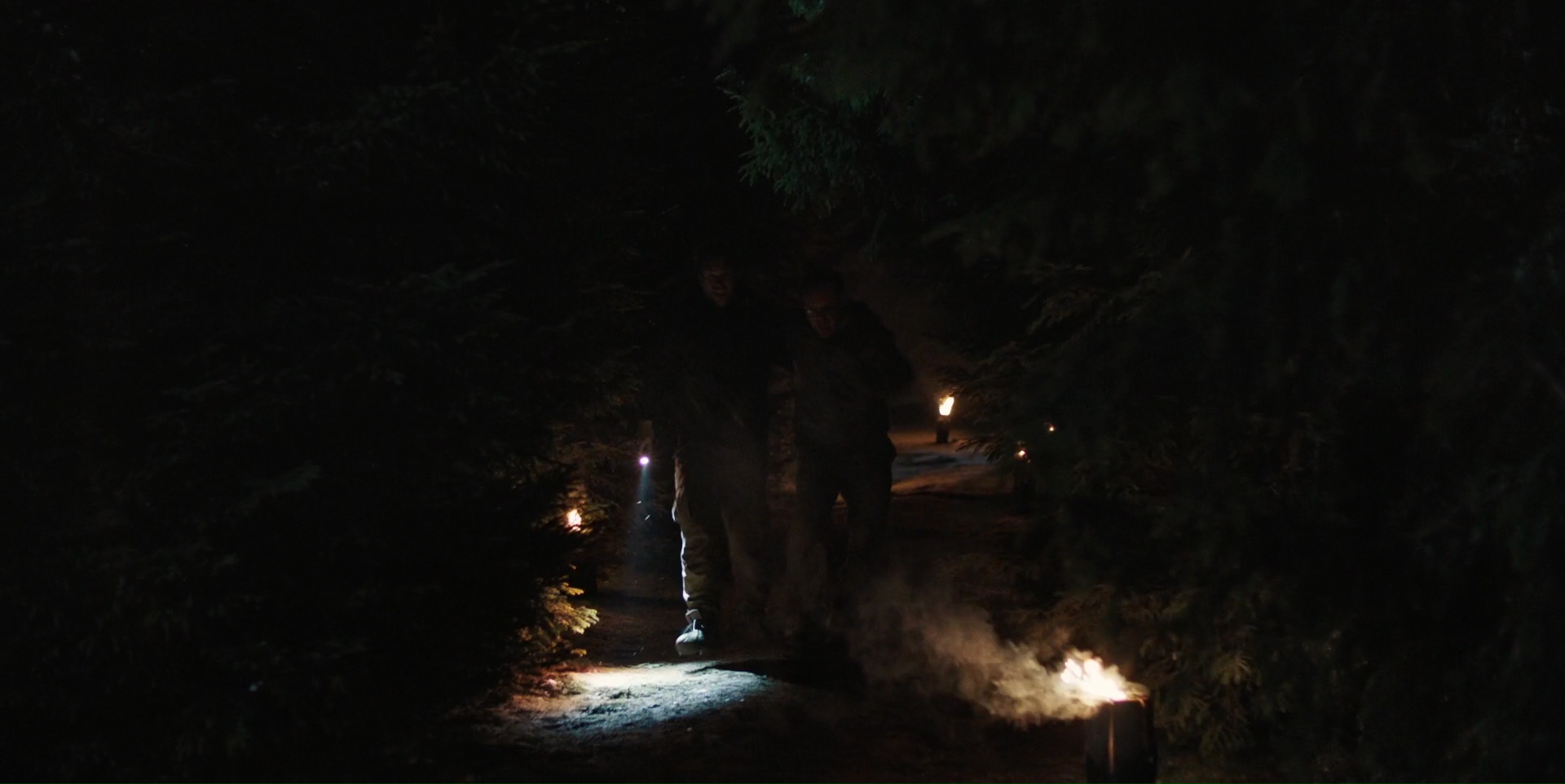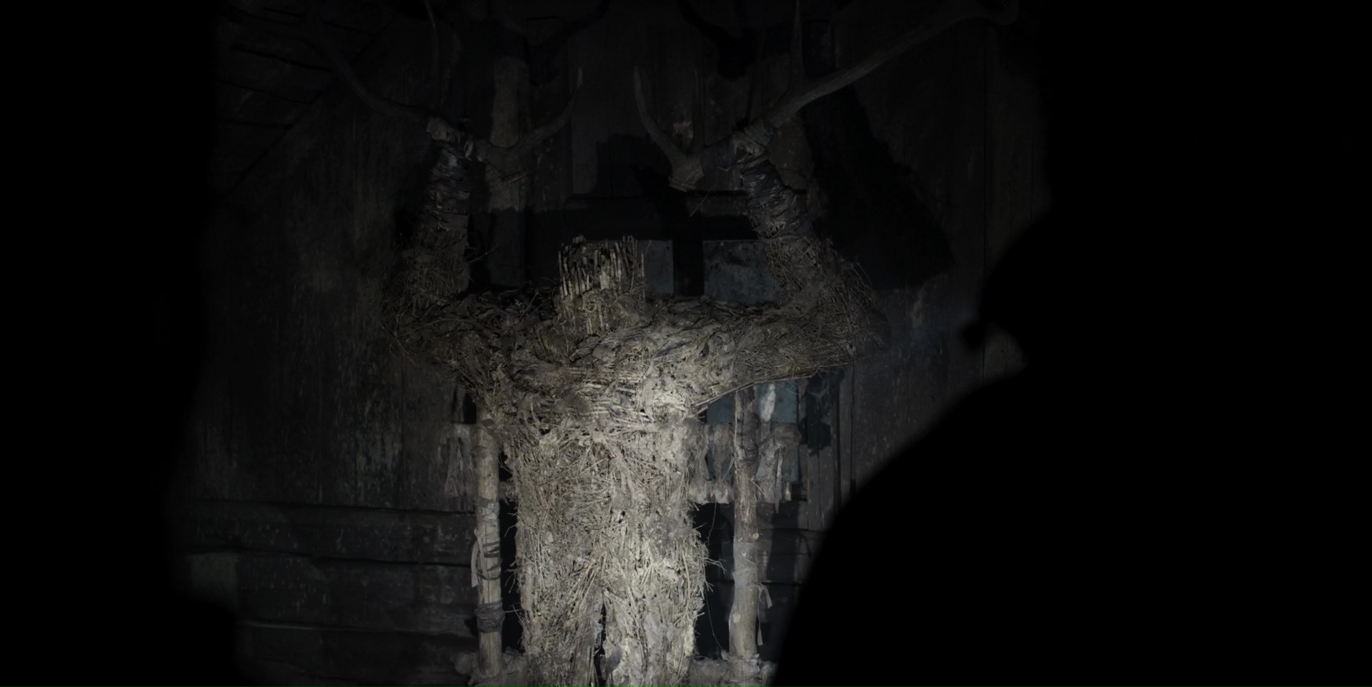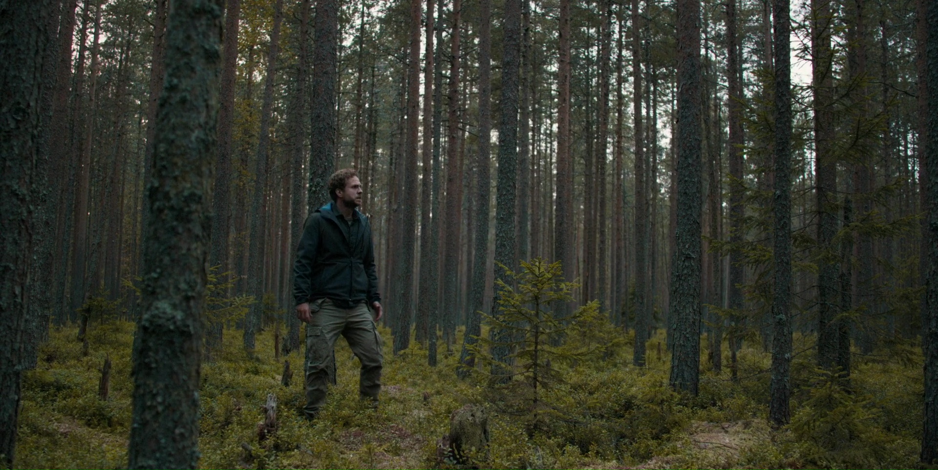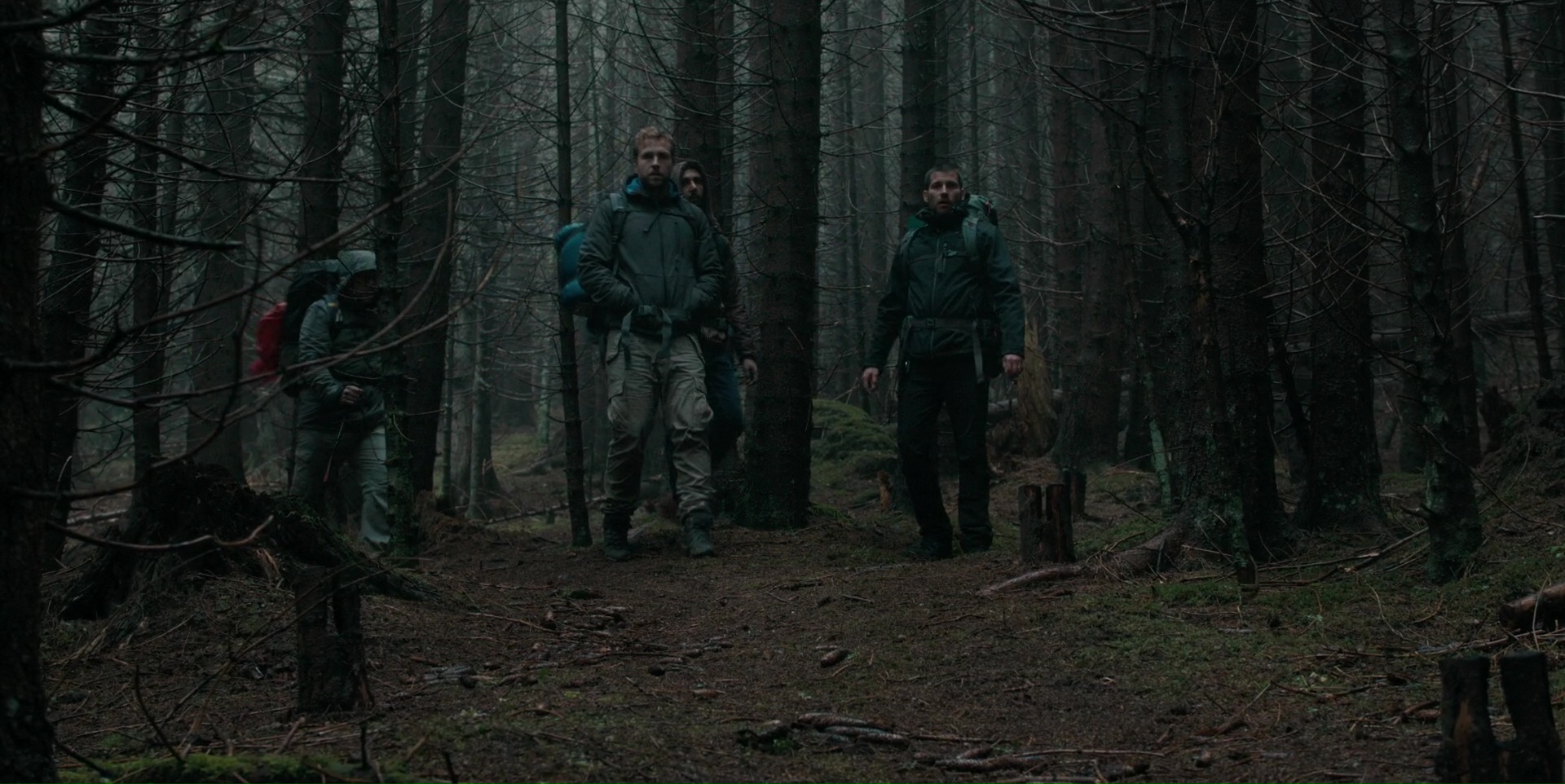 Mais il sait surtout prendre son temps pour installer une menace, pour nous faire douter, et mettre nos sens en éveil. C’est en ce sens que Le Rituel est une réussite dans un premier temps. En parti, car finalement, la destruction de ce groupe d’amis qui n’en est pas vraiment un, calcage masculin de The Descent, fonctionne plutôt bien également, même s’il manque clairement de surprises. Mais c’est dans la gestion de son environnement donc que le réalisateur gagne des points. Il suffit de nous placer un cadavre animal dans la forêt et deux trois sons étranges et menaçants pour que l’on sache que quelque chose se cache là. Et à partir de là, la mise en scène fait le reste du travail. Les plans lents et atmosphérique sur la forêt, les zooms extrêmement lents, forçant notre œil à chercher où pourrait être la menace, en vain puisque l’on ne sait même pas quoi chercher réellement. C’est là la grande force de Le Rituel, et ce qui m’aura fait accrocher. On en prend plein les yeux, et les scènes de tension fonctionnent. À plusieurs reprises, je me serais surpris à plisser les yeux pour essayer de trouver l’élément perturbateur dans cette forêt silencieuse et immobile, cherchant les zones d’ombres, essayant de me focaliser à côté de l’endroit où l’angle de caméra me suggérait de regarder. Et pourtant, je me suis fait avoir durant la première heure.