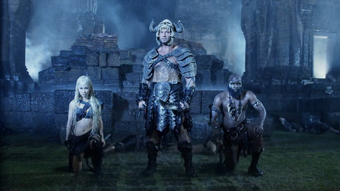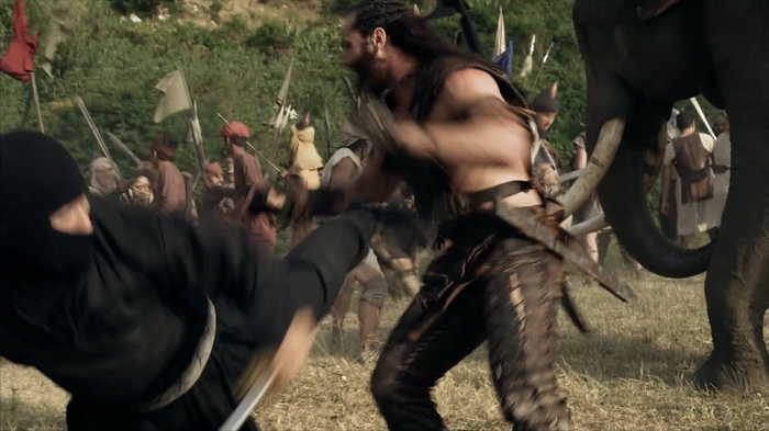 Certaines scènes d’action tiennent plus de Bud Spencer et Terence Hill qu’autre chose, avec des échanges de bourre-pif pas des plus recherchés. A toi, à moi, à toi, à moi, et à la fin on finit avec une petite blagounette. D’autres sont un peu plus intéressantes. Elles sont mal filmées, mal montées, avec un surdécoupage qui pourrait vous abimer la rétine, mais c’est tellement le bordel à l’écran, avec des soldats, des éléphants, des bannières en veux-tu en voilà, des costumes de toutes les couleurs, des armes de siège, que ce bordel devient parfois assez jouissif. Et il y a même des ninjas et des guerriers magiques sortis d’un livre des morts. Ça se donne un côté impressionnant avec des éléphants et plein de figurants, mais entre les costumes foireux et les nombreux drapeaux faits avec tous les bouts de tissus qu’ils ont trouvés en mode OSEF la cohérence, c’est plus ridicule qu’autre chose et on est rapidement perdu. Qui est contre qui dans tout ce bordel ? La mise en scène frôle souvent le n’importe quoi et il semblerait que Roel Reiné n’en avait rien à foutre lui non plus, jouant avec sa caméra un peu n’importe comment jusque dans les scènes de dialogues. Les CGI sont du même niveau que ceux du 2ème film, c’est-à-dire ultra voyants, avec des décors qui sonnent souvent très faux dès qu’il faut représenter le gigantisme de certains paysages. Mais heureusement, ils ne sont que peu utilisés (à l’inverse du 2ème film). Quand on n’a pas de pognon, on évite de montrer la misère. En soi, Le Roi Scorpion 3 est tout aussi nul que son prédécesseur mais il a l’avantage d’être très fun avec son avalanche d’action, son avalanche de n’importe quoi au nom du divertissement. Difficile de s’ennuyer, ce qui en fait un bon moment de détente pour qui a envie de se marrer devant un mauvais film sympathique. A voir avec de la bière, de la pizza, et des potes.