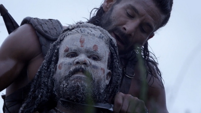 Le casting est moins prestigieux que les opus précédents et leurs seconds rôles de luxe, mais on retrouve malgré tout quelques têtes connues comme Peter Mensah (300, Jason X) ou le catcheur devenu acteur (une constante de la saga) Nathan Jones (L’Honneur du Dragon, Mad Max Fury Road) grimé en golem. Ce dernier est d’ailleurs plutôt impressionnant à regarder et on est content de voir qu’ils aient pris la peine de le réaliser en practical plutôt qu’en image de synthèse. Le résultat est sans précédent, et il est peut-être le meilleur personnage de toute la saga. Le practical, on le retrouve également dans les décors puisque le film évite autant que possible les fonds verts. Le rendu de certains paysages désolés fait clairement le job, au point qu’ils en deviennent parfois inquiétants. La photographie de Hein de Vos s’en sort également étonnement bien pour ce genre de production. Les scènes de combats sont en nombre suffisant et au final pas trop mal fichues, bien que certains ralentis putassiers auraient pu être évités. Le montage laisse parfois à désirer mais les affrontements restent néanmoins lisibles et compréhensibles. Bon, il faut avouer que certaines bastons ne semblent être là que justement pour amener de la baston et ne font en rien avancer quoi que ce soit au niveau de l’intrigue, mais l’ensemble est décent, avec des acteurs / cascadeurs qui sont crédibles. On n’en attendait pas moins de ce genre de divertissement un peu bas du front et on est content qu’il nous délivre bien la marchandise attendue à l’inverse de certains des opus précédents. Parce qu’autant les 3ème et 4ème films étaient sympathiques car complètement à la ramasse mais généreux en n’importe quoi, autant ce Roi Scorpion 5 essaie réellement de faire les choses bien et y arrive en partie.