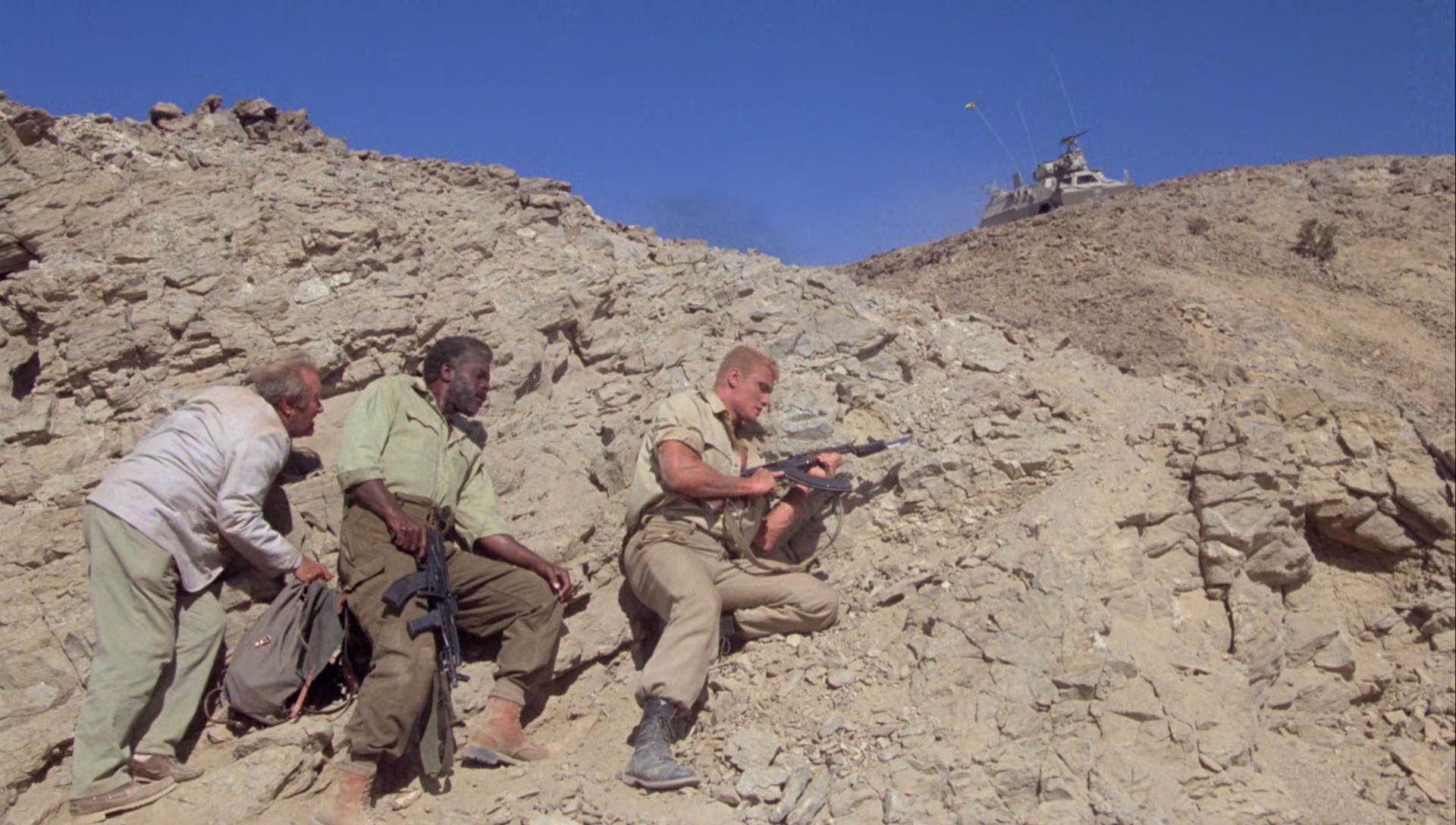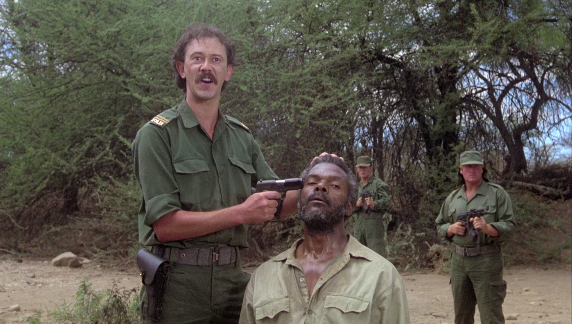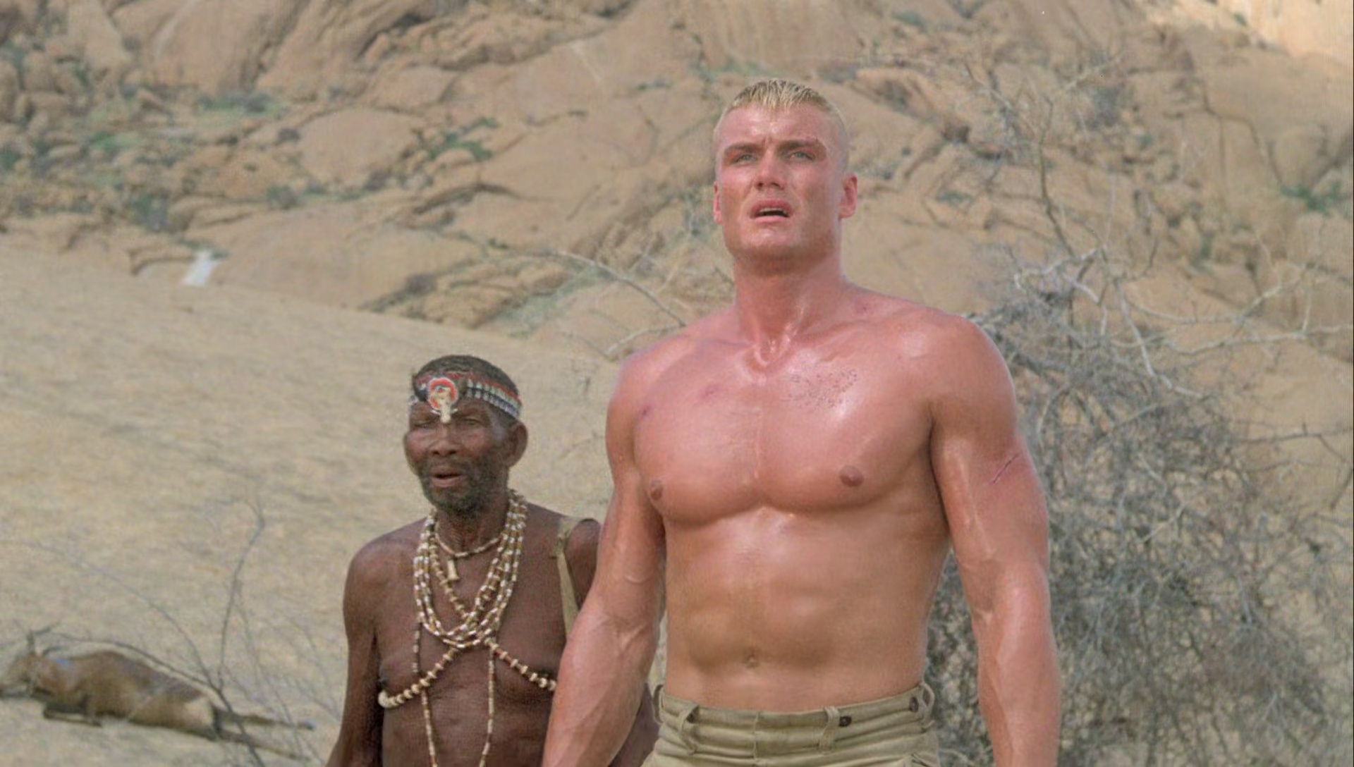 Le Scorpion Rouge, le produit fini, n’a certainement pas d’autres buts que d’envoyer du paté, que de tout faire exploser, de montrer que les Russes, ils sont vilains, et que quand l’un des leur se met à réfléchir, il change de camp pour aider les rebelles à repousser l’envahisseur soviétique, qui est aidé par les méchants Cubains. Ah ça, c’est primaire, simpliste, et il ne fallait pas en attendre plus, puisqu’en 1988, le mur de Berlin n’était pas encore tombé, c’était encore la guerre froide, et du coup au cinéma, l’ennemi principal des Américains était les Soviétiques. Il ne faut absolument pas chercher plus loin. Le Scorpion Rouge sent bon les années 80, l’action réactionnaire, les explosions, la poudre, le tout servi par un casting intégralement masculin (faut pas pousser hein, faut du muscle). Dolph Lundgren oui, avec à ses côtés M. Emmet Walsh comme précisé plus haut, mais aussi Al White (Leprechaun 2, Retour vers le Futur 2), T.P. McKenna (Les Chiens de Pailleà, Carmen Agenziano (Anges et Démons) et cette bonne tête de la série B, Brion James (Tango et Cash, Blade Runner, 48 Heures, Enemy Mine, House 3 et j’en passe). Ce brave Dolph, enfin, ce brave Nikolai Petrovitch Radchenko comme on l’appelle, est envoyé en Afrique pour éliminer le chef des rebelles. Il sympathise avec un de ses lieutenants et un journaliste Américain, les aide à s’évader en espérant se rapprocher de sa cible. Manque de bol, ses intentions sont démasquées, l’homme est retrouvé par les siens, qui ne tolèrent pas l’échec, et ce qui amène la classique scène de torture fréquente des films de guerre (scène censurée à l’époque), avant que ce pauvre Nikolai comprenne qu’il est dans le mauvais camp, et s’échappe pour aider les rebelles à vaincre l’oppression et l’envahisseur, à grand coup de mitrailleuse, de coups de pieds dans la face, de tank, hélicoptères, et de musique rock bien typées années 80.